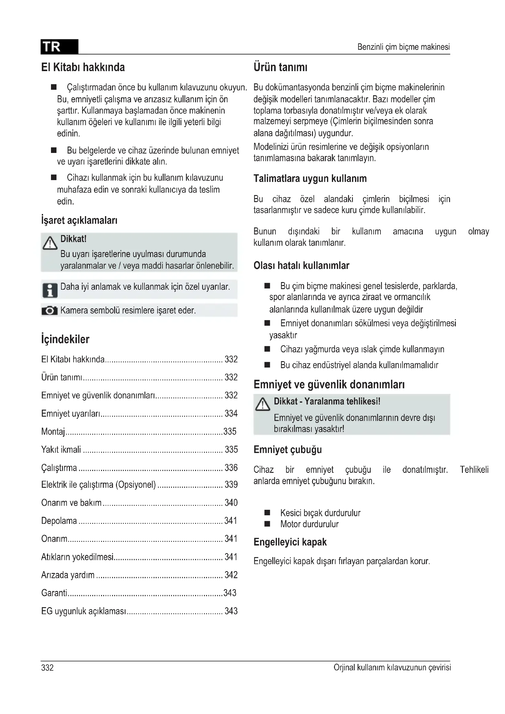 - EGuygunlukaçıklaması El Kitabı hakkında Çalıştırmadanöncebukullanımkılavuzunuokuyun. Bu,emniyetliçalışmavearızasızkullanımiçinön şarttır.Kullanmayabaşlamadanöncemakinenin kullanımöğelerivekullanımıileilgiliyeterlibilgi edinin. Bu belgelerde ve cihaz üzerinde bulunan emniyet veuyarıişaretlerinidikkatealın. Cihazıkullanmakiçinbukullanımkılavuzunu muhafazaedinvesonrakikullanıcıyadateslim edin. İşaret açıklamaları Dikkat! Buuyarıişaretlerineuyulmasıdurumunda yaralanmalar ve / veya maddi hasarlar önlenebilir. Dahaiyianlamakvekullanmakiçinözeluyarılar. Kamerasembolüresimlereişareteder. Ürün tanımı Bu dokümantasyonda benzinli çim biçme makinelerinin değişikmodelleritanımlanacaktır.Bazımodellerçim toplamatorbasıyladonatılmıştırve/veyaekolarak malzemeyi serpmeye (Çimlerin biçilmesinden sonra alanadağıtılması)uygundur. Modeliniziürünresimlerinevedeğişikopsiyonların tanımlamasınabakaraktanımlayın. Talimatlara uygun kullanım Bu cihaz özel alandaki çimlerin biçilmesi için tasarlanmıştırvesadecekuruçimdekullanılabilir. Bunun dışındaki bir kullanım amacına uygun olmayan kullanımolaraktanımlanır. Olası hatalı kullanımlar Bu çim biçme makinesi genel tesislerde, parklarda, sporalanlarındaveayrıcaziraatveormancılık alanlarındakullanılmaküzereuygundeğildir Emniyetdonanımlarısökülmesiveyadeğiştirilmesi yasaktır Cihazıyağmurdaveyaıslakçimdekullanmayın Bucihazendüstriyelalandakullanılmamalıdır Emniyet ve güvenlik donanımları Dikkat - Yaralanma tehlikesi! Emniyetvegüvenlikdonanımlarınındevredışı bırakılmasıyasaktır! Emniyet çubuğu Cihaz bir emniyet çubuğu ile donatılmıştır. Tehlikeli anlardaemniyetçubuğunubırakın. Kesicibıçakdurdurulur Motor durdurulur Engelleyici kapak Engelleyicikapakdışarıfırlayanparçalardankorur.TR p. 343