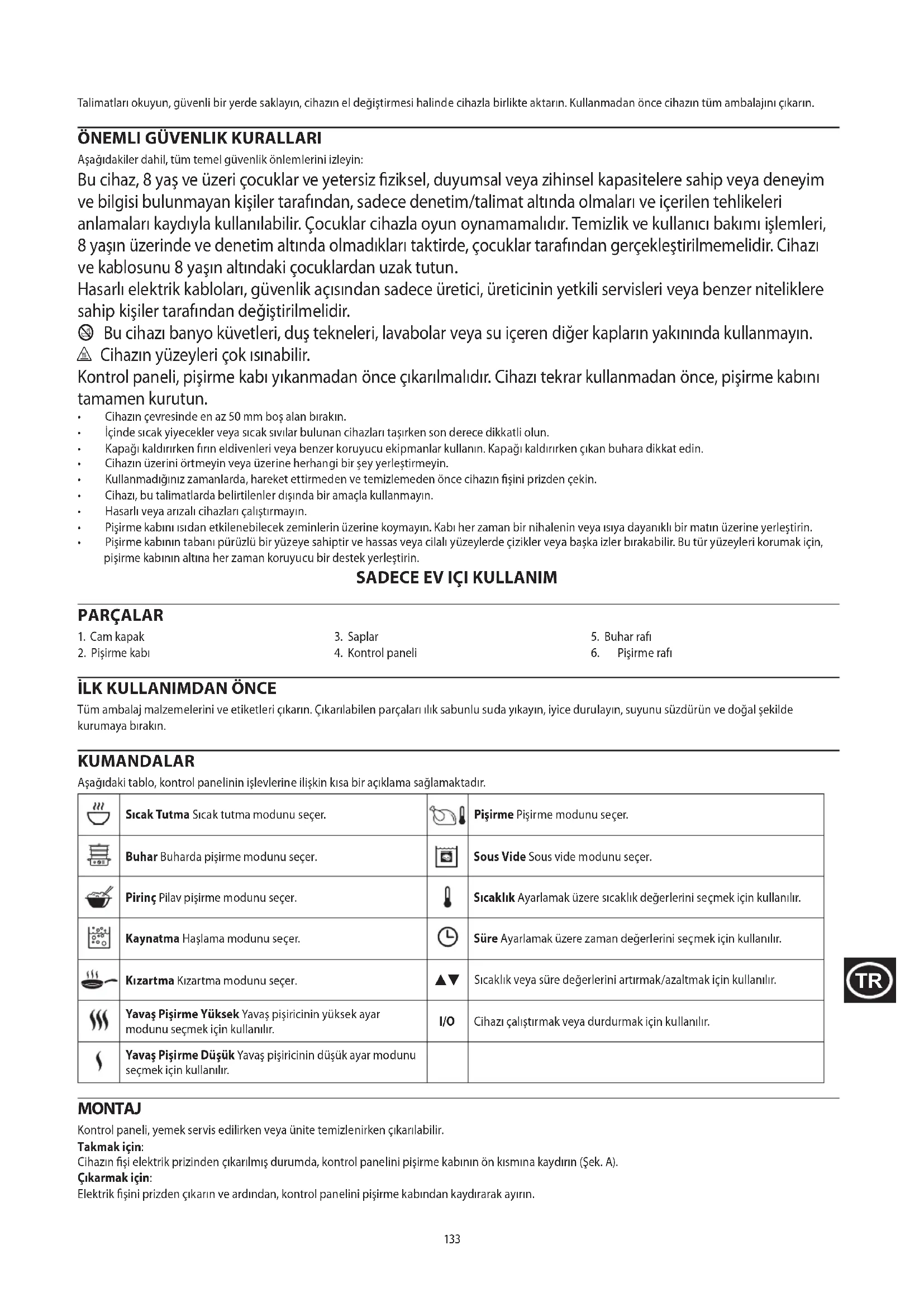 - Pişirme kabı ve malzemeler SICAK olacağından, pişirme kabını taşırken son derece dikkatli olun! Mutlaka taşıma saplarını ve gerekiyorsa fırın eldivenlerini kullanın.139