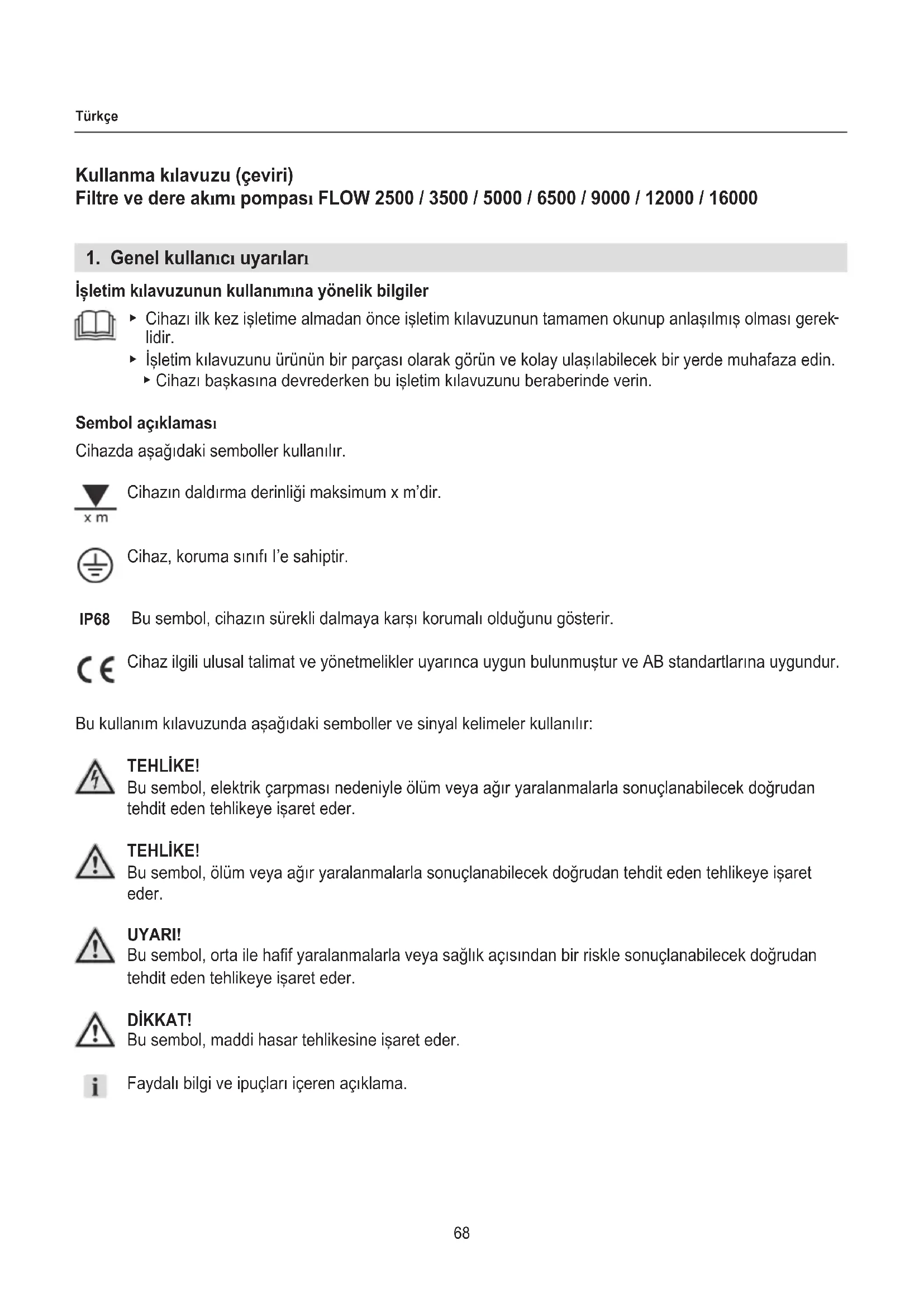 lidir. ▶ İşletim kılavuzunu ürünün bir parçası olarak görün ve kolay ulaşılabilecek bir yerde muhafaza edin. ▶ Cihazı başkasına devrederken bu işletim kılavuzunu beraberinde verin. Sembol açıklaması Cihazda aşağıdaki semboller kullanılır. Cihazın daldırma derinliği maksimum x m’dir. Cihaz, koruma sınıfı I’e sahiptir. Bu sembol, cihazın sürekli dalmaya karşı korumalı olduğunu gösterir. Cihaz ilgili ulusal talimat ve yönetmelikler uyarınca uygun bulunmuştur ve AB standartlarına uygundur. Bu kullanım kılavuzunda aşağıdaki semboller ve sinyal kelimeler kullanılır: TEHLİKE! Bu sembol, elektrik çarpması nedeniyle ölüm veya ağır yaralanmalarla sonuçlanabilecek doğrudan tehdit eden tehlikeye işaret eder. TEHLİKE! Bu sembol, ölüm veya ağır yaralanmalarla sonuçlanabilecek doğrudan tehdit eden tehlikeye işaret eder. UYARI! Bu sembol, orta ile haf yaralanmalarla veya sağlık açısından bir riskle sonuçlanabilecek doğrudan tehdit eden tehlikeye işaret eder. DİKKAT! Bu sembol, maddi hasar tehlikesine işaret eder. Faydalı bilgi ve ipuçları içeren açıklama.