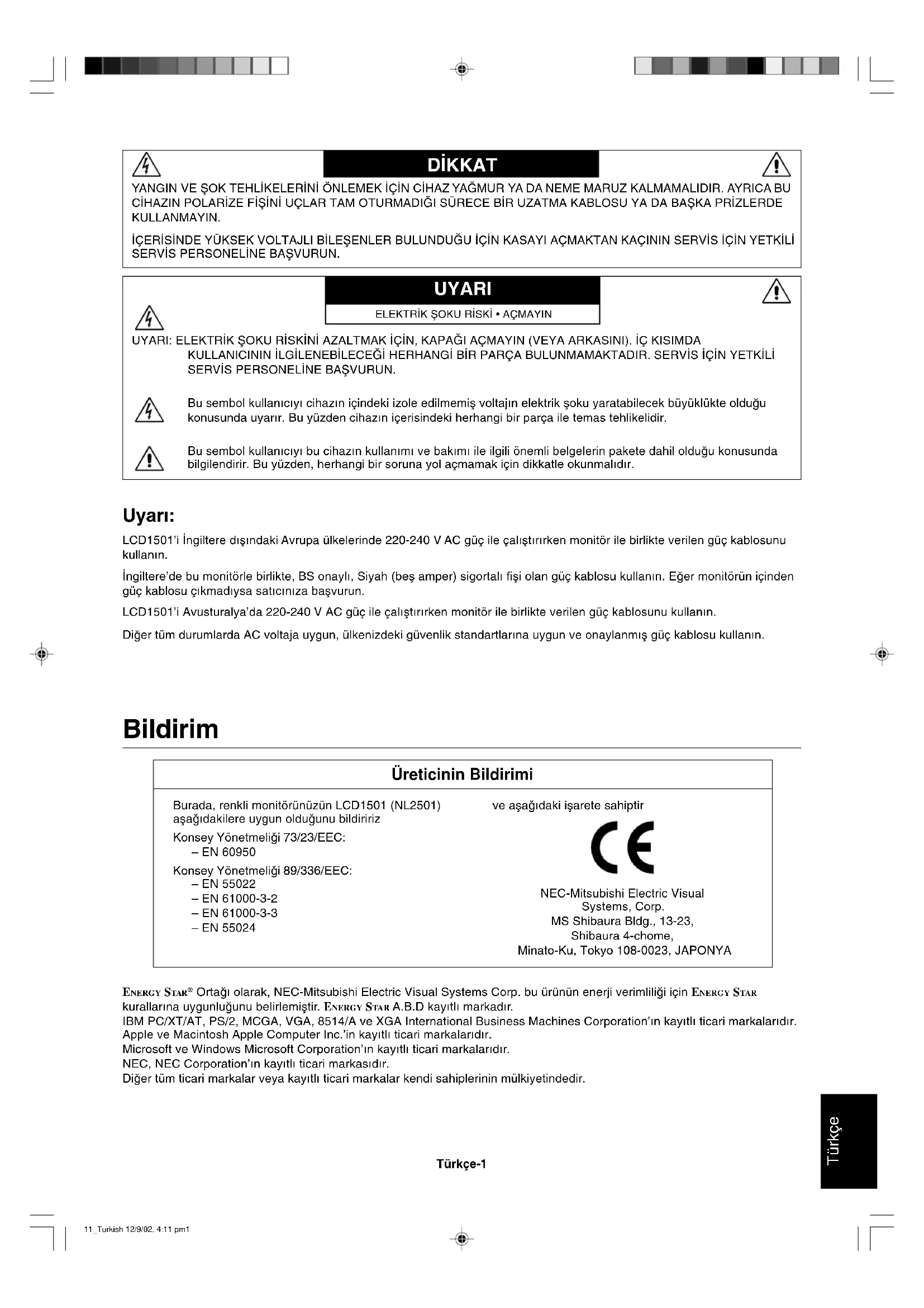 Ortaπ∂ olarak, NEC-Mitsubishi Electric Visual Systems Corp. bu ürünün enerji verimliliπi için ENERGY STAR kurallar∂na uygunluπunu belirlemiµtir. ENERGY STAR A.B.D kay∂tl∂ markad∂r. IBM PC/XT/AT, PS/2, MCGA, VGA, 8514/A ve XGA International Business Machines Corporation’∂n kay∂tl∂ ticari markalar∂d∂r. Apple ve Macintosh Apple Computer Inc.’in kay∂tl∂ ticari markalar∂d∂r. Microsoft ve Windows Microsoft Corporation’∂n kay∂tl∂ ticari markalar∂d∂r. NEC, NEC Corporation’∂n kay∂tl∂ ticari markas∂d∂r. Diπer tüm ticari markalar veya kay∂tl∂ ticari markalar kendi sahiplerinin mülkiyetindedir. Burada, renkli monitörünüzün LCD1501 (NL2501) aµa©∂dakilere uygun oldu©unu bildiririz Konsey Yönetmeli©i 73/23/EEC: – EN 60950 Konsey Yönetmeli©i 89/336/EEC: – EN 55022 – EN 61000-3-2 – EN 61000-3-3 – EN 55024 ve aµa©∂daki iµarete sahiptir NEC-Mitsubishi Electric Visual Systems, Corp. MS Shibaura Bldg., 13-23, Shibaura 4-chome, Minato-Ku, Tokyo 108-0023, JAPONYA Uyar∂: LCD1501’i ∑ngiltere d∂µ∂ndaki Avrupa ülkelerinde 220-240 V AC güç ile çal∂µt∂r∂rken monitör ile birlikte verilen güç kablosunu kullan∂n. ∑ngiltere’de bu monitörle birlikte, BS onayl∂, Siyah (beµ amper) sigortal∂ fiµi olan güç kablosu kullan∂n. Eπer monitörün içinden güç kablosu ç∂kmad∂ysa sat∂c∂n∂za baµvurun. LCD1501’i Avusturalya’da 220-240 V AC güç ile çal∂µt∂r∂rken monitör ile birlikte verilen güç kablosunu kullan∂n. Diπer tüm durumlarda AC voltaja uygun, ülkenizdeki güvenlik standartlar∂na uygun ve onaylanm∂µ güç kablosu kullan∂n. 11_Turkish 12/9/02, 4:11 pm1Türkçe-2 ∑çindekiler Yeni NEC LCD monitör kutusunuz* aµa©∂dakileri içermelidir: