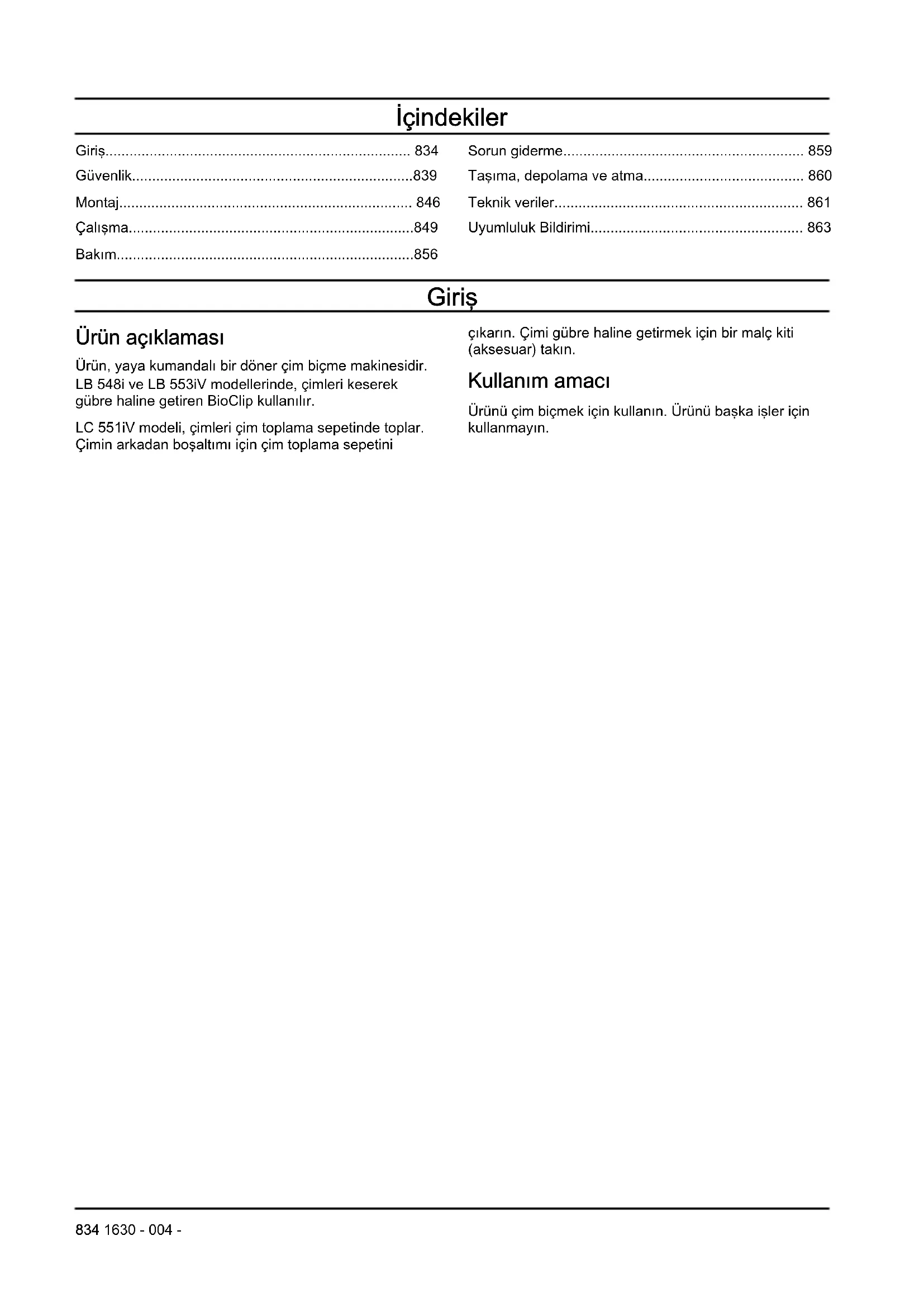 - Uyumluluk Bildirimi Giriş Ürün açıklaması Ürün, yaya kumandalı bir döner çim biçme makinesidir. LB 548i ve LB553iV modellerinde, çimleri keserek gübre haline getiren BioClip kullanılır. LC551iV modeli, çimleri çim toplama sepetinde toplar. Çimin arkadan boşaltımı için çim toplama sepetini çıkarın. Çimi gübre haline getirmek için bir malç kiti (aksesuar) takın. Kullanım amacı Ürünü çim biçmek için kullanın. Ürünü başka işler için kullanmayın. 834 1630 - 004 -Ürüne genel bakış (LB548i, LC551iV) LB 548i LC 551iV p. 863