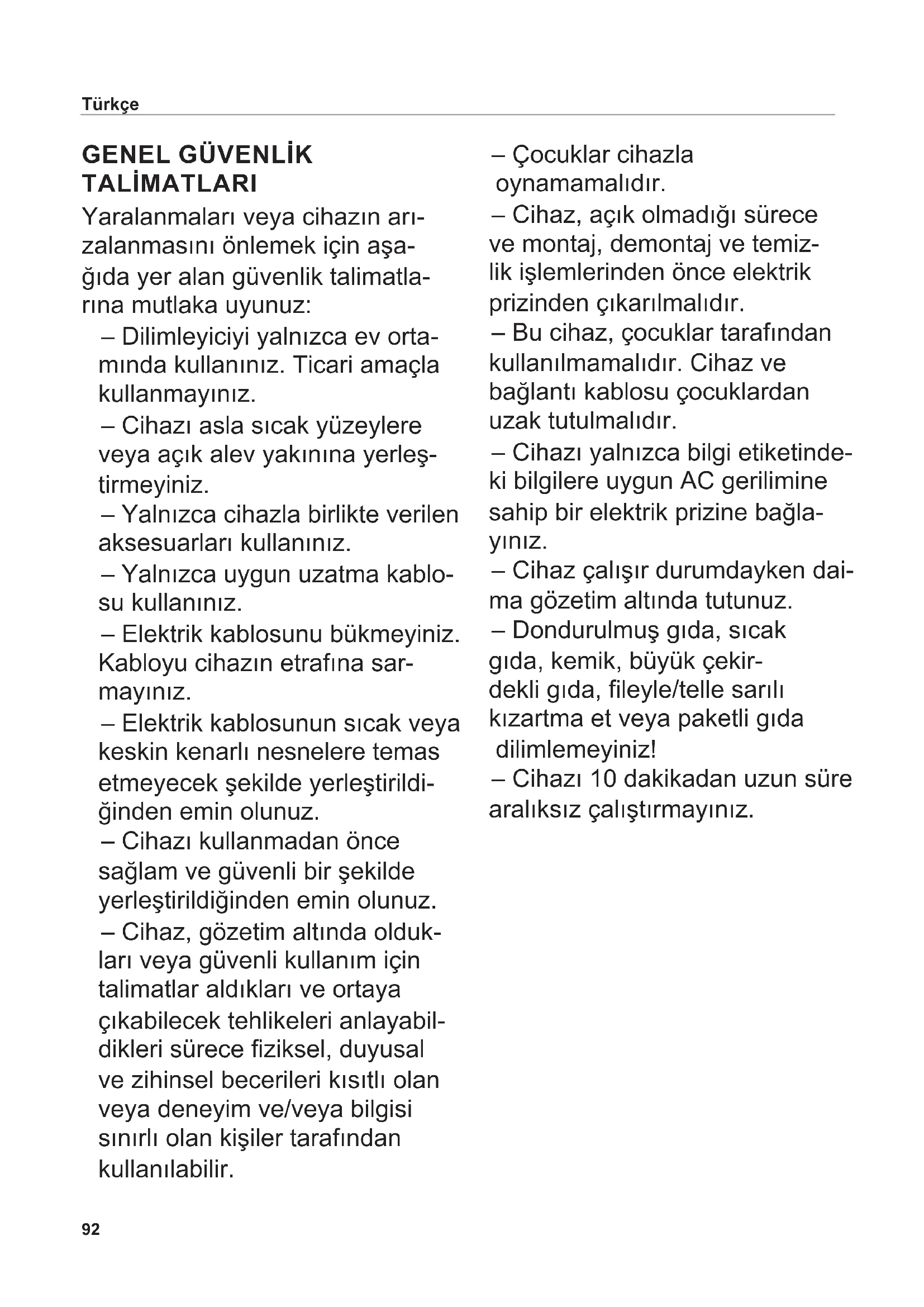 TALİMATLARI Yaralanmaları veya cihazın arı- zalanmasını önlemek için aşa- ğıda yer alan güvenlik talimatla- rına mutlaka uyunuz: – Dilimleyiciyi yalnızca ev orta- mında kullanınız. Ticari amaçla kullanmayınız. – Cihazı asla sıcak yüzeylere veya açık alev yakınına yerleş- tirmeyiniz. – Yalnızca cihazla birlikte verilen aksesuarları kullanınız. – Yalnızca uygun uzatma kablo- su kullanınız. – Elektrik kablosunu bükmeyiniz. Kabloyu cihazın etrafına sar- mayınız. – Elektrik kablosunun sıcak veya keskin kenarlı nesnelere temas etmeyecek şekilde yerleştirildi- ğinden emin olunuz. – Cihazı kullanmadan önce sağlam ve güvenli bir şekilde yerleştirildiğinden emin olunuz. – Cihaz, gözetim altında olduk- ları veya güvenli kullanım için talimatlar aldıkları ve ortaya çıkabilecek tehlikeleri anlayabil- dikleri sürece fiziksel, duyusal ve zihinsel becerileri kısıtlı olan veya deneyim ve/veya bilgisi sınırlı olan kişiler tarafından kullanılabilir. – Çocuklar cihazla oynamamalıdır. – Cihaz, açık olmadığı sürece ve montaj, demontaj ve temiz- lik işlemlerinden önce elektrik prizinden çıkarılmalıdır. – Bu cihaz, çocuklar tarafından kullanılmamalıdır. Cihaz ve bağlantı kablosu çocuklardan uzak tutulmalıdır. – Cihazı yalnızca bilgi etiketinde- ki bilgilere uygun AC gerilimine sahip bir elektrik prizine bağla- yınız. – Cihaz çalışır durumdayken dai- ma gözetim altında tutunuz. – Dondurulmuş gıda, sıcak gıda, kemik, büyük çekir- dekli gıda, fileyle/telle sarılı kızartma et veya paketli gıda dilimlemeyiniz! – Cihazı 10 dakikadan uzun süre aralıksız çalıştırmayınız. Türkçe93