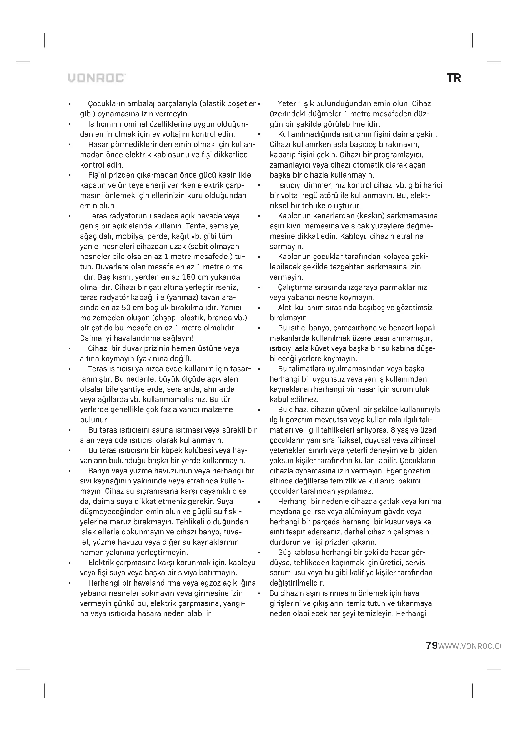 - Bu teras ısıtıcısını sauna ısıtması veya sürekli bir alan veya oda ısıtıcısı olarak kullanmayın.