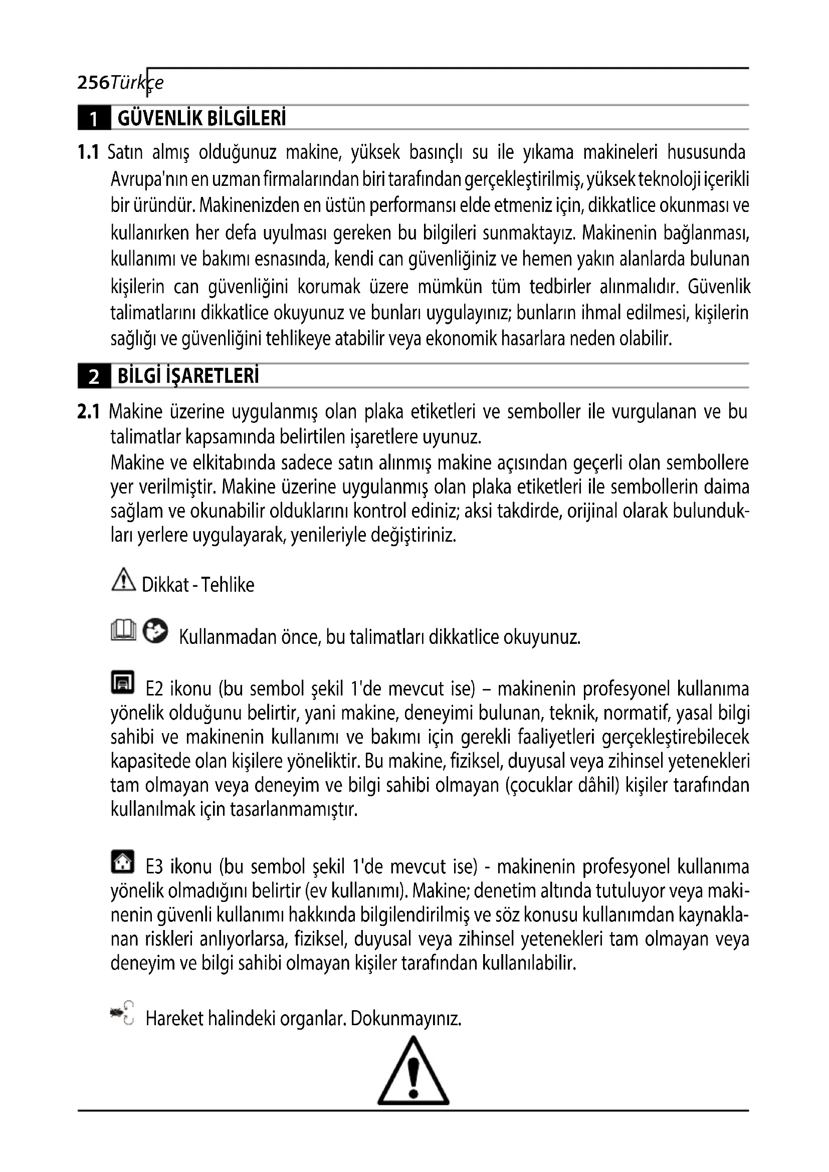 ları yerlere uygulayarak, yenileriyle değiştiriniz. Dikkat - Tehlike Kullanmadan önce, bu talimatları dikkatlice okuyunuz. E2 ikonu (bu sembol şekil 1'de mevcut ise) – makinenin profesyonel kullanıma yönelik olduğunu belirtir, yani makine, deneyimi bulunan, teknik, normatif, yasal bilgi sahibi ve makinenin kullanımı ve bakımı için gerekli faaliyetleri gerçekleştirebilecek kapasitede olan kişilere yöneliktir. Bu makine, fiziksel, duyusal veya zihinsel yetenekleri tam olmayan veya deneyim ve bilgi sahibi olmayan (çocuklar dâhil) kişiler tarafından kullanılmak için tasarlanmamıştır. E3 ikonu (bu sembol şekil 1'de mevcut ise) - makinenin profesyonel kullanıma yönelik olmadığını belirtir (ev kullanımı). Makine; denetim altında tutuluyor veya maki
