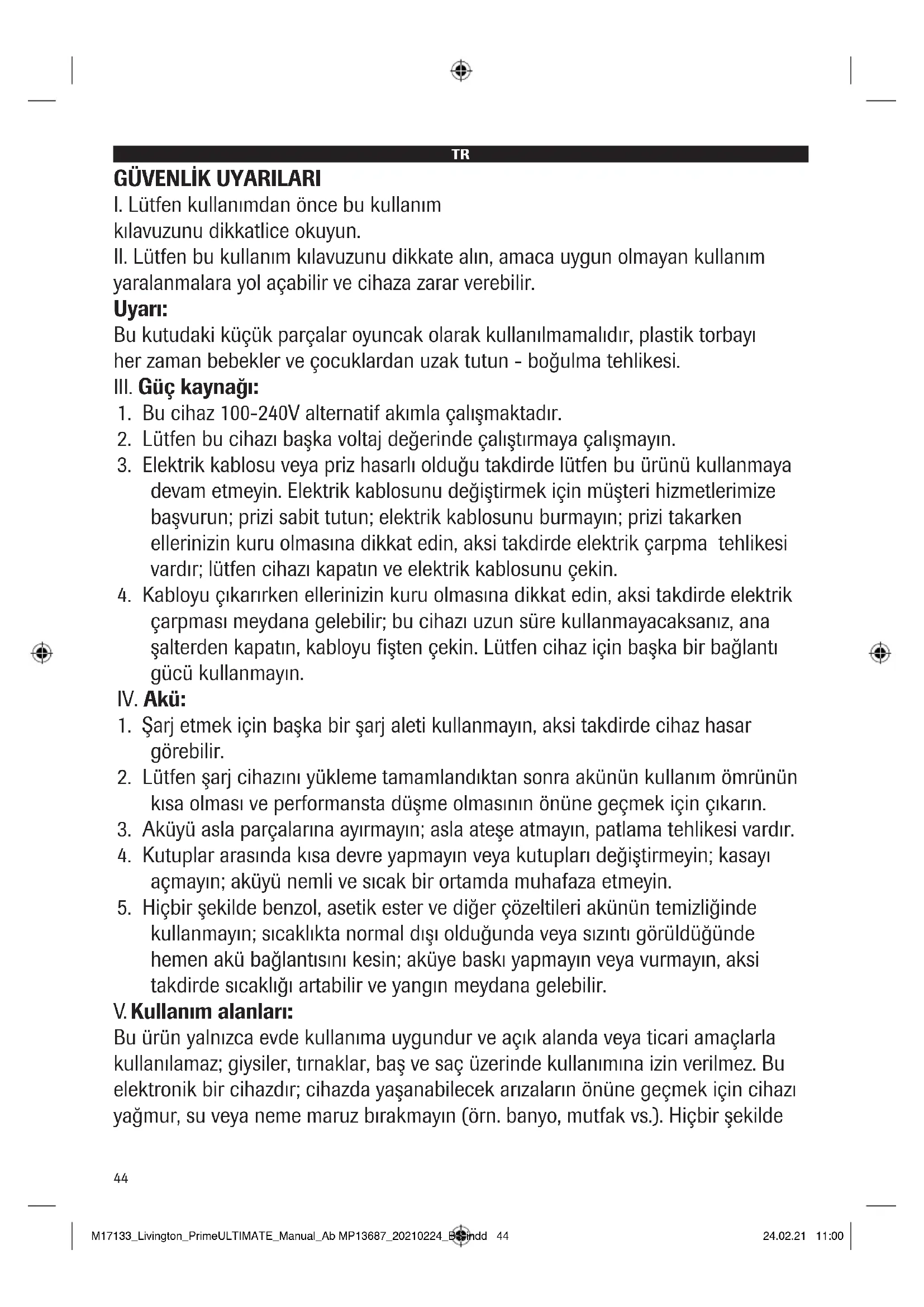 Bu ürün yalnızca evde kullanıma uygundur ve açık alanda veya ticari amaçlarla kullanılamaz; giysiler, tırnaklar, baş ve saç üzerinde kullanımına izin verilmez. Bu elektronik bir cihazdır; cihazda yaşanabilecek arızaların önüne geçmek için cihazı yağmur, su veya neme maruz bırakmayın (örn. banyo, mutfak vs.). Hiçbir şekilde M17133_Livington_PrimeULTIMATE_Manual_Ab MP13687_20210224_BS.indd 44M17133_Livington_PrimeULTIMATE_Manual_Ab MP13687_20210224_BS.indd 44 24.02.21 11:0024.02.21 11:0045 sıvı emdirmeyin. Cihazı potansiyel tehlikelerin bulunabileceği bir ortamda kullanmayın, örn. gaz sistemlerini, petrol tankları, kimyasal ve diğer yanabilir maddeler ile patlayıcı maddelerin yakınında; cihazı kül, yanan sigara veya tutuşmuş tahta parçalarının süpürülmesinde kullanmayın - yangın tehlikesi. Bu ürünü benzin, gaz yağı, boya, temizlik ürünü, alkol, parfüm, halı ve zemin temizlik ürünleri gibi yanıcı veya uçucu sıvıları çıkarmak için kullanmayın. Yangın veya patlamayı önlemek için lazer yazıcıdaki veya fotokopi makinesindeki toz boyayı veya toneri çıkarmak için bu ürünü kullanmayın.