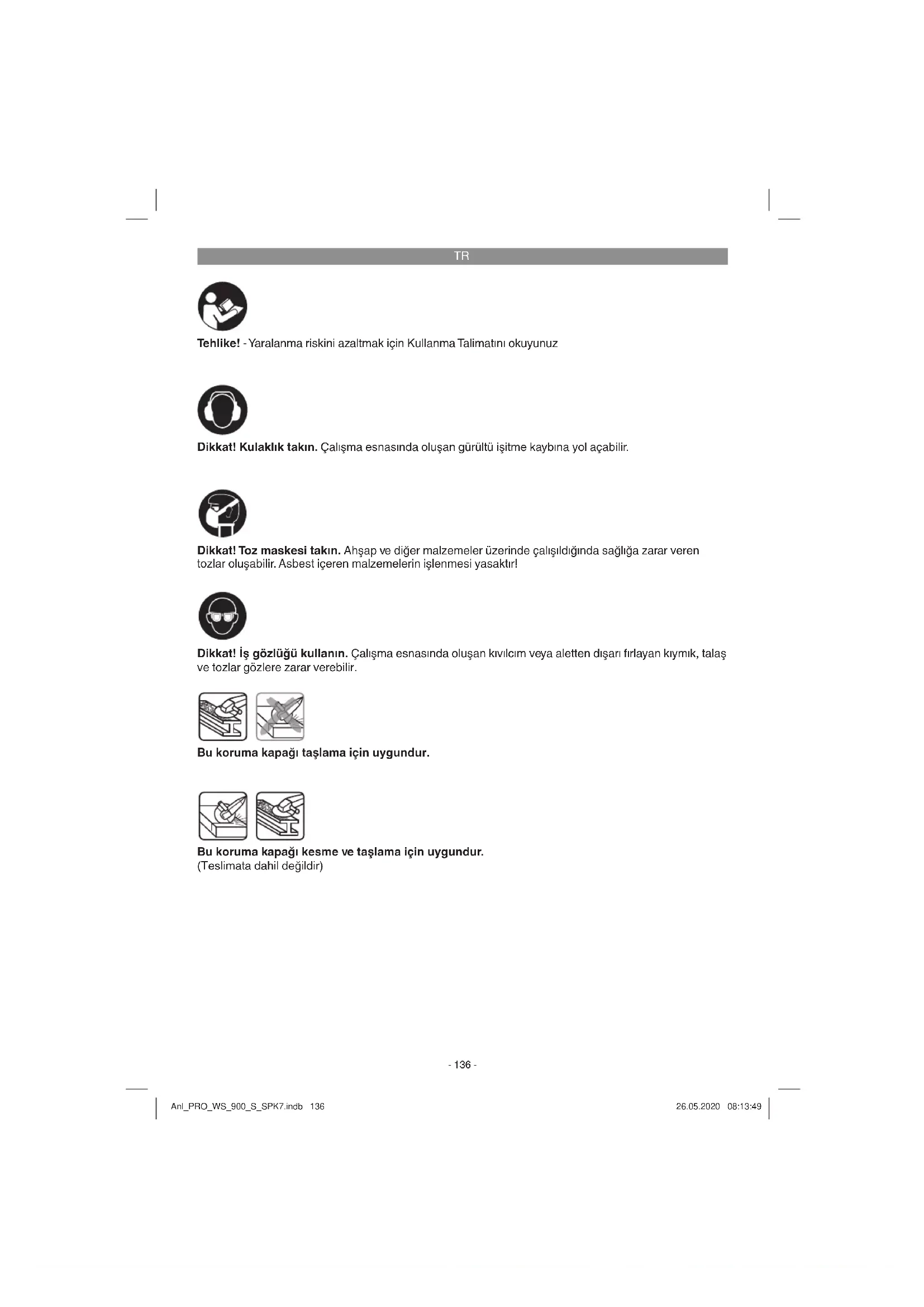 Tehlike! - Yaralanma riskini azaltmak için Kullanma Talimatını okuyunuz Dikkat! Kulaklık takın. Çalışma esnasında oluşan gürültü işitme kaybına yol açabilir. Dikkat! İş gözlüğü kullanın. Çalışma esnasında oluşan kıvılcım veya aletten dışarı fırlayan kıymık, talaş ve tozlar gözlere zarar verebilir. Dikkat! Toz maskesi takın. Ahşap ve diğer malzemeler üzerinde çalışıldığında sağlığa zarar veren tozlar oluşabilir. Asbest içeren malzemelerin işlenmesi yasaktır! Bu koruma kapağı kesme ve taşlama için uygundur. (Teslimata dahil değildir) Bu koruma kapağı taşlama için uygundur. Anl_PRO_WS_900_S_SPK7.indb 136Anl_PRO_WS_900_S_SPK7.indb 136 26.05.2020 08:13:4926.05.2020 08:13:49TR