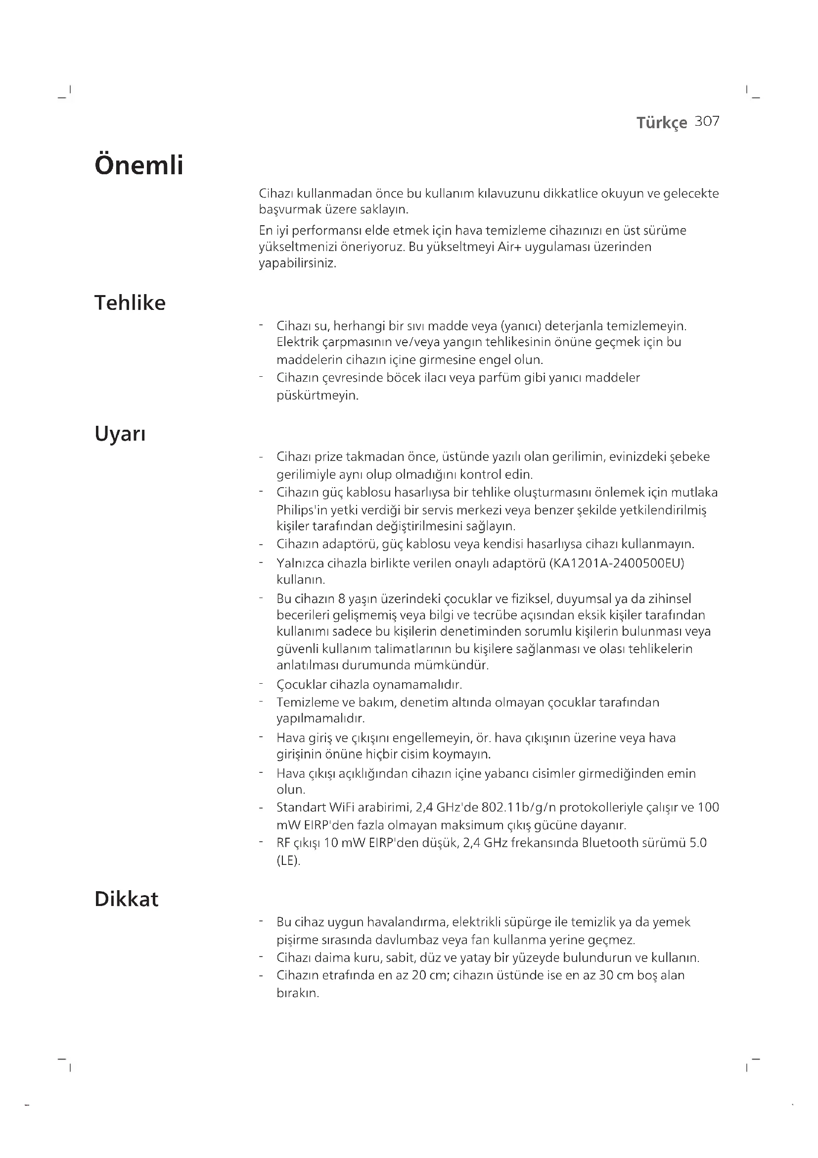 Türkçe Önemli Cihazı kullanmadan önce bu kullanım kılavuzunu dikkatlice okuyun ve gelecekte başvurmak üzere saklayın. En iyi performansı elde etmek için hava temizleme cihazınızı en üst sürüme yükseltmenizi öneriyoruz. Bu yükseltmeyi Air+ uygulaması üzerinden yapabilirsiniz. Tehlike