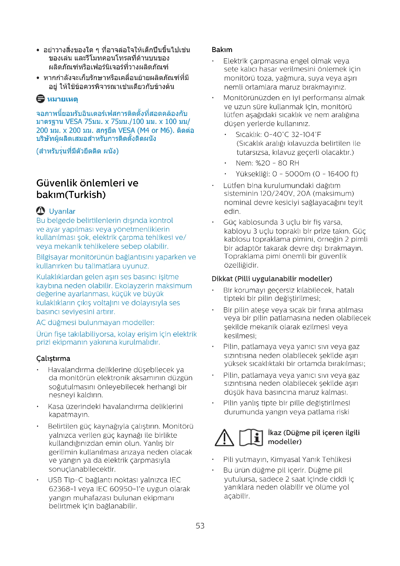 - Pilin yanlış tipte bir pille değiştirilmesi durumunda yangın veya patlama riski İkaz (Düğme pil içeren ilgili modeller)