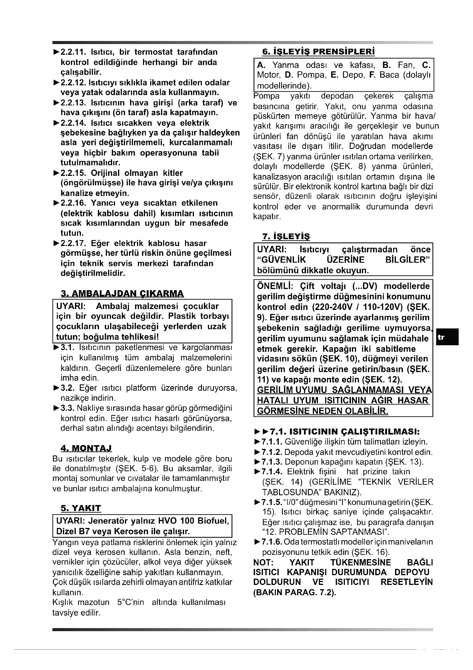 ►2.2.11. Isıtıcı, bir termostat tarafından kontrol edildiğinde herhangi bir anda çalışabilir. ►2.2.12. Isıtıcıyı sıklıkla ikamet edilen odalar veya yatak odalarında asla kullanmayın. ►2.2.13. Isıtıcının hava girişi (arka taraf) ve hava çıkışını (ön taraf) asla kapatmayın. ►2.2.14. Isıtıcı sıcakken veya elektrik şebekesine bağlıyken ya da çalışır haldeyken asla yeri değiştirilmemeli, kurcalanmamalı veya hiçbir bakım operasyonuna tabii tutulmamalıdır. ►2.2.15. Orijinal olmayan kitler (öngörülmüşse) ile hava girişi ve/ya çıkışını kanalize etmeyin. ►2.2.16. Yanıcı veya sıcaktan etkilenen (elektrik kablosu dahil) kısımları ısıtıcının sıcak kısımlarından uygun bir mesafede tutun. ►2.2.17. Eğer elektrik kablosu hasar görmüşse, her türlü riskin önüne geçilmesi için teknik servis merkezi tarafından değiştirilmelidir.
