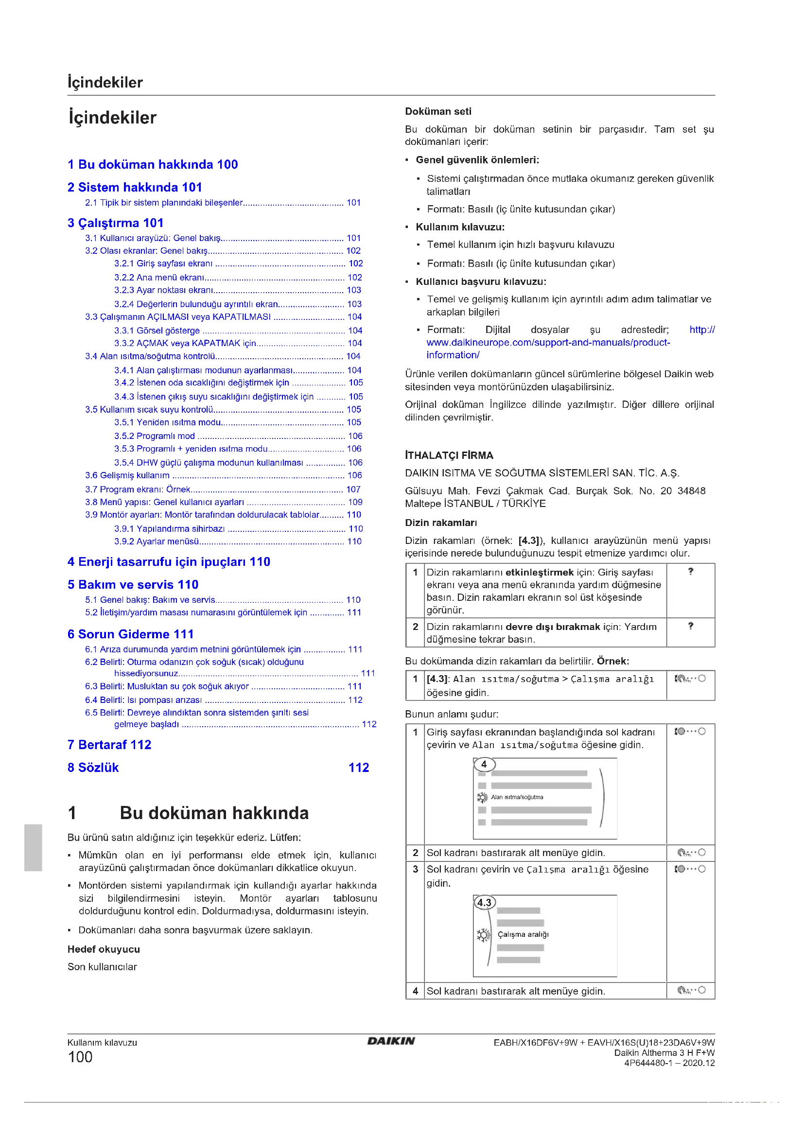 DAIKIN ISITMA VE SOĞUTMA SİSTEMLERİ SAN. TİC. A.Ş. Gülsuyu Mah. Fevzi Çakmak Cad. Burçak Sok. No. 20 34848 Maltepe İSTANBUL / TÜRKİYE Dizin rakamları Dizin rakamları (örnek: [4.3]), kullanıcı arayüzünün menü yapısı içerisinde nerede bulunduğunuzu tespit etmenize yardımcı olur. 1 Dizin rakamlarını etkinleştirmek için: Giriş sayfası ekranı veya ana menü ekranında yardım düğmesine basın. Dizin rakamları ekranın sol üst köşesinde görünür. 2 Dizin rakamlarını devre dışı bırakmak için: Yardım düğmesine tekrar basın. Bu dokümanda dizin rakamları da belirtilir. Örnek: 1 [4.3]: Alan ısıtma/soğutma > Çalışma aralığı öğesine gidin. Bunun anlamı şudur: 1 Giriş sayfası ekranından başlandığında sol kadranı çevirin ve Alan ısıtma/soğutma öğesine gidin.