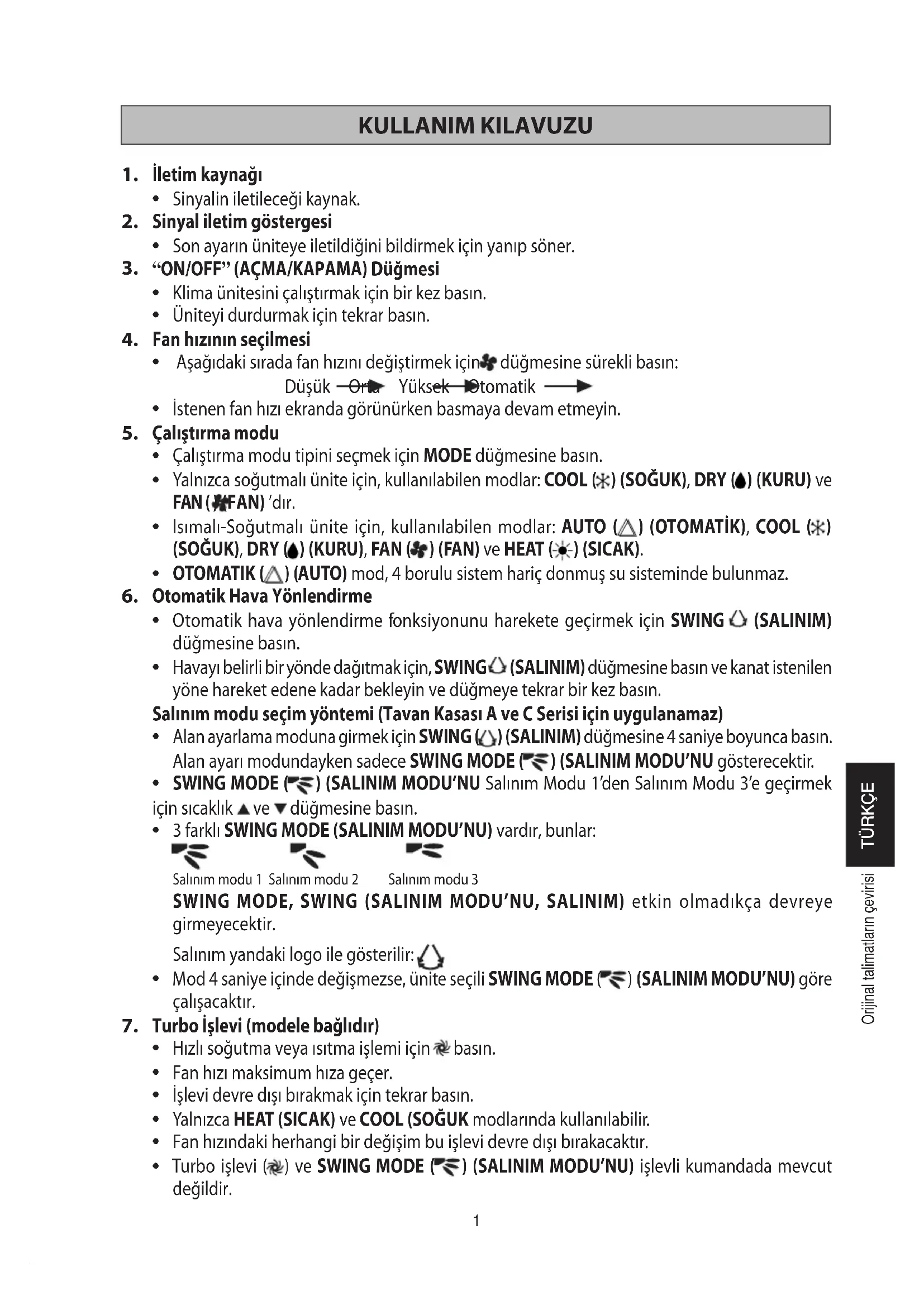 6-OM-GS02-1011(3)DAIKIN-RU.indd Sec1:46-OM-GS02-1011(3)DAIKIN-RU.indd Sec1:4 7/19/13 1:58:03 PM7/19/13 1:58:03 PM1 KULLANIM KILAVUZU İletim kaynağı Sinyalin iletileceği kaynak. Sinyal iletim göstergesi Son ayarın üniteye iletildiğini bildirmek için yanıp söner. “ON/OFF” (AÇMA/KAPAMA) Düğmesi Klima ünitesini çalıştırmak için bir kez basın. Üniteyi durdurmak için tekrar basın. Fan hızının seçilmesi Aşağıdaki sırada fan hızını değiştirmek için düğmesine sürekli basın: Düşük Orta Yüksek Otomatik İstenen fan hızı ekranda görünürken basmaya devam etmeyin. Çalıştırma modu Çalıştırma modu tipini seçmek için MODE düğmesine basın. Yalnızca soğutmalı ünite için, kullanılabilen modlar: COOL ( ) (SOĞUK), DRY ( ) (KURU) ve FAN ( ) (FAN) ’dır. Isımalı-Soğutmalı ünite için, kullanılabilen modlar: AUTO ( ) (OTOMATİK), COOL ( ) (SOĞUK), DRY ( ) (KURU), FAN ( ) (FAN) ve HEAT ( ) (SICAK). OTOMATIK ( ) (AUTO) mod, 4 borulu sistem hariç donmuş su sisteminde bulunmaz. Otomatik Hava Yönlendirme Otomatik hava yönlendirme fonksiyonunu harekete geçirmek için SWING (SALINIM) düğmesine basın. Havayı belirli bir yönde dağıtmak için, SWING (SALINIM) düğmesine basın ve kanat istenilen yöne hareket edene kadar bekleyin ve düğmeye tekrar bir kez basın. Salınım modu seçim yöntemi (Tavan Kasası A ve C Serisi için uygulanamaz) Alan ayarlama moduna girmek için SWING ( ) (SALINIM) düğmesine 4 saniye boyunca basın. Alan ayarı modundayken sadece SWING MODE ( ) (SALINIM MODU’NU gösterecektir. SWING MODE ( ) (SALINIM MODU’NU Salınım Modu 1’den Salınım Modu 3’e geçirmek için sıcaklık ve düğmesine basın. 3 farklı SWING MODE (SALINIM MODU’NU) vardır, bunlar: Salınım modu 1 Salınım modu 2 Salınım modu 3 SWING MODE, SWING (SALINIM MODU’NU, SALINIM) etkin olmadıkça devreye girmeyecektir. Salınım yandaki logo ile gösterilir: Mod 4 saniye içinde değişmezse, ünite seçili SWING MODE ( ) (SALINIM MODU’NU) göre çalışacaktır. Turbo İşlevi (modele bağlıdır) Hızlı soğutma veya ısıtma işlemi için basın. Fan hızı maksimum hıza geçer. İşlevi devre dışı bırakmak için tekrar basın. Yalnızca HEAT (SICAK) ve COOL (SOĞUK modlarında kullanılabilir. Fan hızındaki herhangi bir değişim bu işlevi devre dışı bırakacaktır. Turbo işlevi ( ) ve SWING MODE ( ) (SALINIM MODU’NU) işlevli kumandada mevcut değildir.