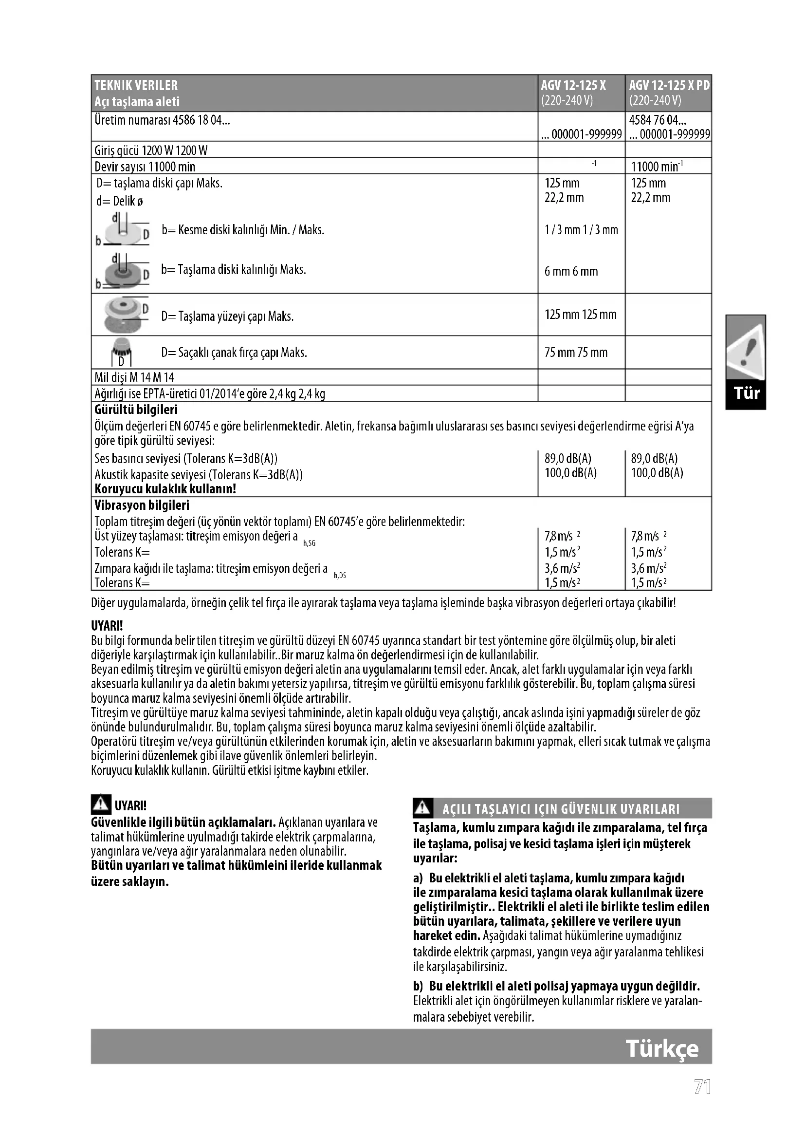 Diğer uygulamalarda, örneğin çelik tel fırça ile ayırarak taşlama veya taşlama işleminde başka vibrasyon değerleri ortaya çıkabilir! UYARI! Bu bilgi formunda belirtilen titreşim ve gürültü düzeyi EN 60745 uyarınca standart bir test yöntemine göre ölçülmüş olup, bir aleti diğeriyle karşılaştırmak için kullanılabilir..Bir maruz kalma ön değerlendirmesi için de kullanılabilir. Beyan edilmiş titreşim ve gürültü emisyon değeri aletin ana uygulamalarını temsil eder. Ancak, alet farklı uygulamalar için veya farklı aksesuarla kullanılır ya da aletin bakımı yetersiz yapılırsa, titreşim ve gürültü emisyonu farklılık gösterebilir. Bu, toplam çalışma süresi boyunca maruz kalma seviyesini önemli ölçüde artırabilir. Titreşim ve gürültüye maruz kalma seviyesi tahmininde, aletin kapalı olduğu veya çalıştığı, ancak aslında işini yapmadığı süreler de göz önünde bulundurulmalıdır. Bu, toplam çalışma süresi boyunca maruz kalma seviyesini önemli ölçüde azaltabilir. Operatörü titreşim ve/veya gürültünün etkilerinden korumak için, aletin ve aksesuarların bakımını yapmak, elleri sıcak tutmak ve çalışma biçimlerini düzenlemek gibi ilave güvenlik önlemleri belirleyin. Koruyucu kulaklık kullanın. Gürültü etkisi işitme kaybını etkiler. UYARI! Güvenlikle ilgili bütün açıklamaları. Açıklanan uyarılara ve talimat hükümlerine uyulmadığı takirde elektrik çarpmalarına, yangınlara ve/veya ağır yaralanmalara neden olunabilir. Bütün uyarıları ve talimat hükümleini ileride kullanmak üzere saklayın. AÇILI TAŞLAYICI IÇIN GÜVENLIK UYARILARI Taşlama, kumlu zımpara kağıdı ile zımparalama, tel fırça ile taşlama, polisaj ve kesici taşlama işleri için müşterek uyarılar: a) Bu elektrikli el aleti taşlama, kumlu zımpara kağıdı ile zımparalama kesici taşlama olarak kullanılmak üzere geliştirilmiştir.. Elektrikli el aleti ile birlikte teslim edilen bütün uyarılara, talimata, şekillere ve verilere uyun hareket edin. Aşağıdaki talimat hükümlerine uymadığınız takdirde elektrik çarpması, yangın veya ağır yaralanma tehlikesi ile karşılaşabilirsiniz. b) Bu elektrikli el aleti polisaj yapmaya uygun değildir. Elektrikli alet için öngörülmeyen kullanımlar risklere ve yaralan- malara sebebiyet verebilir.7272 Tür Türkçe c) Üretici tarafından özel olarak bu alet öngörülmeyen ve tavsiye edilmeyen aksesuar kullanmayın. Bir aksesuarı elektrikli el aletinize takabiliyor olmanız güvenli kullanımı garanti etmez. d) Kullanılan takımın izin verilen devri, en az elektrikli cihaz üzerinde yazılı azami devir kadar yüksek olmalıdır. İzin verilenden daha hızlı dönen aksesuar kırılabilir ve etrafa fırlayabilir. e) Kullanılan ucun dış çapı ve kalınlığı elektrikli el aleti- nizin ölçülerine uymalıdır. Ölçüsü uygun olmayan uçlar yeteri derecede kapatılamaz veya kontrol edilemez. f) Aksesuar parçalarının dişlileri taşlama milinin dişlilerine uygun olmalıdır. Flanşlanması gereken aksesuar parçalarında, aksesuar parçası içindeki germe sapının deliği, tespit etme anşının çapına uygun olmalıdır. Cihazın montaj sapı üzerine sığmayan aksesuar parçaları, eksantrik hareket eder, aşırı titreşir ve alet üzerindeki hakimiyetin kaybedilmesine neden olabilirler. g) Hasarlı uçları kullanmayın. Her kullanımdan önce taşlama disklerinde çatlak ve çizik olup olmadığını, zımpara tablalarında çizik ve aşınma olup olmadığını, tel fırçalarda gevşeme veya kırık teller olup olmadığını kontrol edin. Elek- trikli el aleti veya uç yere düşecek olursa hasar görüp görme- diklerini kontrol edin, gerekiyorsa hasar görmemiş başka bir uç kullanın. Kullanacağınız ucu kontrol edip taktıktan sonra ucun dönme alanı yakınında bulunan kişileri uzaklaştırın ve elektrikli el aletini bir dakika en yüksek devir sayısında çalıştırın. Hasarlı uçlar çoğu zaman bu test süresinde kırılır. h) Kişisel koruyucu donanım kullanın. Yaptığınız işe göre tam yüz siperliği, göz koruma donanımı veya koruyucu gözlük kullanın. Eğer uygunsa küçük taşlama ve malzeme parçacıklarına karşı koruma sağlayan toz maskesi, koruyucu kulaklık, koruyucu iş eldivenleri veya özel iş önlüğü kullanın. Gözler çeşitli uygulamalarda etrafa savrulan parçacıklardan korunmalıdır. Toz veya soluma maskesi çalışma sırasında ortaya çıkan tozları ltre eder. Uzun süre yüksek gürültü altında çalışırsanız işitme kaybına uğrayabilirsiniz.