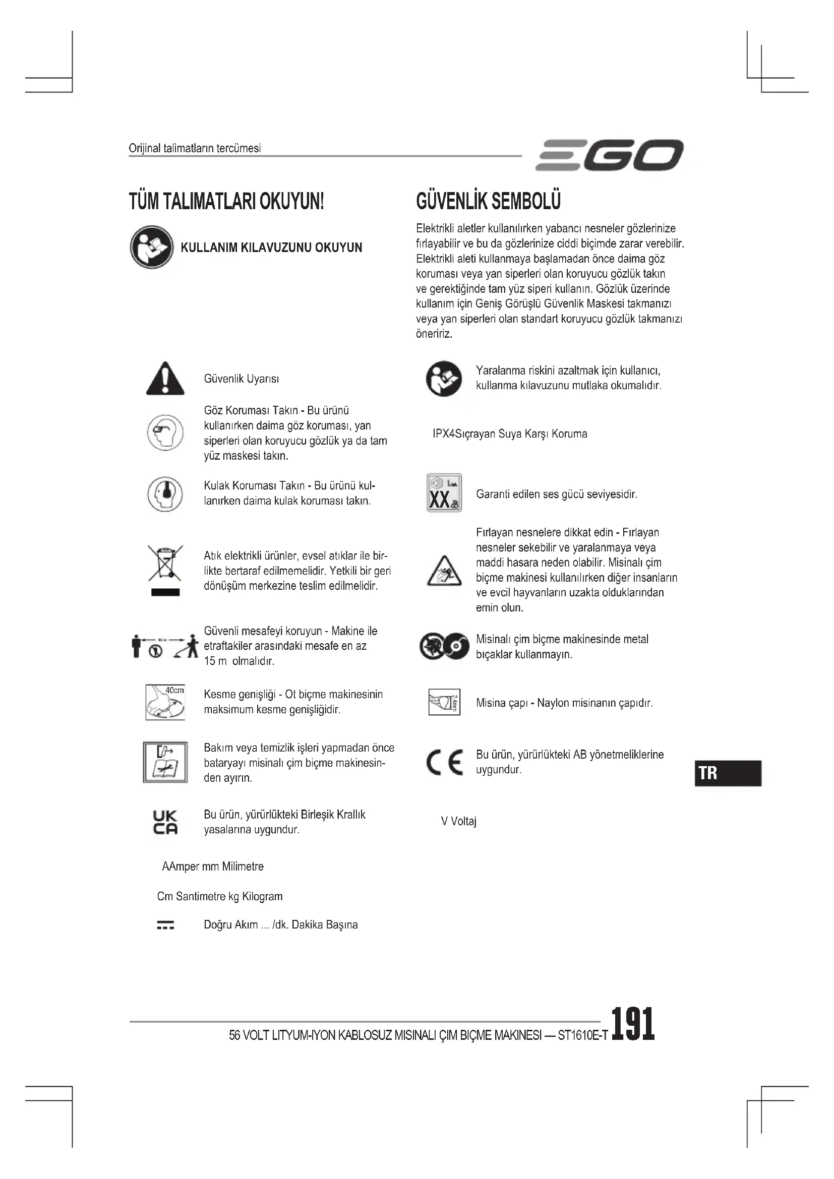 Garanti edilen ses gücü seviyesidir.Atık elektrikli ürünler, evsel atıklar ile bir-likte bertaraf edilmemelidir. Yetkili bir geri dönüşüm merkezine teslim edilmelidir.Fırlayan nesnelere dikkat edin - Fırlayan nesneler sekebilir ve yaralanmaya veya maddi hasara neden olabilir. Misinalı çim biçme makinesi kullanılırken diğer insanların ve evcil hayvanların uzakta olduklarından emin olun. Güvenli mesafeyi koruyun - Makine ile etraftakiler arasındaki mesafe en az 15 m olmalıdır.Misinalı çim biçme makinesinde metal bıçaklar kullanmayın. 40cm Kesme genişliği - Ot biçme makinesinin maksimum kesme genişliğidir. 2.4mmMisina çapı - Naylon misinanın çapıdır.Bakım veya temizlik işleri yapmadan önce bataryayı misinalı çim biçme makinesin-den ayırın.Bu ürün, yürürlükteki AB yönetmeliklerine uygundur.Bu ürün, yürürlükteki Birleşik Krallık yasalarına uygundur.V VoltajA Amper mm MilimetreCm Santimetre kg KilogramDoğru Akım ... /dk. Dakika BaşınaOrijinal talimatların tercümesi56 VOLT LITYUM-IYON KABLOSUZ MISINALI ÇIM BIÇME MAKINESI — ST1610E-T192
