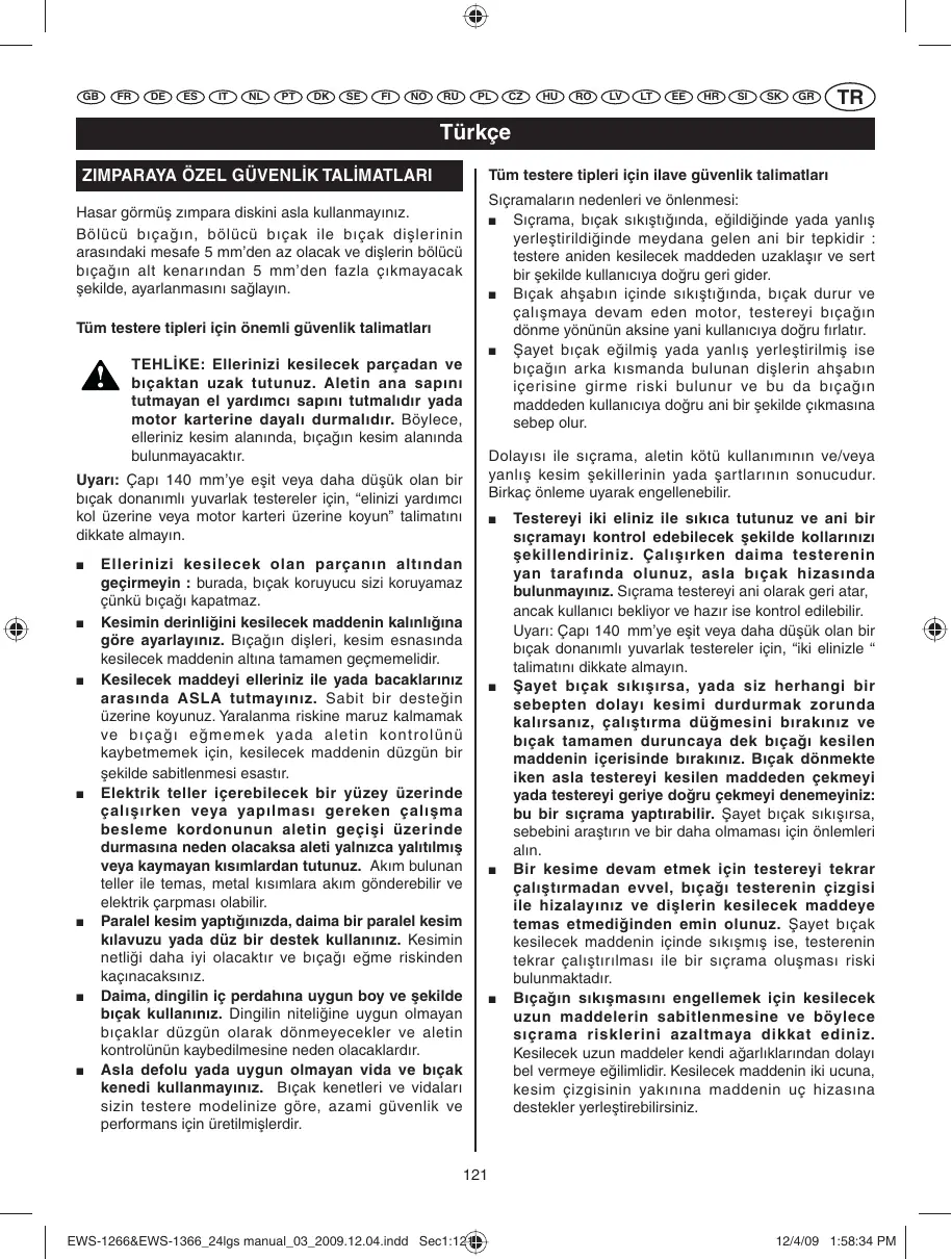 Daima, dingilin ic perdahina uygun boy ve sekilde bicak kullaniniz. Dingilin nitelignine uygun olmayan bicaklar duzgün olarak donmeyecker v aletin kontrolunün kaybedimese neden olacakladr. - Asla defolu yada uygun olmayan vida ve seksak kenedi kullanmayiniz. Bijklak ketetleri ve vidaları sizin testere modelinize®, azami güvenlik ve performanskın üretilmislerdir.