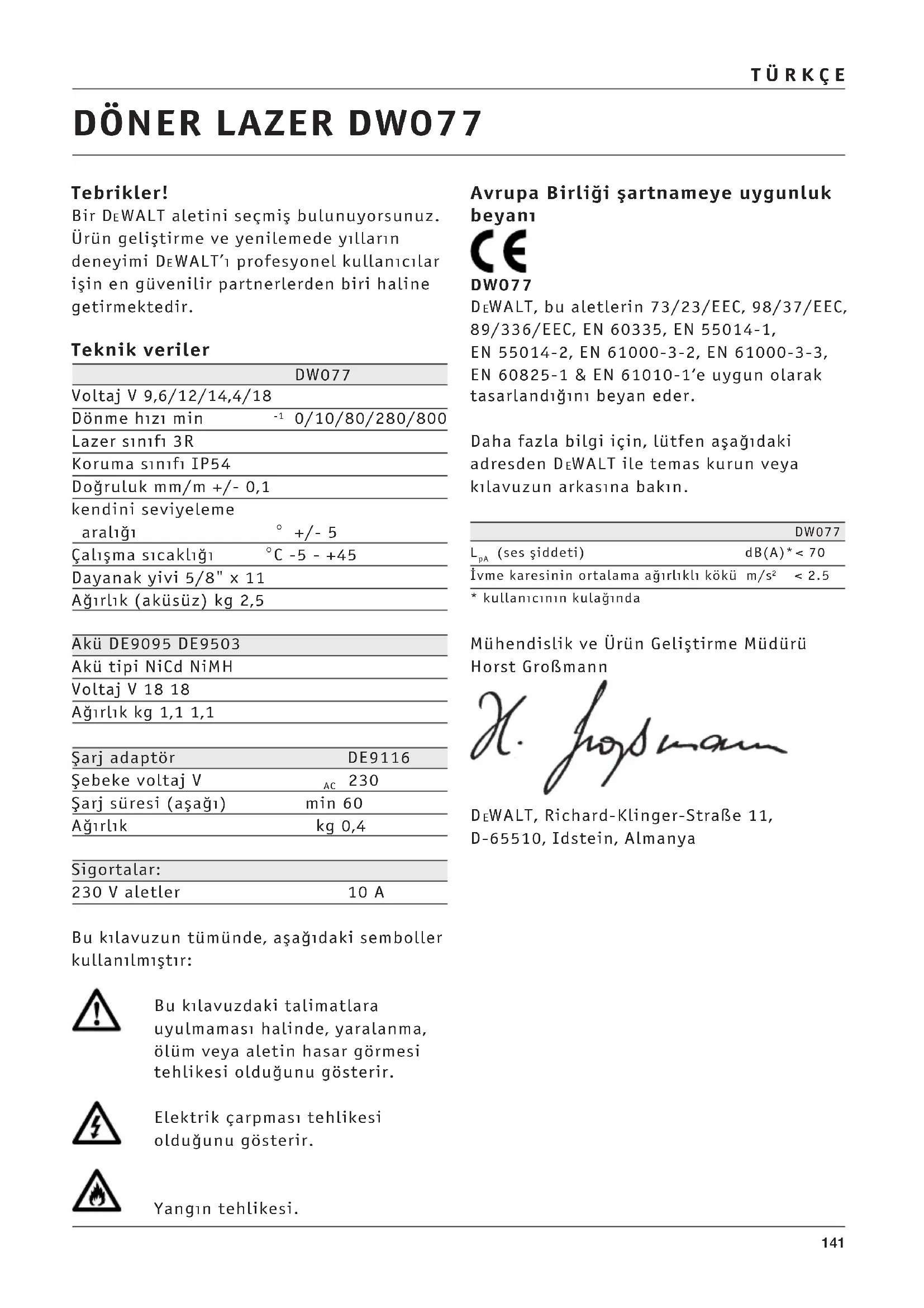 Şarj süresi (aşağ) min 60 Ağrlk kg 0,4 Sigortalar: 230 V aletler 10 A Bu klavuzun tümünde, aşağdaki semboller kullanlmştr: Bu klavuzdaki talimatlara uyulmamas halinde, yaralanma, ölüm veya aletin hasar görmesi tehlikesi olduğunu gösterir. Elektrik çarpmas tehlikesi olduğunu gösterir. Yangn tehlikesi. Avrupa Birliği şartnameye uygunluk beyan& DW077