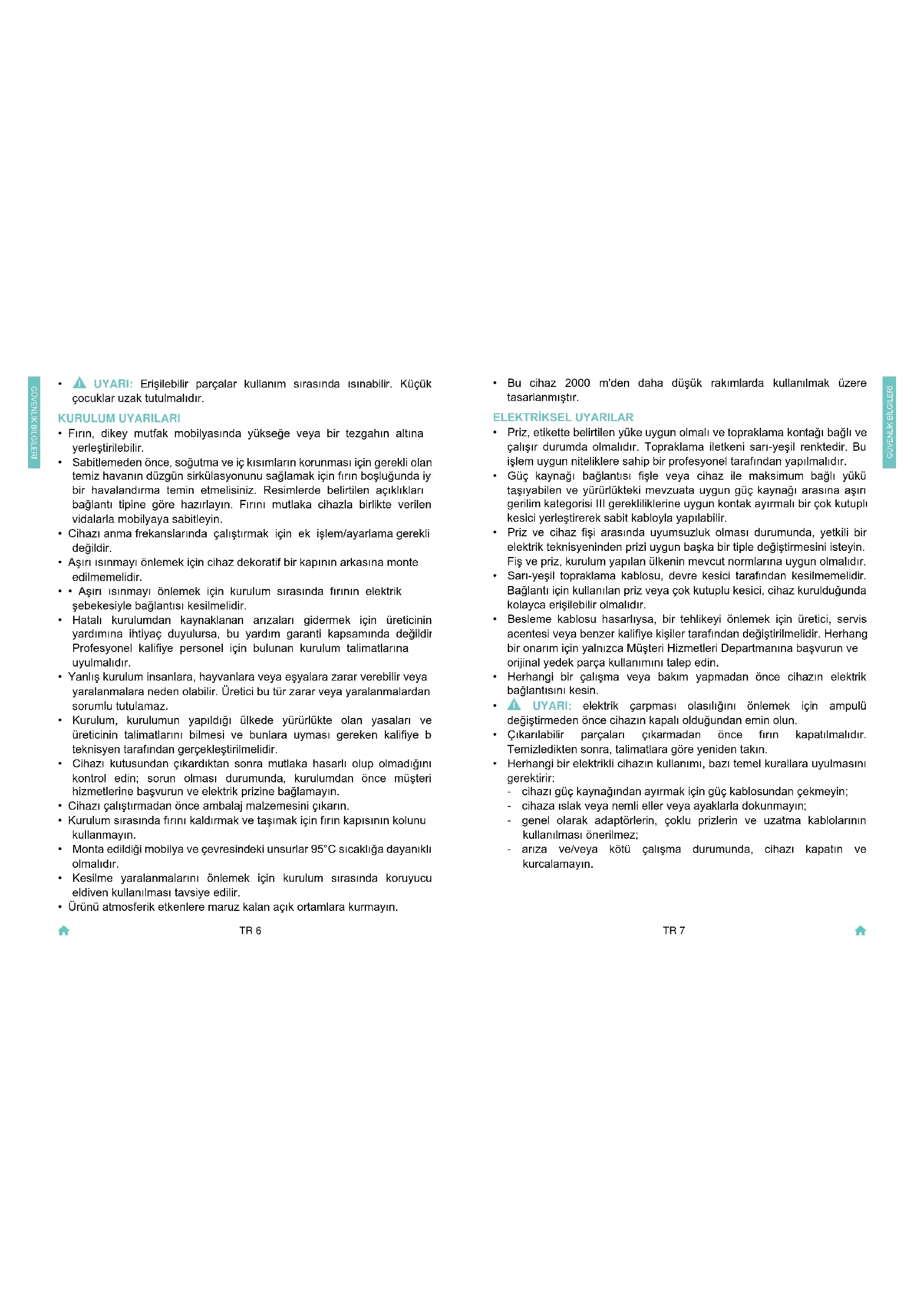 GÜVENLİK BİLGİLERİ• NOT: fırın bakım işlemleri gerektirebileceğinden, fırının kurulduğu yerden çıkarılması durumunda bağlanabilmesi için başka bir duvar prizinin hazır bulundurulması tavsiye edilir.
