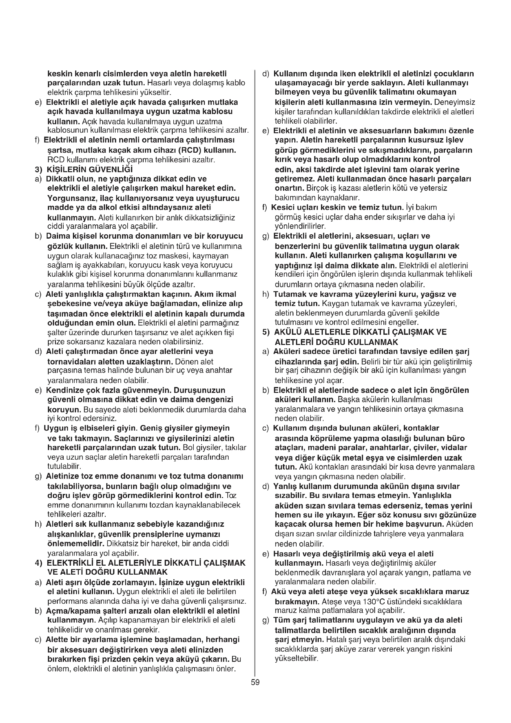 a) Aküleri sadece üretici tarafından tavsiye edilen şarj cihazlarında şarj edin. Belirli bir tür akü için geliştirilmiş bir şarj cihazının değişik bir akü için kullanılması yangın tehlikesine yol açar. b) Elektrikli el aletlerinde sadece o alet için öngörülen aküleri kullanın. Başka akülerin kullanılması yaralanmalara ve yangın tehlikesinin ortaya çıkmasına neden olabilir. c) Kullanım dışında bulunan aküleri, kontaklar arasında köprüleme yapma olasılığı bulunan büro ataçları, madeni paralar, anahtarlar, çiviler, vidalar veya diğer küçük metal eşya ve cisimlerden uzak tutun. Akü kontakları arasındaki bir kısa devre yanmalara veya yangın çıkmasına neden olabilir. d) Yanlış kullanım durumunda akünün dışına sıvılar sızabilir. Bu sıvılara temas etmeyin. Yanlışlıkla aküden sızan sıvılara temas ederseniz, temas yerini hemen su ile yıkayın. Eğer söz konusu sıvı gözünüze kaçacak olursa hemen bir hekime başvurun. Aküden dışarı sızan sıvılar cildinizde tahrişlere veya yanmalara neden olabilir. e) Hasarlı veya değiştirilmiş akü veya el aleti kullanmayın. Hasarlı veya değiştirilmiş aküler beklenmedik davranışlara yol açarak yangın, patlama ve yaralanmalara neden olabilir. f) Akü veya aleti ateşe veya yüksek sıcaklıklara maruz bırakmayın. Ateşe veya 130°C üstündeki sıcaklıklara maruz kalma patlamalara yol açabilir. g) Tüm şarj talimatlarını uygulayın ve akü ya da aleti talimatlarda belirtilen sıcaklık aralığının dışında şarj etmeyin. Hatalı şarj veya belirtilen aralık dışındaki sıcaklıklarda şarj aküye zarar vererek yangın riskini yükseltebilir. keskin kenarlı cisimlerden veya aletin hareketli parçalarından uzak tutun. Hasarlı veya dolaşmış kablo elektrik çarpma tehlikesini yükseltir. e) Elektrikli el aletiyle açık havada çalışırken mutlaka açık havada kullanılmaya uygun uzatma kablosu kullanın. Açık havada kullanılmaya uygun uzatma kablosunun kullanılması elektrik çarpma tehlikesini azaltır. f) Elektrikli el aletinin nemli ortamlarda çalıştırılması şartsa, mutlaka kaçak akım cihazı (RCD) kullanın. RCD kullanımı elektrik çarpma tehlikesini azaltır.