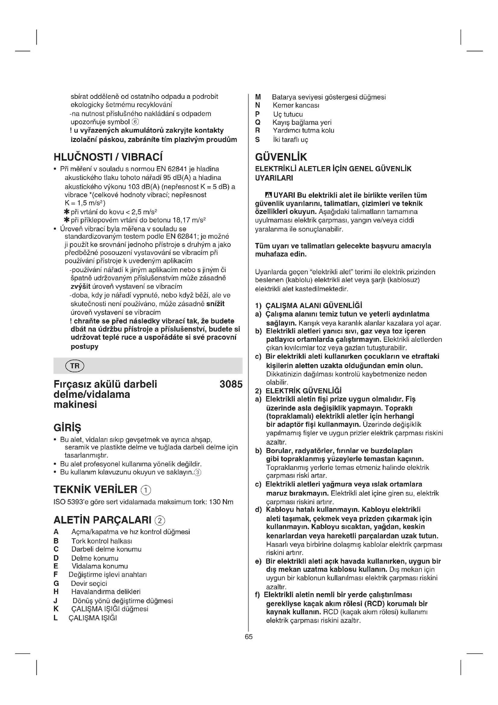 a) Elektrikli aletin şi prize uygun olmalıdır. Fiş üzerinde asla değişiklik yapmayın. Topraklı (topraklamalı) elektrikli aletler için herhangi bir adaptör şi kullanmayın. Üzerinde değişiklik yapılmamış şler ve uygun prizler elektrik çarpması riskini azaltır. b) Borular, radyatörler, fırınlar ve buzdolapları gibi topraklanmış yüzeylerle temastan kaçının. Topraklanmış yerlerle temas etmeniz halinde elektrik çarpması riski artar. c) Elektrikli aletleri yağmura veya ıslak ortamlara maruz bırakmayın. Elektrikli alet içine giren su, elektrik çarpması riskini artırır. d) Kabloyu hatalı kullanmayın. Kabloyu elektrikli aleti taşımak, çekmek veya prizden çıkarmak için kullanmayın. Kabloyu sıcaktan, yağdan, keskin kenarlardan veya hareketli parçalardan uzak tutun. Hasarlı veya birbirine dolaşmış kablolar elektrik çarpması riskini artırır. e) Bir elektrikli aleti açık havada kullanırken, uygun bir dış mekan uzatma kablosu kullanın. Dış mekan için uygun bir kablonun kullanılması elektrik çarpması riskini azaltır. f) Elektrikli aletin nemli bir yerde çalıştırılması gerekliyse kaçak akım rölesi (RCD) korumalı bir kaynak kullanın. RCD (kaçak akım rölesi) kullanımı elektrik çarpması riskini azaltır. sbírat odděleně od ostatního odpadu a podrobit ekologicky šetrnému recyklování - na nutnost příslušného nakládání s odpadem upozorňuje symbol