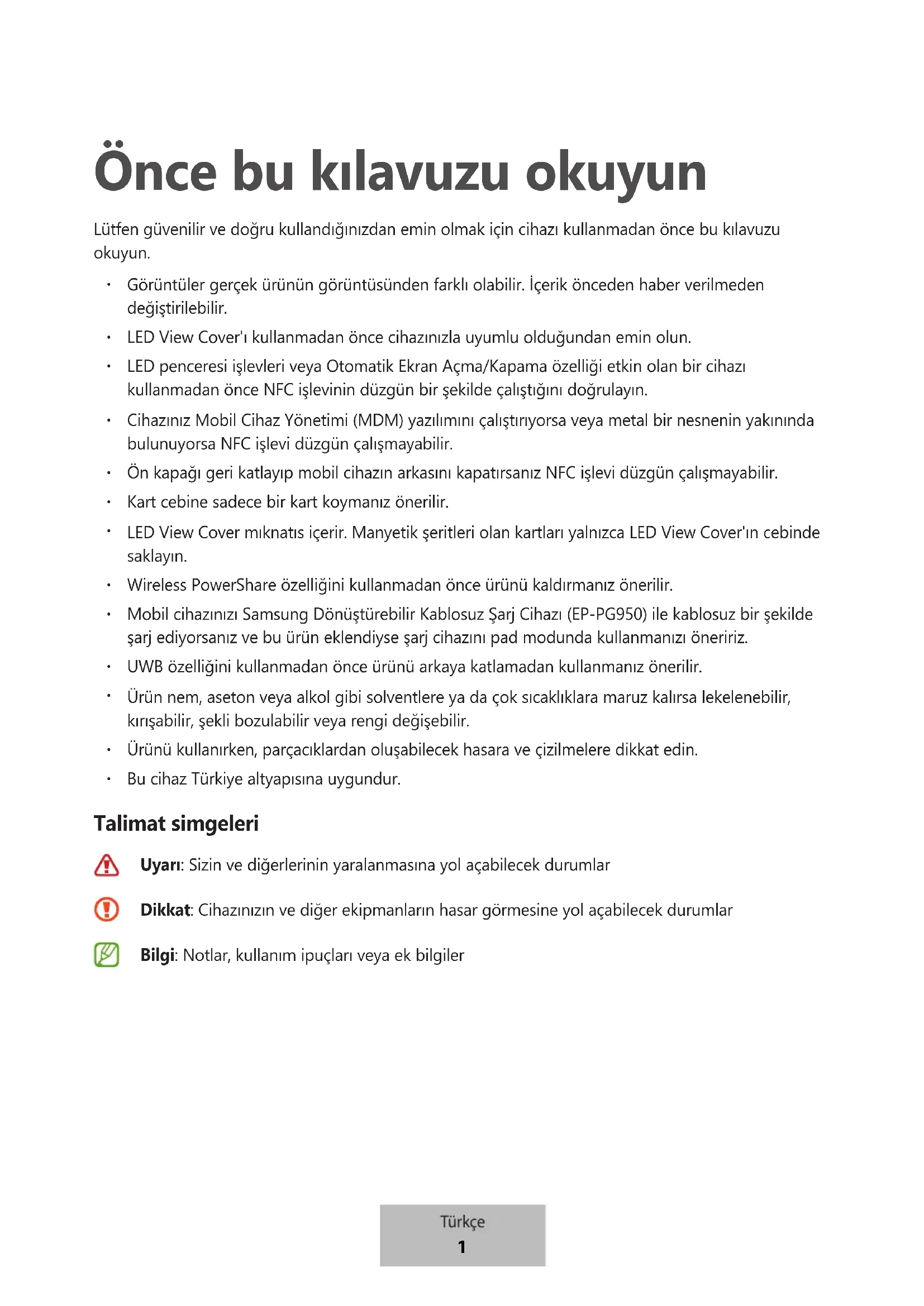LED penceresi işlevleri veya Otomatik Ekran Açma/Kapama özelliği etkin olan bir cihazı kullanmadan önce NFC işlevinin düzgün bir şekilde çalıştığını doğrulayın.