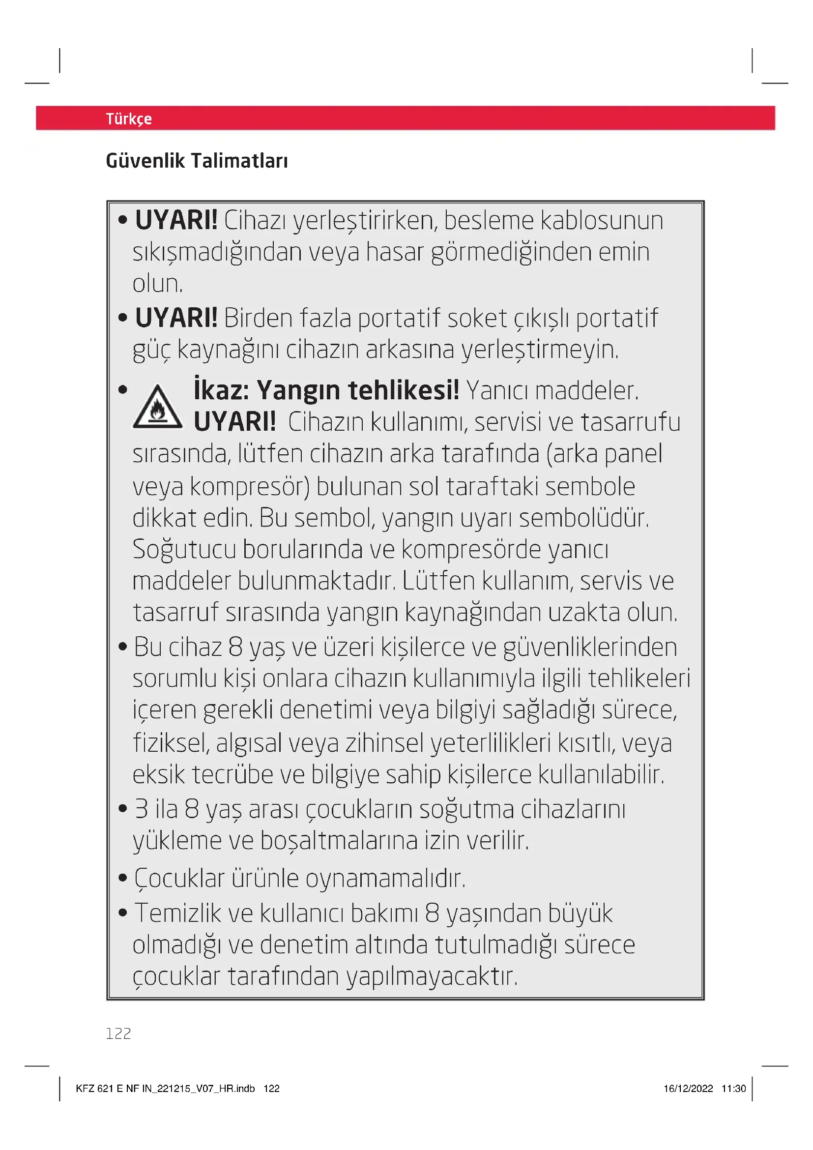 İkaz: Yangın tehlikesi! Yanıcı maddeler. UYARI! Cihazın kullanımı, servisi ve tasarrufu sırasında, lütfen cihazın arka tarafında (arka panel veya kompresör) bulunan sol taraftaki sembole dikkat edin. Bu sembol, yangın uyarı sembolüdür. Soğutucu borularında ve kompresörde yanıcı maddeler bulunmaktadır. Lütfen kullanım, servis ve tasarruf sırasında yangın kaynağından uzakta olun. KFZ 621 E NF IN_221215_V07_HR.indb 3KFZ 621 E NF IN_221215_V07_HR.indb 3 16/12/2022 11:3016/12/2022 11:30Deutsch