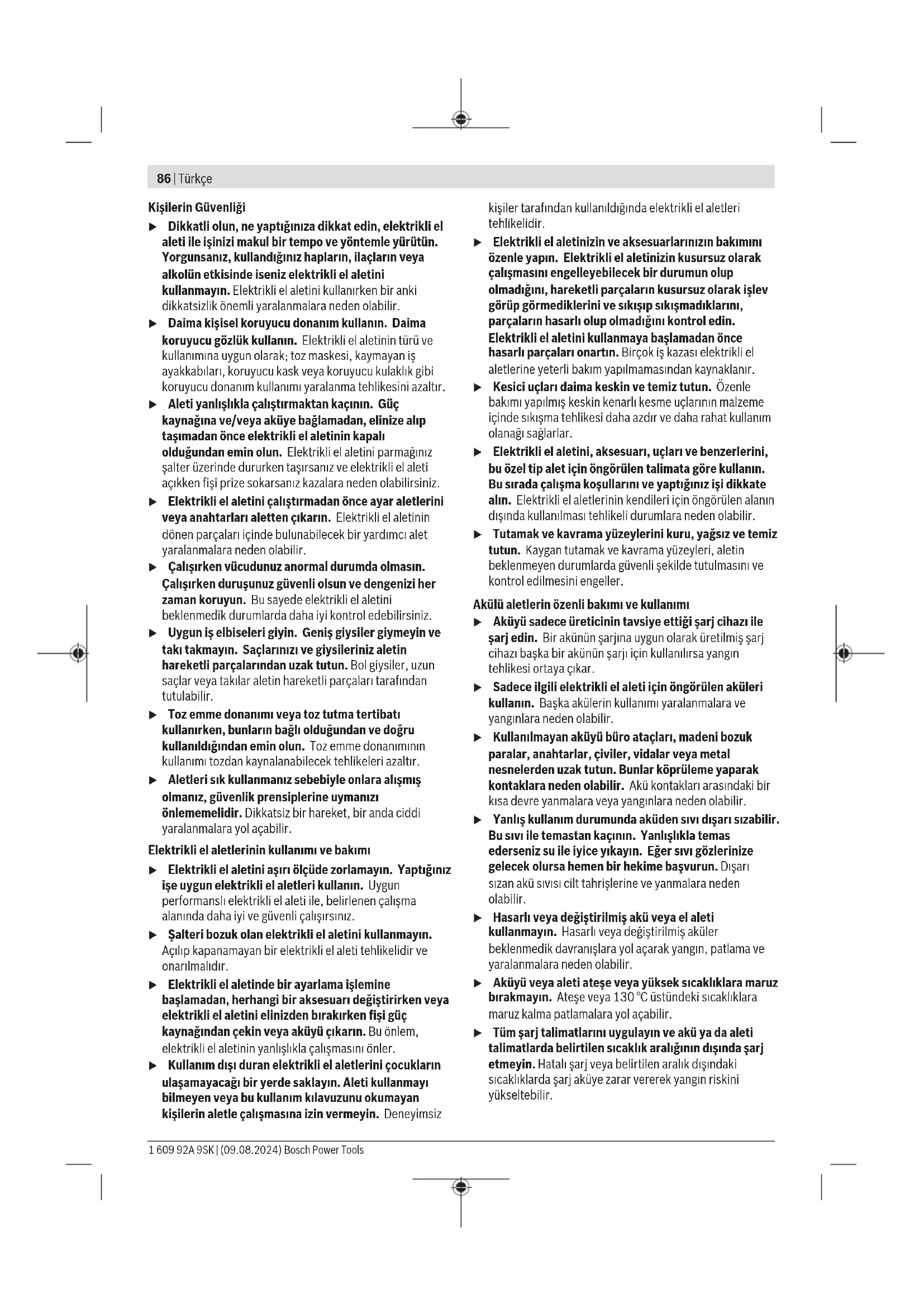 Τα ηλεκτρικά εργαλεία, οι μπαταρίες, τα εξαρτή- ματα και οι συσκευασίες πρέπει να ανακυκλώνο- νται με τρόπο φιλικό προς το περιβάλλον. Μην ρίχνετε τα ηλεκτρικά εργαλεία και τις μπατα- ρίες στα απορρίμματα του σπιτιού σας! Μόνο για χώρες τηςΕΕ: Τα άχρηστα ηλεκτρικά εργαλεία και οι χαλασμένες ή χρησιμο- ποιημένες μπαταρίες πρέπει να αποσύρονται ξεχωριστά. Χρη- σιμοποιείτε τα προβλεπόμενα συστήματα συλλογής. Εάν οι παλαιές ηλεκτρικές και ηλεκτρονικές συσκευές απορρί- πτονται με ακατάλληλο τρόπο, μπορεί να έχουν επιβλαβείς επι- πτώσεις στο περιβάλλον και την ανθρώπινη υγεία λόγω της πι- θανής παρουσίας επικίνδυνων ουσιών. Μπαταρίες/Επαναφορτιζόμενες μπαταρίες: Li-Ion: Προσέξτε παρακαλώ τις υποδείξεις στην ενότητα Μεταφορά (βλέπε «Μεταφορά», Σελίδα85). Türkçe Güvenlik talimatı Elektrikli el aletleri için genel güvenlik uyarıları UYARI Bu elektrikli el aletiyle birlikte gelen tüm güvenlik uyarılarını, talimatları, resim ve açıklamaları okuyun. Aşağıda bulunan talimatlara uyulmaması halinde elektrik çarpmalarına, yangınlara ve/veya ağır yaralanmalara neden olabilir. Bütün uyarıları ve talimat hükümlerini ileride kullanmak üzere saklayın. Uyarı ve talimat hükümlerinde kullanılan "elektrikli el aleti" terimi, akım şebekesine bağlı (elektrikli) aletlerle akü ile çalışan aletleri (akülü) kapsamaktadır. Çalışma yeri güvenliği u Çalıştığınız yeri temiz tutun ve iyi aydınlatın. Dağınık veya karanlık alanlar kazalara davetiye çıkarır. u Yakınında patlayıcı maddeler, yanıcı sıvı, gaz veya tozların bulunduğu yerlerde elektrikli el aleti ile çalışmayın. Elektrikli el aletleri, toz veya buharların tutuşmasına neden olabilecek kıvılcımlar çıkarırlar. u Elektrikli el aleti ile çalışırken çocukları ve etraftaki kişileri uzakta tutun. Dikkatiniz dağılacak olursa aletin kontrolünü kaybedebilirsiniz. Elektrik Güvenliği u Elektrikli el aletinin fişi prize uymalıdır. Fişi hiçbir zaman değiştirmeyin. Korumalı (topraklanmış) elektrikli el aletleri ile birlikte adaptör fiş kullanmayın. Değiştirilmemiş fiş ve uygun priz elektrik çarpma tehlikesini azaltır. u Borular, kalorifer petekleri, ısıtıcılar ve buzdolapları gibi topraklanmış yüzeylerle vücudunuzun temas etmesinden kaçının. Vücudunuz topraklandığı anda büyük bir elektrik çarpma tehlikesi ortaya çıkar. u Elektrikli el aletlerini yağmur altında veya nemli ortamlarda bırakmayın. Suyun elektrikli el aleti içine sızması elektrik çarpma tehlikesini artırır. u Kabloya zarar vermeyin. Elektrikli el aletini kablosundan tutarak taşımayın, kabloyu kullanarak çekmeyin veya kablodan çekerek fişi çıkarmayın. Kabloyu ateş, yanıcı ve/veya keskin ve hareket eden maddelerden uzak tutun. Hasarlı veya dolaşmış kablo elektrik çarpma tehlikesini artırır. u Bir elektrikli el aleti ile açık havada çalışırken mutlaka açık havada kullanılmaya uygun uzatma kablosu kullanın. Açık havada kullanılmaya uygun uzatma kablosunun kullanılması elektrik çarpma tehlikesini azaltır. u Elektrikli el aletinin nemli ortamlarda çalıştırılması şartsa mutlaka kaçak akım koruma rölesi kullanın. Kaçak akım koruma rölesi şalterinin kullanımı elektrik çarpma tehlikesini azaltır. Bosch Power Tools 1 609 92A 9SK | (09.08.2024)86 | Türkçe Kişilerin Güvenliği u Dikkatli olun, ne yaptığınıza dikkat edin, elektrikli el aleti ile işinizi makul bir tempo ve yöntemle yürütün. Yorgunsanız, kullandığınız hapların, ilaçların veya alkolün etkisinde iseniz elektrikli el aletini kullanmayın. Elektrikli el aletini kullanırken bir anki dikkatsizlik önemli yaralanmalara neden olabilir. u Daima kişisel koruyucu donanım kullanın. Daima koruyucu gözlük kullanın. Elektrikli el aletinin türü ve kullanımına uygun olarak; toz maskesi, kaymayan iş ayakkabıları, koruyucu kask veya koruyucu kulaklık gibi koruyucu donanım kullanımı yaralanma tehlikesini azaltır. u Aleti yanlışlıkla çalıştırmaktan kaçının. Güç kaynağına ve/veya aküye bağlamadan, elinize alıp taşımadan önce elektrikli el aletinin kapalı olduğundan emin olun. Elektrikli el aletini parmağınız şalter üzerinde dururken taşırsanız ve elektrikli el aleti açıkken fişi prize sokarsanız kazalara neden olabilirsiniz. u Elektrikli el aletini çalıştırmadan önce ayar aletlerini veya anahtarları aletten çıkarın. Elektrikli el aletinin dönen parçaları içinde bulunabilecek bir yardımcı alet yaralanmalara neden olabilir. u Çalışırken vücudunuz anormal durumda olmasın. Çalışırken duruşunuz güvenli olsun ve dengenizi her zaman koruyun. Bu sayede elektrikli el aletini beklenmedik durumlarda daha iyi kontrol edebilirsiniz. u Uygun iş elbiseleri giyin. Geniş giysiler giymeyin ve takı takmayın. Saçlarınızı ve giysileriniz aletin hareketli parçalarından uzak tutun. Bol giysiler, uzun saçlar veya takılar aletin hareketli parçaları tarafından tutulabilir. u Toz emme donanımı veya toz tutma tertibatı kullanırken, bunların bağlı olduğundan ve doğru kullanıldığından emin olun. Toz emme donanımının kullanımı tozdan kaynalanabilecek tehlikeleri azaltır. u Aletleri sık kullanmanız sebebiyle onlara alışmış olmanız, güvenlik prensiplerine uymanı