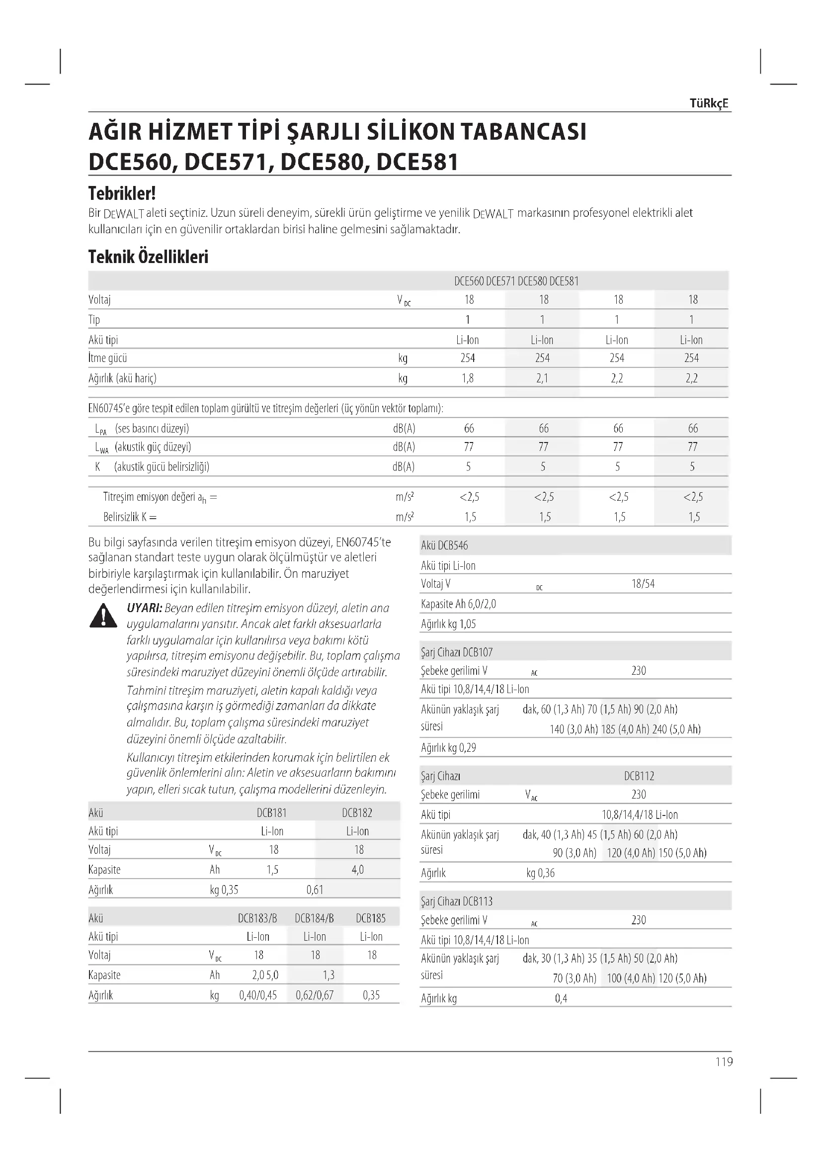 aküleri haricindeki akülerin DeWALT şarj cihazlarıyla şarj edilmesi patlamalarına veya diğer tehlikeli durumların ortaya çıkmasına sebepolabilir. Aküyü ateşeatmayın. Kullanım: Taşıma kapağı olmadan kullanım, Wh değeri 108 Wh gösterir (108 Wh değerine sahip 1 batarya). Taşıma: Dahili taşıma kapağıyla taşıma, Wh değeri 3 x 36 Wh gösterir (36 Wh değerine sahip 3 batarya). Akü tipi DCE560, DCE571, DCE580 ve DCE581 18 volt akülerleçalışır. Bu bataryalar kullanılmalıdır: DCB181, DCB182, DCB183, DCB183B, DCB184, DCB184B, DCB185, DCB546. Daha fazla bilgi için Teknik Veriler bölümünebakın. Ambalaj İçeriği Ambalaj, aşağıdaki parçaları içermektedir: 1 Kartuş Tutucu (DCE560 ve DCE581) 1 Sosis Tutacağı (DCE571, DCE580 ve DCE581) 1 Tabancası 1 Kısa piston kolu(DCE581) 1 Li-İyon batarya 1 Kullanım kılavuzu