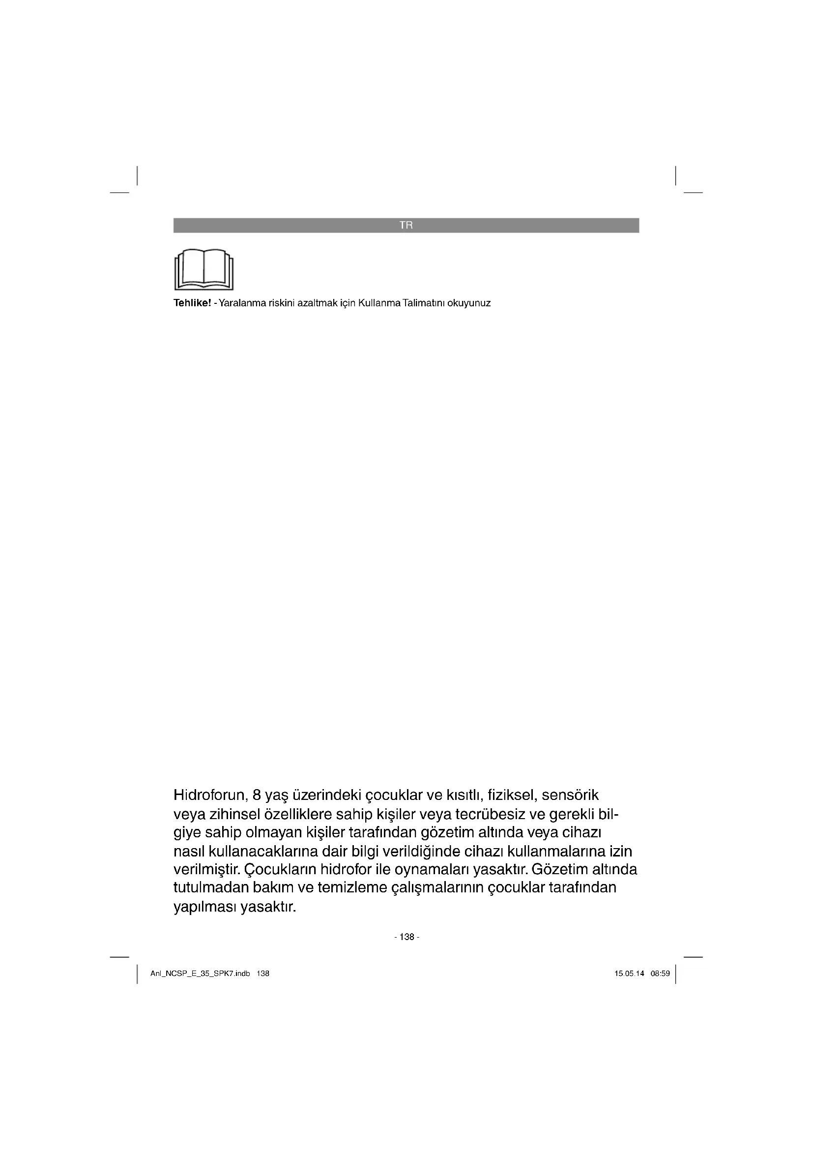 Tehlike! - Yaralanma riskini azaltmak için Kullanma Talimatını okuyunuz Hidroforun, 8 yaş üzerindeki çocuklar ve kısıtlı, fi ziksel, sensörik veya zihinsel özelliklere sahip kişiler veya tecrübesiz ve gerekli bil- giye sahip olmayan kişiler tarafından gözetim altında veya cihazı nasıl kullanacaklarına dair bilgi verildiğinde cihazı kullanmalarına izin verilmiştir. Çocukların hidrofor ile oynamaları yasaktır. Gözetim altında tutulmadan bakım ve temizleme çalışmalarının çocuklar tarafından yapılması yasaktır. Anl_NCSP_E_35_SPK7.indb 138Anl_NCSP_E_35_SPK7.indb 138 15.05.14 08:5915.05.14 08:59TR