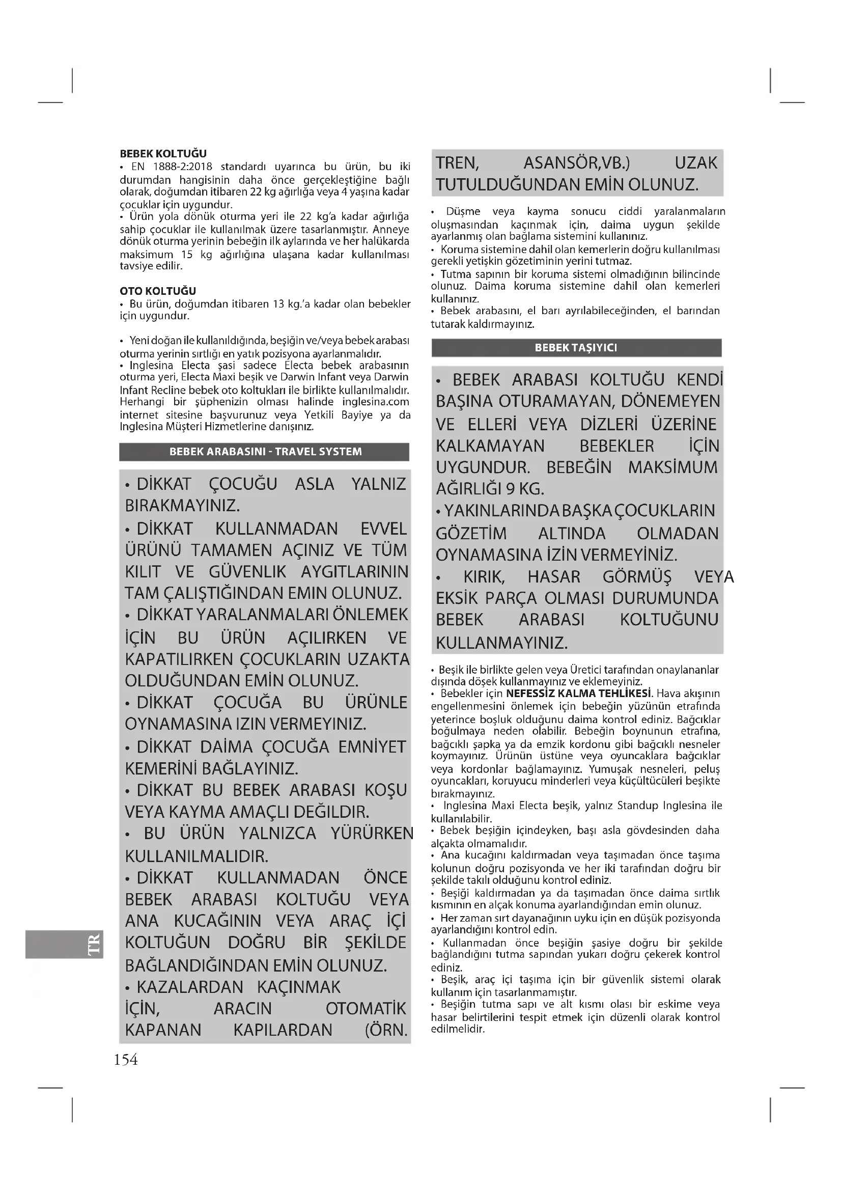 - Kullanmadan önce: - ürünün düzgün şekilde monte edildiğinden, tüm parçalarının doğru şekilde bağlandığından ve tüm mekanizmaların takıldığından emin olunuz. Astarın doğru şekilde gövdeye monte edildiğinden emin olunuz. - şasinin tamamen açık olduğundan ve tüm bağlama mekanizmalarının takılı olduğundan emin olunuz. - beşiğin, bebek arabası oturma yerinin ve bebek oto koltuğunun doğru şekilde bağlı olduğundan bunları155