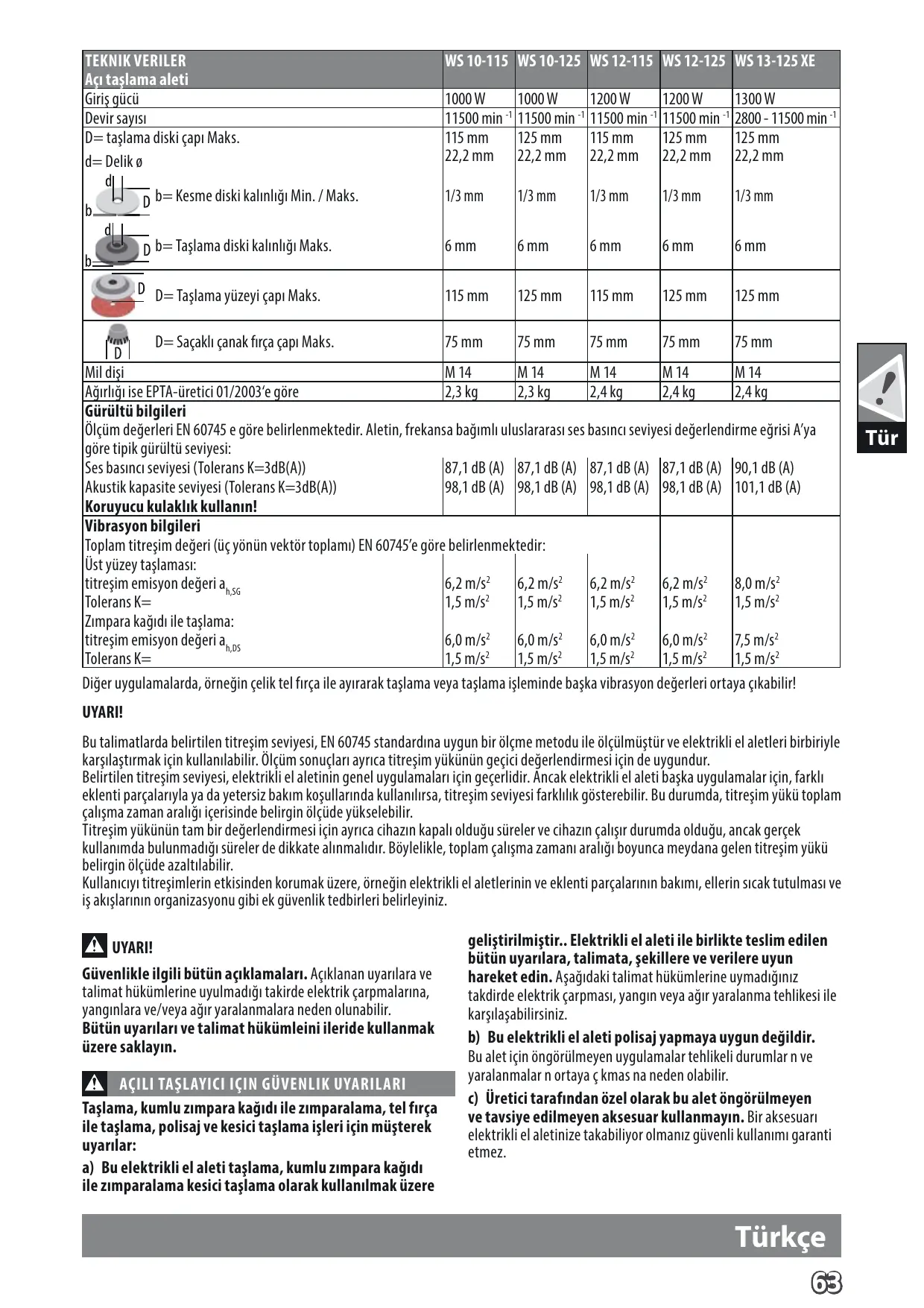 TEKNIK VERILER Açı taşlama aleti Giriş gücü Devir sayısı D= taşlama diski çapı Maks. d= Delik ø WS 10-115 WS 10-125 WS 12-115 WS 12-125 WS 13-125 XE 1000 W 1000 W 1200 W 1200 W 1300 W 11500 min -1 11500 min -1 11500 min -1 11500 min -1 2800 - 11500 min -1 115 mm 125 mm 115 mm 125 mm 125 mm 22,2 mm 22,2 mm 22,2 mm 22,2 mm 22,2 mm b= Kesme diski kalınlığı Min. / Maks. 1/3 mm 1/3 mm 1/3 mm 1/3 mm 1/3 mm b= Taşlama diski kalınlığı Maks. 6 mm 6 mm 6 mm 6 mm 6 mm D= Taşlama yüzeyi çapı Maks. 115 mm 125 mm 115 mm 125 mm 125 mm D= Saçaklı çanak fırça çapı Maks. 75 mm 75 mm 75 mm 75 mm 75 mm Mil dişi M 14 M 14 M 14 M 14 M 14 Ağırlığı ise EPTA-üretici 01/2003‘e göre 2,3 kg 2,3 kg 2,4 kg 2,4 kg 2,4 kg Gürültü bilgileri Ölçüm değerleri EN 60745 e göre belirlenmektedir. Aletin, frekansa bağımlı uluslararası ses basıncı seviyesi değerlendirme eğrisi A’ya göre tipik gürültü seviyesi: Ses basıncı seviyesi (Tolerans K=3dB(A)) 87,1 dB (A) 87,1 dB (A) 87,1 dB (A) 87,1 dB (A) 90,1 dB (A) Akustik kapasite seviyesi (Tolerans K=3dB(A)) 98,1 dB (A) 98,1 dB (A) 98,1 dB (A) 98,1 dB (A) 101,1 dB (A) Koruyucu kulaklık kullanın! Vibrasyon bilgileri Toplam titreşim değeri (üç yönün vektör toplamı) EN 60745’e göre belirlenmektedir: Üst yüzey taşlaması: titreşim emisyon değeri ah,SG 6,2 m/s2 6,2 m/s2 6,2 m/s2 6,2 m/s2 8,0 m/s2