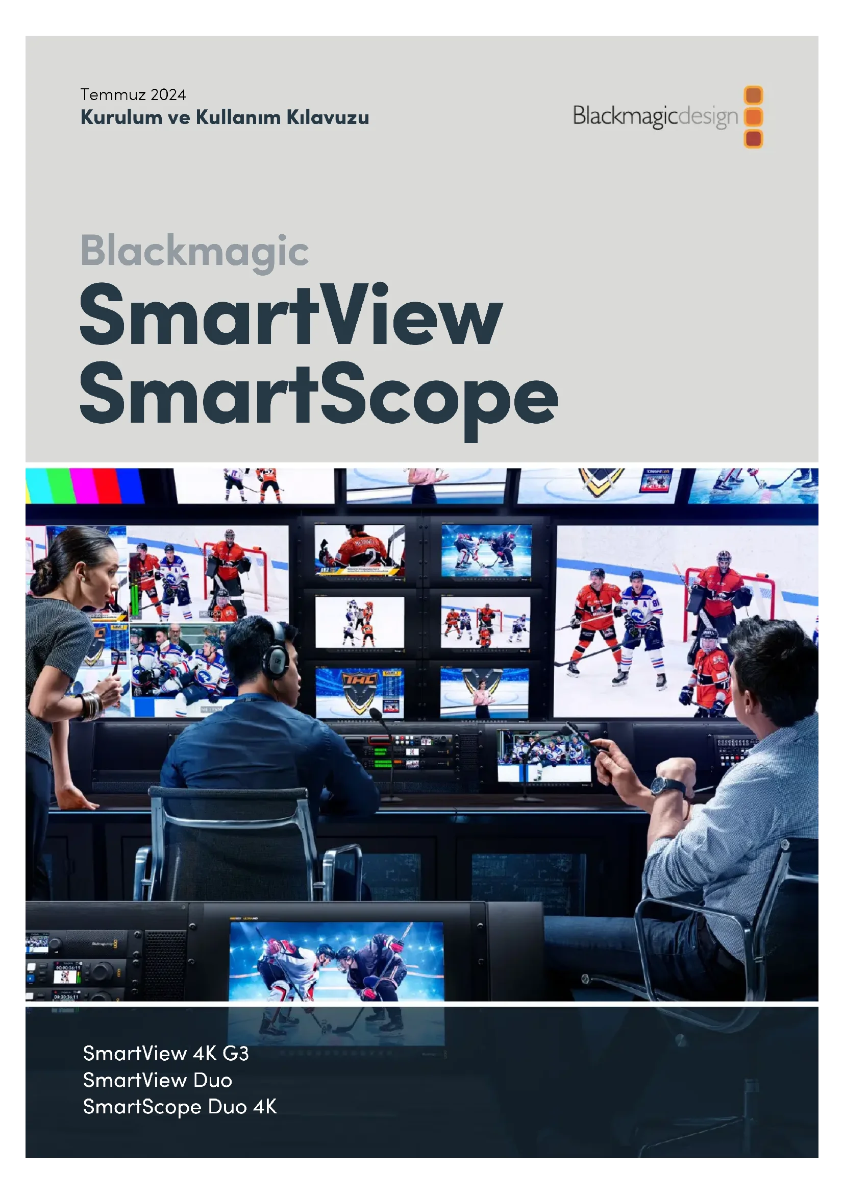 440Informações de SegurançaGarantia 12 Meses de Garantia Limitada A Blackmagic Design garante que este produto estará livre de defeitos de materiais e fabricação por um período de 12 meses a partir da data de compra. Se o produto se revelar defeituoso durante este período de garantia, a Blackmagic Design, a seu critério, consertará o produto defeituoso sem cobrança pelos componentes e mão-de-obra, ou fornecerá a substituição em troca pelo produto defeituoso. Para obter o serviço sob esta garantia você, o Consumidor, deve notificar a Blackmagic Design do defeito antes da expiração do período de garantia e tomar as providências necessárias para a execução do serviço. O Consumidor é responsável pelo empacotamento e envio do produto defeituoso para um centro de assistência designado pela Blackmagic Design com os custos de envio pré-pagos. O Consumidor é responsável pelo pagamento de todos os custos de envio, seguro, taxas, impostos e quaisquer outros custos para os produtos que nos forem devolvidos por qualquer razão. Esta garantia não se aplica a defeitos, falhas ou danos causados por uso inadequado ou manutenção e cuidado inadequado ou impróprio. A Blackmagic Design não é obrigada a fornecer serviços sob esta garantia: a) para consertar danos causados por tentativas de instalar, consertar ou fornecer assistência técnica ao produto por pessoas que não sejam representantes da Blackmagic Design, b) para consertar danos causados por uso ou conexão impróprios a equipamentos não compatíveis, c) para consertar danos ou falhas causadas pelo uso de componentes ou materiais que não são da Blackmagic Design, d) para fornecer assistência técnica de um produto que foi modificado ou integrado a outros produtos quando o efeito de tal modificação ou integração aumenta o tempo ou a dificuldade da assistência técnica do serviço. ESTA GARANTIA É FORNECIDA PELA BLACKMAGIC DESIGN NO LUGAR DE QUAISQUER OUTRAS GARANTIAS, EXPLÍCITAS OU IMPLÍCITAS. A BLACKMAGIC DESIGN E SEUS FORNECEDORES NÃO OFERECEM QUAISQUER GARANTIAS IMPLÍCITAS DE COMERCIALIZAÇÃO OU ADEQUAÇÃO A UM PROPÓSITO ESPECÍFICO. A RESPONSABILIDADE DA BLACKMAGIC DESIGN DE CONSERTAR OU SUBSTITUIR PRODUTOS DEFEITUOSOS É A ÚNICA E EXCLUSIVA MEDIDA FORNECIDA AO CONSUMIDOR PARA QUAISQUER DANOS INDIRETOS, ESPECIAIS OU INCIDENTAIS OU CONSEQUENTES INDEPENDENTEMENTE DE A BLACKMAGIC DESIGN OU O FORNECEDOR TEREM SIDO AVISADOS PREVIAMENTE SOBRE A POSSIBILIDADE DE TAIS DANOS. A BLACKMAGIC DESIGN NÃO É RESPONSÁVEL POR QUAISQUER USOS ILEGAIS DO EQUIPAMENTO PELO CONSUMIDOR. A BLACKMAGIC NÃO É RESPONSÁVEL POR QUAISQUER DANOS CAUSADOS PELO USO DESTE PRODUTO. O USUÁRIO DEVE OPERAR ESTE PRODUTO POR CONTA E RISCO PRÓPRIOS. © Direitos autorais 2024 Blackmagic Design. Todos os direitos reservados. ‘Blackmagic Design’, ‘DeckLink’, ‘HDLink’, ‘Workgroup Videohub’, ‘Multibridge Pro’, ‘Multibridge Extreme’, ‘Intensity’ e ‘Leading the creative video revolution’ são marcas comerciais registradas nos Estados Unidos e em outros países. Todos os outros nomes de empresas e produtos podem ser marcas comerciais de suas respectivas empresas com as quais elas são associadas. 441GarantiaTürkçe SmartView 4K G3 SmartView Duo SmartScope Duo 4K Temmuz 2024 Kurulum ve Kullanım Kılavuzu Blackmagic SmartView SmartScopeHoş Geldiniz! Herkesin en yüksek kalitedeki videoya erişim sağlamasını mümkün kılarak, televizyon endüstrisinin tam anlamıyla yaratıcı bir endüstri olmasına ilişkin hayalimizi paylaştığınızı umuyoruz. Video görüntüleme, bir tesisin her yerinde gereklidir. SmartView 4K G3, 15,6 inçlik yerel 4K bir LCD’ye sahip olduğundan, Ultra HD videoyu tam çözünürlükte görüntüleyebilirsiniz. Ayrıca, ayarları hızla değiştirmenize olanak veren bir kontrol paneli ve 6 raf birimi boyunda şık bir kasaya sahiptir. SmartScope Duo 4K, dalga şekli skop işlevselliği olan iki adet bağımsız 8 inç LCD’ye sahip olduğundan, video seviyelerini anında denetleyebilirsiniz. Tüm SmartView monitörleri, 3G-SDI aracılığıyla SD, HD ve 2K videoyu destekler. SmartScope Duo 4K ve SmartView 4K G3, sırasıyla 6G-SDI ve 12G-SDI üzerinden Ultra HD’yi destekler ve SmartView 4K G3, SMPTE 2110 IP ve Blackmagic IP10’u da destekler. Video görüntüleme özelliği, kutudan çıktığı gibi çalışacak şekilde tasarlanmıştır ve Blackmagic SmartView Setup yazılımımız, kullanıcıya kolay ve sezgisel bir yapılandırma aracı sunar. Bu kullanım kılavuzu, SmartView ve SmartScope cihazlarınızın kurulumu için ihtiyacınız olan tüm bilgileri içerir. Fakat IP adresleri hakkında veya bilgisayar ağlarına ilişkin bilgi sahibi değilseniz, bir teknik personelden yardım istemenizde yarar vardır. SmartView ve SmartScope cihazlarının kurulumu kolaydır fakat, kurulumunu yaptıktan sonra ayarlamanız gerekebilecek birkaç teknik seçenek vardır. Kurulumu tamamlamanızın aşağı yukarı 5 dakika sürmesini bekliyoruz. Lütfen www.blackmagicdesign.com/tr adresinden internet sitemizi ziyaret ederek, bu kılavuz ile SmartView yazılımının en son sürümlerini indirmek için destek sayfasını tıklayınız. Son olarak, yeni yazılım yayınlandığında sizi bilgilendirebilmemiz için, lütfen yazılım güncellemelerini indirirken cihazınızı kaydedin. Sürekli yeni özellikler ve geliştirmeler üzerinde çalıştığımızdan, yorumlarınızı almaktan mutluluk duyarız! Grant Petty CEO Blackmagic DesignSmartView & SmartScope İçindekiler Başlarken 445 SmartView ve SmartScope ile Tanışın 445 Video Kaynaklarının Takılması 446 Bilgisayarınızın Bağlanması 447 Blackmagic SmartView Setup Yazılımının Kullanımı 448 Blackmagic SmartView Setup Yazılımının Yüklenmesi 448 Yazılımın Güncellenmesi 449 SmartView 4K G3 Kullanımı 450 Kontrol Panel Butonları 451 Blackmagic IP10 Video Kodeği 453 SmartView Setup Yazılımı