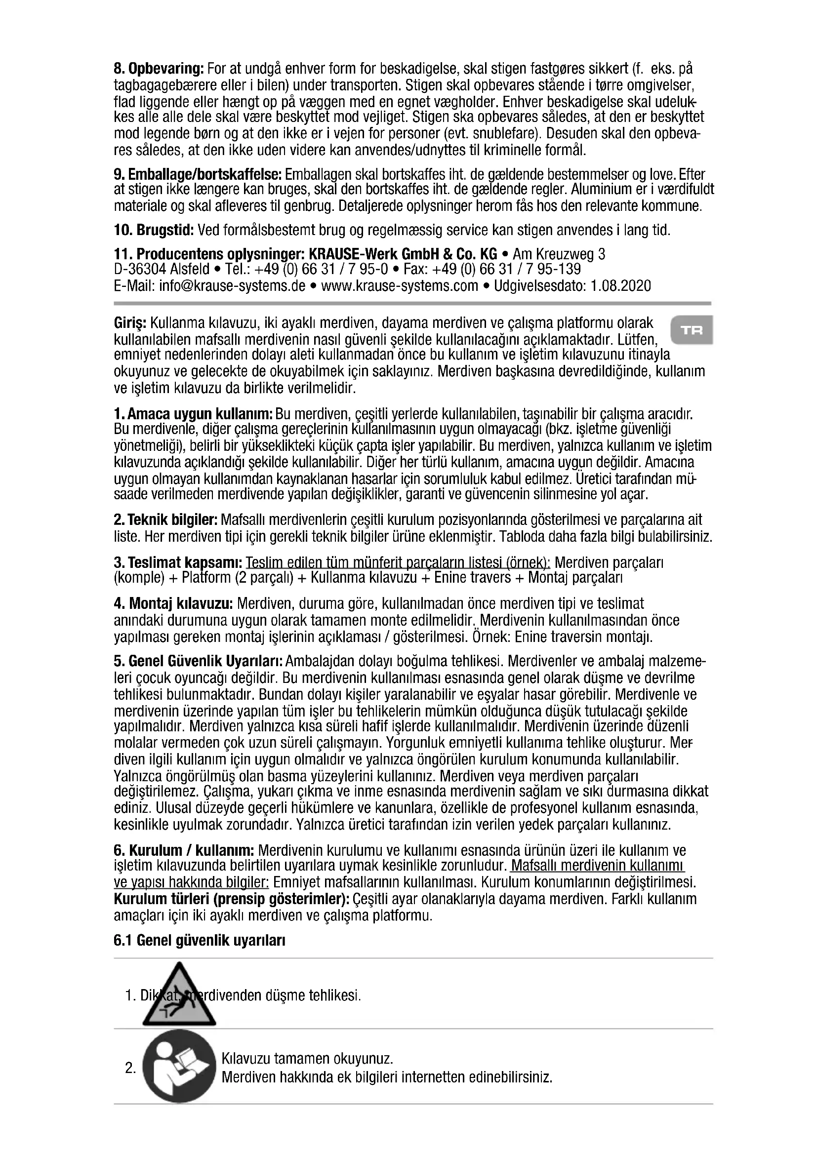 D-36304 Alsfeld • Tel.: +49 (0) 66 31 / 7 95-0 • Fax: +49 (0) 66 31 / 7 95-139 E-Mail: info@krause-systems.de • www.krause-systems.com • Udgivelsesdato: 1.08.2020 Giriş: Kullanma kılavuzu, iki ayaklı merdiven, dayama merdiven ve çalışma platformu olarak kullanılabilen mafsallı merdivenin nasıl güvenli şekilde kullanılacağını açıklamaktadır. Lütfen, emniyet nedenlerinden dolayı aleti kullanmadan önce bu kullanım ve işletim kılavuzunu itinayla okuyunuz ve gelecekte de okuyabilmek için saklayınız. Merdiven başkasına devredildiğinde, kullanım ve işletim kılavuzu da birlikte verilmelidir.