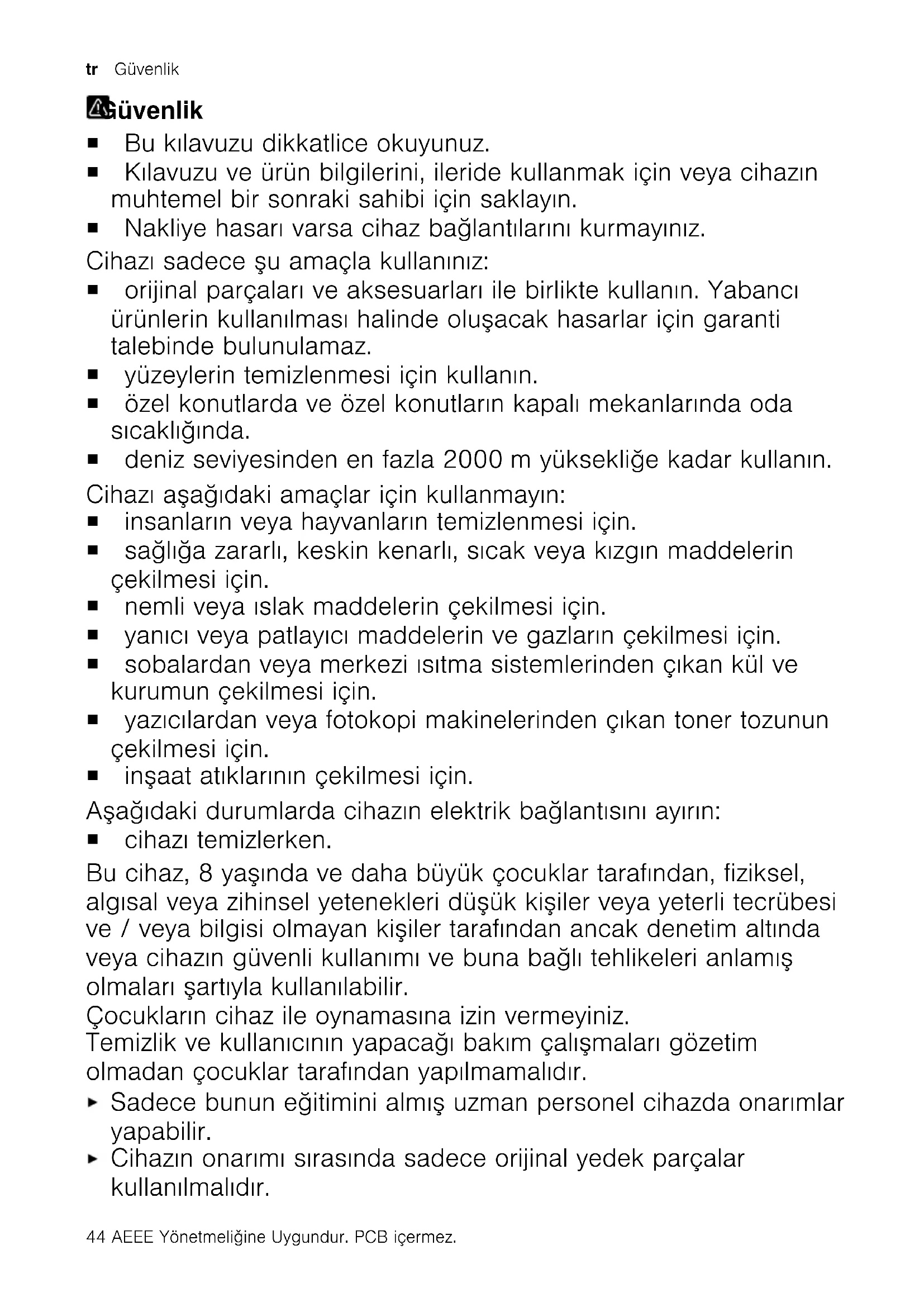 43tr Güvenlik Güvenlik Güvenlik ¡ Bu kılavuzu dikkatlice okuyunuz. ¡ Kılavuzu ve ürün bilgilerini, ileride kullanmak için veya cihazın muhtemel bir sonraki sahibi için saklayın. ¡ Nakliye hasarı varsa cihaz bağlantılarını kurmayınız. Cihazı sadece şu amaçla kullanınız: ¡ orijinal parçaları ve aksesuarları ile birlikte kullanın. Yabancı ürünlerin kullanılması halinde oluşacak hasarlar için garanti talebinde bulunulamaz. ¡ yüzeylerin temizlenmesi için kullanın. ¡ özel konutlarda ve özel konutların kapalı mekanlarında oda sıcaklığında. ¡ deniz seviyesinden en fazla 2000m yüksekliğe kadar kullanın. Cihazı aşağıdaki amaçlar için kullanmayın: ¡ insanların veya hayvanların temizlenmesi için. ¡ sağlığa zararlı, keskin kenarlı, sıcak veya kızgın maddelerin çekilmesi için. ¡ nemli veya ıslak maddelerin çekilmesi için. ¡ yanıcı veya patlayıcı maddelerin ve gazların çekilmesi için. ¡ sobalardan veya merkezi ısıtma sistemlerinden çıkan kül ve kurumun çekilmesi için. ¡ yazıcılardan veya fotokopi makinelerinden çıkan toner tozunun çekilmesi için. ¡ inşaat atıklarının çekilmesi için. Aşağıdaki durumlarda cihazın elektrik bağlantısını ayırın: ¡ cihazı temizlerken. Bu cihaz, 8 yaşında ve daha büyük çocuklar tarafından, fiziksel, algısal veya zihinsel yetenekleri düşük kişiler veya yeterli tecrübesi ve / veya bilgisi olmayan kişiler tarafından ancak denetim altında veya cihazın güvenli kullanımı ve buna bağlı tehlikeleri anlamış olmaları şartıyla kullanılabilir. Çocukların cihaz ile oynamasına izin vermeyiniz. Temizlik ve kullanıcının yapacağı bakım çalışmaları gözetim olmadan çocuklar tarafından yapılmamalıdır. Sadece bunun eğitimini almış uzman personel cihazda onarımlar yapabilir. Cihazın onarımı sırasında sadece orijinal yedek parçalar kullanılmalıdır. 44 AEEE Yönetmeliǧine Uygundur. PCB içermez.Güvenlik tr Bu cihazın elektrik kablosu zarar görmüşse tehlikenin önlenmesi için, üretici, müşteri hizmetleri veya benzer kalifikasyona sahip bir kişi tarafından değiştirilmelidir. Hasarlı cihazlar kesinlikle kullanılmamalıdır. Yüzeyi çatlamış olan veya kırık olan bir cihazı kesinlikle kullanmayın. Cihazı elektrik şebekesinden ayırmak için kesinlikle şebeke bağlantı kablosundan tutularak çekilmemelidir. Her zaman şebeke bağlantı kablosunun fişinden tutularak çekilmelidir. Cihaz şebeke bağlantı kablosundan kesinlikle çekilmemeli veya taşınmamalıdır. Cihaz veya şebeke bağlantı kablosu arızalıysa fiş derhal çekilmeli veya sigorta kutusundan sigorta kapatılmalıdır. Müşteri hizmetlerini arayınız.