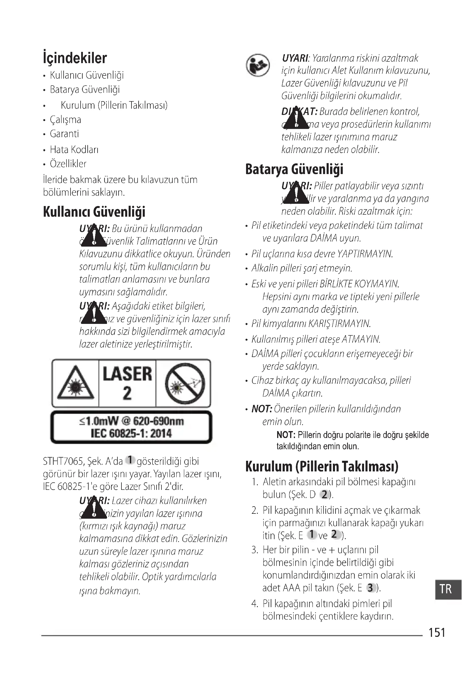 UYARI: Lazer cihazı kullanılırken gözlerinizin yayılan lazer ışınına (kırmızı ışık kaynağı) maruz kalmamasına dikkat edin. Gözlerinizin uzun süreyle lazer ışınına maruz kalması gözleriniz açısından tehlikeli olabilir. Optik yardımcılarla ışınabakmayın. UYARI: Yaralanma riskini azaltmak için kullanıcı Alet Kullanım kılavuzunu, Lazer Güvenliği kılavuzunu ve Pil Güvenliği bilgileriniokumalıdır. DIKKAT: Burada belirlenen kontrol, ayarlama veya prosedürlerin kullanımı tehlikeli lazer ışınımına maruz kalmanıza nedenolabilir. Batarya Güvenliği