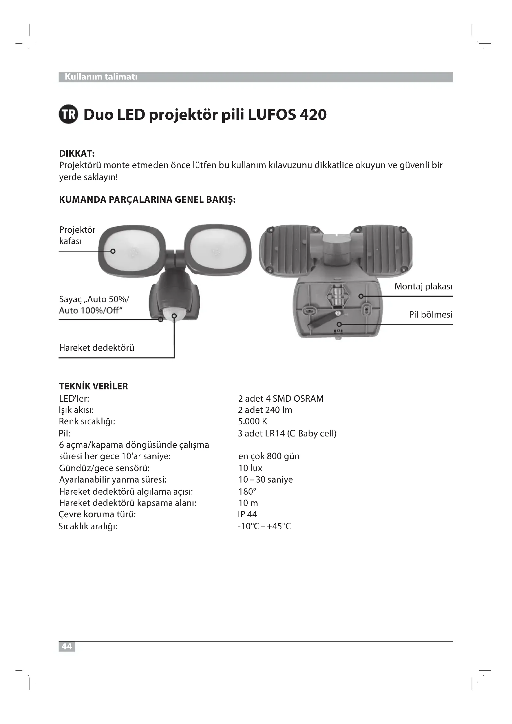 MARSO DMS 4 teda 2 :rel'DEL mI 042 teda 2 :ısıka kışI K 000.5 :ığılkacıs kneR )llec ybaB-C( 41RL teda 3 :liP 6 açma/kapama döngüsünde çalışma süresi her gece 10'ar saniye: en çok 800 gün Gündüz/gece sensörü: 10 lux Ayarlanabilir yanma süresi: 10 – 30 saniye Hareket dedektörü algılama açısı: 180° Hareket dedektörü kapsama alanı: 10 m 44 PI :ürüt amurok erveÇ C°54+ – C°01- :ığılara kılkacıS Kullanım talimatı Projektör kafası Montaj plakası Pil bölmesi Hareket dedektörü Sayaç „Auto 50%/45 Yüksek performanslı bu pilli LED projektör, kapalı ve açık alanlarda aydınlatma amacıyla ve sabit monte edilecek şekilde tasarlanmıştır. Projektör başka bir amaçla kullanılmamalıdır.