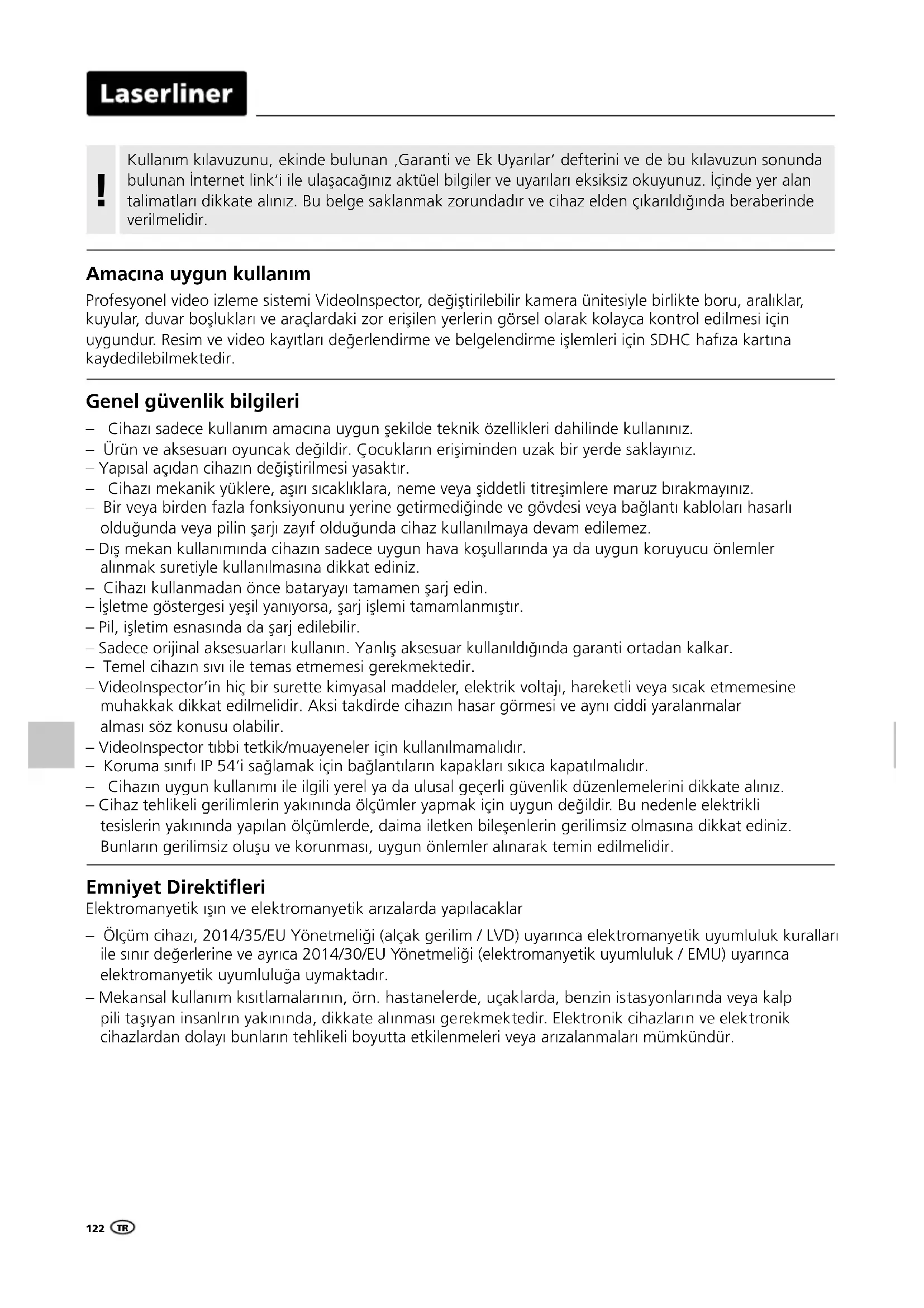 Emniyet Direktieri Elektromanyetik ışın ve elektromanyetik arızalarda yapılacaklar – Ölçüm cihazı, 2014/35/EU Yönetmeliği (alçak gerilim / LVD) uyarınca elektromanyetik uyumluluk kuralları ile sınır değerlerine ve ayrıca 2014/30/EU Yönetmeliği (elektromanyetik uyumluluk / EMU) uyarınca elektromanyetik uyumluluğa uymaktadır. – Mekansal kullanım kısıtlamalarının, örn. hastanelerde, uçaklarda, benzin istasyonlarında veya kalp pili taşıyan insanlrın yakınında, dikkate alınması gerekmektedir. Elektronik cihazların ve elektronik cihazlardan dolayı bunların tehlikeli boyutta etkilenmeleri veya arızalanmaları mümkündür. Genel güvenlik bilgileri – Cihazı sadece kullanım amacına uygun şekilde teknik özellikleri dahilinde kullanınız. – Ürün ve aksesuarı oyuncak değildir. Çocukların erişiminden uzak bir yerde saklayınız. – Yapısal açıdan cihazın değiştirilmesi yasaktır. – Cihazı mekanik yüklere, aşırı sıcaklıklara, neme veya şiddetli titreşimlere maruz bırakmayınız. – Bir veya birden fazla fonksiyonunu yerine getirmediğinde ve gövdesi veya bağlantı kabloları hasarlı olduğunda veya pilin şarjı zayıf olduğunda cihaz kullanılmaya devam edilemez. – Dış mekan kullanımında cihazın sadece uygun hava koşullarında ya da uygun koruyucu önlemler alınmak suretiyle kullanılmasına dikkat ediniz. – Cihazı kullanmadan önce bataryayı tamamen şarj edin. – İşletme göstergesi yeşil yanıyorsa, şarj işlemi tamamlanmıştır. – Pil, işletim esnasında da şarj edilebilir. – Sadece orijinal aksesuarları kullanın. Yanlış aksesuar kullanıldığında garanti ortadan kalkar. – Temel cihazın sıvı ile temas etmemesi gerekmektedir. – VideoInspector’in hiç bir surette kimyasal maddeler, elektrik voltajı, hareketli veya sıcak etmemesine muhakkak dikkat edilmelidir. Aksi takdirde cihazın hasar görmesi ve aynı ciddi yaralanmalar alması söz konusu olabilir. – VideoInspector tıbbi tetkik/muayeneler için kullanılmamalıdır. – Koruma sınıfı IP 54‘i sağlamak için bağlantıların kapakları sıkıca kapatılmalıdır. – Cihazın uygun kullanımı ile ilgili yerel ya da ulusal geçerli güvenlik düzenlemelerini dikkate alınız. – Cihaz tehlikeli gerilimlerin yakınında ölçümler yapmak için uygun değildir. Bu nedenle elektrikli tesislerin yakınında yapılan ölçümlerde, daima iletken bileşenlerin gerilimsiz olmasına dikkat ediniz. Bunların gerilimsiz oluşu ve korunması, uygun önlemler alınarak temin edilmelidir. TRTR VideoInspector
