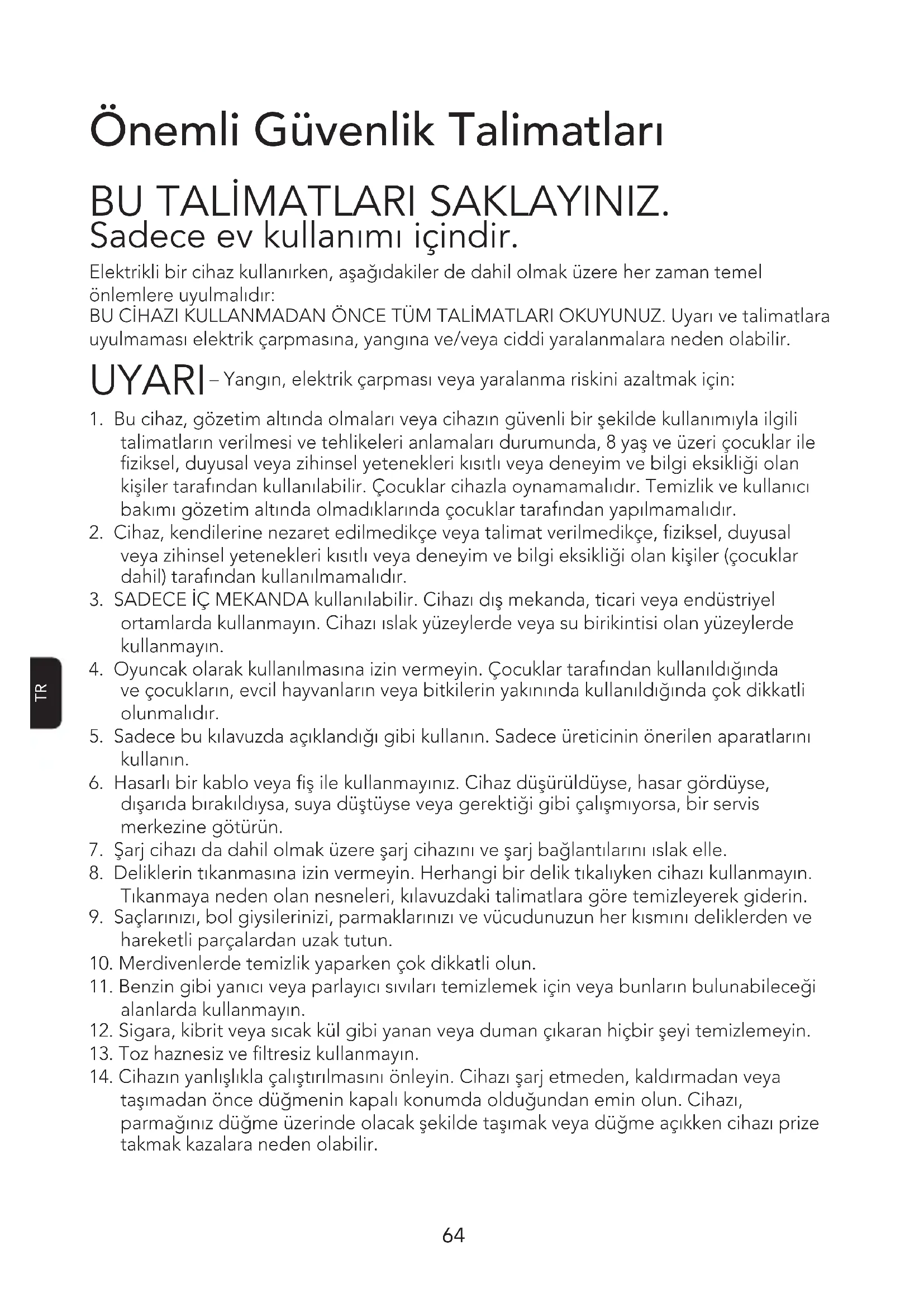 Önemli Güvenlik Talimatları BU TALİMATLARI SAKLAYINIZ. Sadece ev kullanımı içindir. Elektrikli bir cihaz kullanırken, aşağıdakiler de dahil olmak üzere her zaman temel önlemlere uyulmalıdır: BU CİHAZI KULLANMADAN ÖNCE TÜM TALİMATLARI OKUYUNUZ. Uyarı ve talimatlara uyulmaması elektrik çarpmasına, yangına ve/veya ciddi yaralanmalara neden olabilir. UYARI – Yangın, elektrik çarpması veya yaralanma riskini azaltmak için: