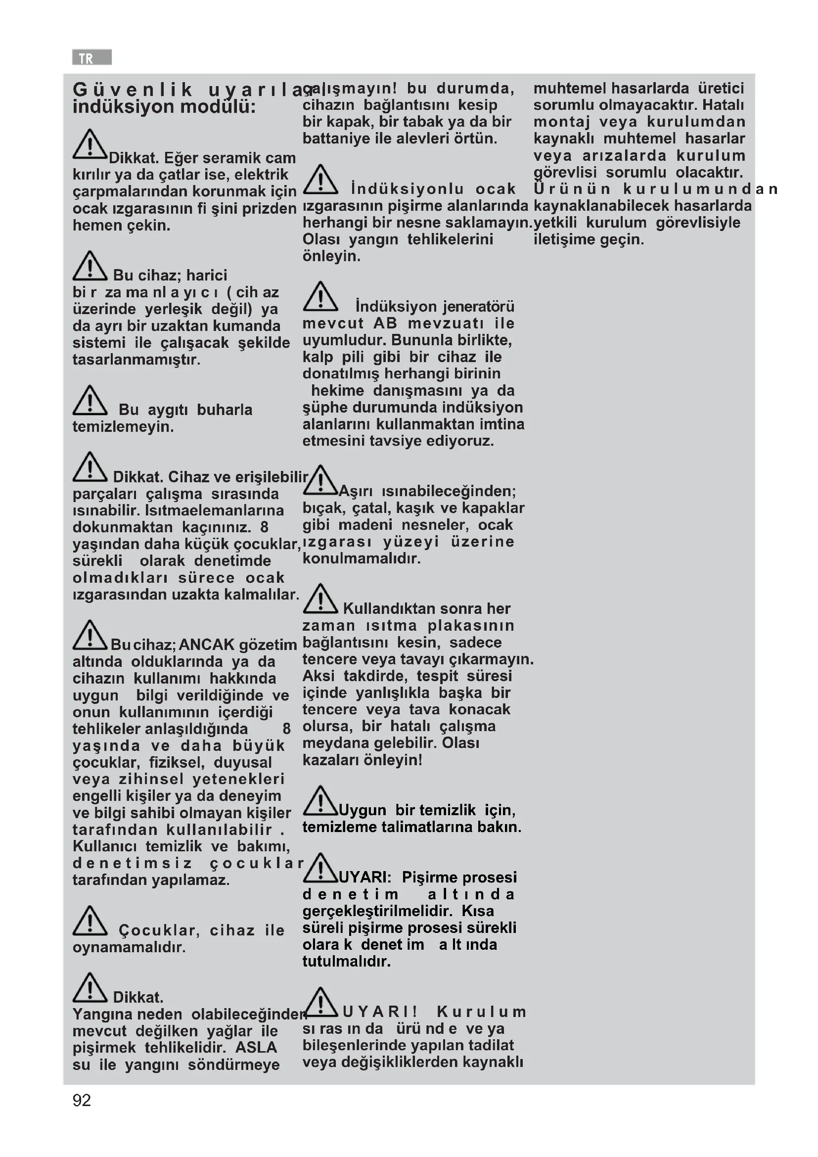 G ü v e n l i k u y a r ı l a r ı indüksiyon modülü: Dikkat. Eğer seramik cam kırılır ya da çatlar ise, elektrik çarpmalarından korunmak için ocak ızgarasının fi şini prizden hemen çekin. Bu cihaz; harici bi r za ma nl a yı c ı ( cih az üzerinde yerleşik değil) ya da ayrı bir uzaktan kumanda sistemi ile çalışacak şekilde tasarlanmamıştır. Bu aygıtı buharla temizlemeyin. Dikkat. Cihaz ve erişilebilir parçaları çalışma sırasında ısınabilir. Isıtmaelemanlarına dokunmaktan kaçınınız. 8 yaşından daha küçük çocuklar, sürekli olarak denetimde olmadıkları sürece ocak ızgarasından uzakta kalmalılar. Bu cihaz; ANCAK gözetim altında olduklarında ya da cihazın kullanımı hakkında uygun bilgi verildiğinde ve onun kullanımının içerdiği tehlikeler anlaşıldığında 8 yaşında ve daha büyük çocuklar, fiziksel, duyusal veya zihinsel yetenekleri engelli kişiler ya da deneyim ve bilgi sahibi olmayan kişiler tarafından kullanılabilir . Kullanıcı temizlik ve bakımı, d e n e t i m s i z ç o c u k l a r tarafından yapılamaz. Çocuklar, cihaz ile oynamamalıdır. Dikkat. Yangına neden olabileceğinden mevcut değilken yağlar ile pişirmek tehlikelidir. ASLA su ile yangını söndürmeye çalışmayın! bu durumda, cihazın bağlantısını kesip bir kapak, bir tabak ya da bir battaniye ile alevleri örtün. İndüksiyonlu ocak ızgarasının pişirme alanlarında herhangi bir nesne saklamayın. Olası yangın tehlikelerini önleyin. İndüksiyon jeneratörü mevcut AB mevzuatı ile uyumludur. Bununla birlikte, kalp pili gibi bir cihaz ile donatılmış herhangi birinin hekime danışmasını ya da şüphe durumunda indüksiyon alanlarını kullanmaktan imtina etmesini tavsiye ediyoruz. Aşırı ısınabileceğinden; bıçak, çatal, kaşık ve kapaklar gibi madeni nesneler, ocak ızgarası yüzeyi üzerine konulmamalıdır. Kullandıktan sonra her zaman ısıtma plakasının bağlantısını kesin, sadece tencere veya tavayı çıkarmayın. Aksi takdirde, tespit süresi içinde yanlışlıkla başka bir tencere veya tava konacak olursa, bir hatalı çalışma meydana gelebilir. Olası kazaları önleyin! Uygun bir temizlik için, temizleme talimatlarına bakın. UYARI: P&ş&rme proses& d e n e t & m a l t ı n d a gerçekleşt&r&lmel&d&r. Kısa sürel& p&ş&rme proses& sürekl& olara k denet &m a lt ında tutulmalıdır. U Y A R I ! K u r u l u m sı ras ın da ürü nd e ve ya bileşenlerinde yapılan tadilat veya değişikliklerden kaynaklı muhtemel hasarlarda üretici sorumlu olmayacaktır. Hatalı montaj veya kurulumdan kaynaklı muhtemel hasarlar veya arızalarda kurulum görevlisi sorumlu olacaktır. Ü r ü n ü n k u r u l u m u n d a n kaynaklanabilecek hasarlarda yetkili kurulum görevlisiyle iletişime geçin.93