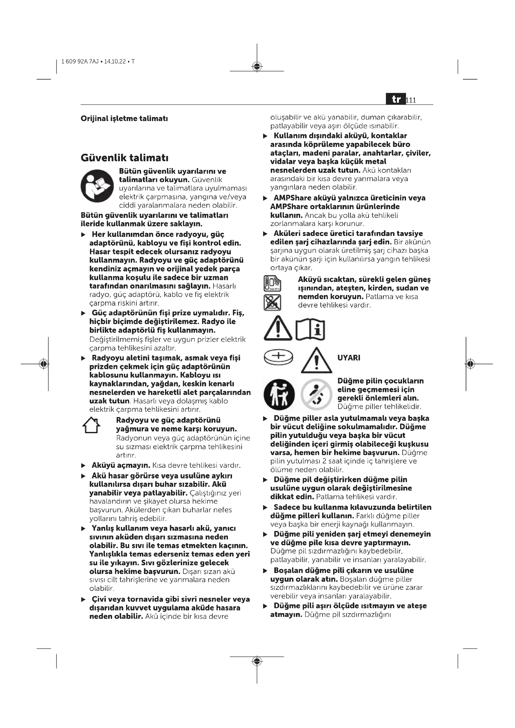 Daha fazla teknik veri şu adreste bulunabilir: https://fein.com/ecodesign Radyo enerji beslemesiTürkçe Radyo bir Lityum İyon akü(17) veya bir güç kaynağı(20) ile çalıştırılabilir. Akü ile çalışmaTürkçe u Sadece teknik veriler bölümünde belirtilen şarj cihazlarını kullanın. Sadece bu şarj cihazları radyonuzda kullanılabilen Lityum İyon aküler için tasarlanmıştır. Not: Radyonuza uygun olmayan akülerin kullanılması hatalı işlevlere veya radyoda hasara neden olabilir. Lityum iyon akü "Electronic Cell Protection (ECP)" (Elektronik Hücre Koruması) sistemi ile derin deşarja karşı korunmalıdır. Akü boşaldığında radyo bir koruma devresi üzerinden kapanır. u Koruma devresi tarafından kapatıldığında radyoyu tekrar açmayın. Aksi takdirde akü hasar görebilir. Akünün değiştirilmesiTürkçe Akü kapağının kilitleme kolunu(13) açın ve akü kapağını(12) kaldırın. Aküyü çıkarmak için akü kilit açma tuşuna(16) basın ve aküyü akü yuvasından çekerek çıkarın. Bunu yaparken güç kullanmayın. Aküyü takmak için, akü bağlantıları akü yuvasının bağlantılarına gelecek şekilde aküyü akü yuvasına(14) itin. Akünün kilitleme yapmasını sağlayın. Akü kapağını(12) kapatın ve kilitleyin. Akü şarj durumu göstergesiTürkçe Akü takıldığında, akünün(17) şarj durumunu ekranda, akü çıkarıldığı zaman, akünün üzerinde görebilirsiniz. Ekrandaki akü şarj durumu göstergesiTürkçe Akü şarj durumu göstergesi(i) yeterli gerilime sahip bir akü yerleştirildiğinde ekranda görünür, radyo güç kaynağı(20) üzerinden akım şebekesine bağlı iken görünmez. Gösterge Kapasite %80−100 %60−80 %40−60 %20−40 %5−20 %0−5 Aküdeki akü şarj durumu göstergesiTürkçe Akü radyodan çıkarıldığında şarj durumu akünün şarj durumu göstergesinin yeşil LED'leriyle gösterilir. Şarj durumunu görmek için şarj durumu göstergesi tuşları ya da üzerine basın. Şarj durumu göstergesi tuşuna basıldıktan sonra hiçbir LED yanmazsa, akü arızalı demektir ve değiştirilmesi gerekir. Akü tipi GBA 18V...Türkçe LED'ler Kapasite Sürekli ışık 3× yeşil %60−100 Sürekli ışık 2× yeşil %30−60 Sürekli ışık 1× yeşil %5−30 Yanıp sönen ışık 1× yeşil %0−5 Akü tipi ProCORE18V...Türkçe LED'ler Kapasite Sürekli ışık 5× yeşil %80−100 Sürekli ışık 4× yeşil %60−80 Sürekli ışık 3× yeşil %40−60 Sürekli ışık 2× yeşil %20−40 Sürekli ışık 1× yeşil %5−20 Yanıp sönen ışık 1× yeşil %0−5 Güç kaynağı ile çalışma (bkz.ResimA)Türkçe u Sadece teknik veriler bölümünde belirtilen soket şebeke parçalarını kullanın. Radyonun sorunsuz çalışmasını sağlamanın tek yolu budur. u Şebeke gerilimine dikkat edin! Akım kaynağının gerilimi güç kaynağının tip etiketindeki verilere uygun olmalıdır. Bağlantı bölmesinin(15) koruyucu kapağını açın. Güç kaynağının cihaz fişini(21) bağlantı soketine(22) (DCIN18V) takın. Güç kaynağını akım şebekesine bağlayın. tr 113 1 609 92A 7AJ • 14.10.22 • TCihaz fişini(21) çıkardığınız takdirde kirlenmeye karşı koruma sağlamak üzere bağlantı bölmesinin (15) koruyucu kapağını tekrar kapatın. Düğme pilin değiştirilmesiTürkçe Radyodaki saati ve diğer ayarları kaydetmek için yedek pil olarak bir düğme pil kullanılmalıdır. Radyoyu ilk kez çalıştırmadan önce, takılan düğme pilin koruyucu şeridini çıkarın. Akü kapağının kilitleme kolunu(13) açın ve akü kapağını(12) kaldırın. Gerekiyorsa aküyü(17) çıkarın. Düğme pil kapağının(18) altındaki koruyucu şeridi dışarı çekin. Radyoda saat artık kaydedilmediğinde ve ekran kararmaya başladığında düğme pili değiştirin. Bunu yapmak için düğme pilin kapağını(18) saat yönünün tersine çevirin (örn. bozuk para ile) ve kapağı çıkarın. Yeni bir düğme pil takın. Bu esnada kapağın(18) iç kısmındaki şekle bakarak doğru kutuplama yapın. Düğme pilin kapağını(18) tekrar takın ve saat hareket yönünde çevirerek sıkın. Kapak, yalnızca kapak ve kilit sembolü üzerindeki işaretler birbirine baktığında emniyetli bir şekilde kilitlenir. u Uzun süre kullanmayacaksanız düğme pili radyodan çıkarın. Radyo uzun süre kullanılmadığında düğme pil korozyona uğrar ve kendiliğinden boşalır. ÇalışmaTürkçe u Radyoyu doğrudan su temasından koruyun. Suyun radyonun içine sızması elektrik çarpması tehlikesini artırır. u Akü kapağını ve bağlantı bölmesinin koruyucu kapağını mümkün olduğunca kapalı tutun. Kapalı kapaklar radyoyu su ve tozdan korur. Ses işletimiTürkçe Açma/kapamaTürkçe Radyoyu açmak için açma/kapama düğmesine(2) basın. Ekran(1) etkinleştirilir ve radyo en son kapatıldığında ayarlanan ses kaynağı çalınır. Tuşa her bastığınızda ekran(1) birkaç saniye aydınlatılır. Radyoyu kapatmak için açma/kapama düğmesine(2) yeniden basın. Ses kaynağının geçerli ayarı kaydedilir. Enerjiden tasarruf etmek için radyoyu sadece kullanacağınız zaman açın. Ses şiddetinin ayarlanmasıTürkçe Radyo açıldığında ses şiddeti daima düşüktür. Ses şiddetini artırmak için açma/kapama düğmesini(2) saat yönünde veya azaltmak için saat yönünün tersine çevirin. Ses şiddeti ayarı<Volume> 0ile30arasında bir değerle ekranda birkaç saniye görünür. Ses şiddetini bir radyo vericisini ayarlamadan veya değiştirmeden önce düşük bir değere, harici bir ses kaynağını başlatmadan önce ise orta bir değere ayarlayın. Sesi kapatmak için sessiz düğmesine(8) kısaca basabilirsiniz. Sesi tekrar açmak için sessiz düğmesine tekrar kısaca basın veya açma/ kapama düğmesini(2) saat yönünde çevirin. Ses şiddeti herhangi bir zamanda değiştirilebilir. Menü fonksiyonu etkinleştirilirse, ses şiddet