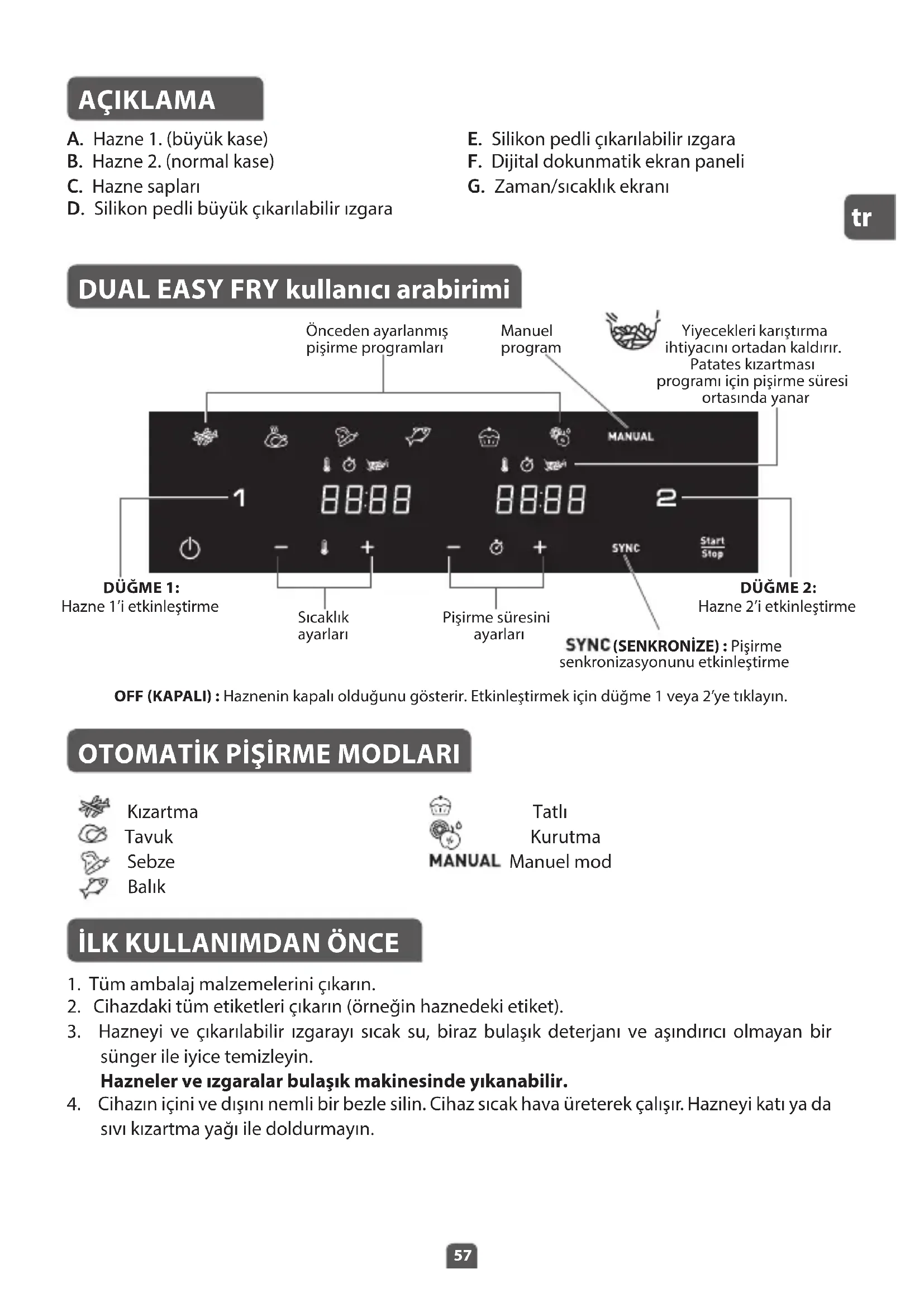 AÇIKLAMA A. Hazne 1. (büyük kase) B. Hazne 2. (normal kase) C. Hazne sapları D. Silikon pedli büyük çıkarılabilir ızgara E. Silikon pedli çıkarılabilir ızgara F. Dijital dokunmatik ekran paneli G. Zaman/sıcaklık ekranı DUAL EASY FRY kullanıcı arabirimi