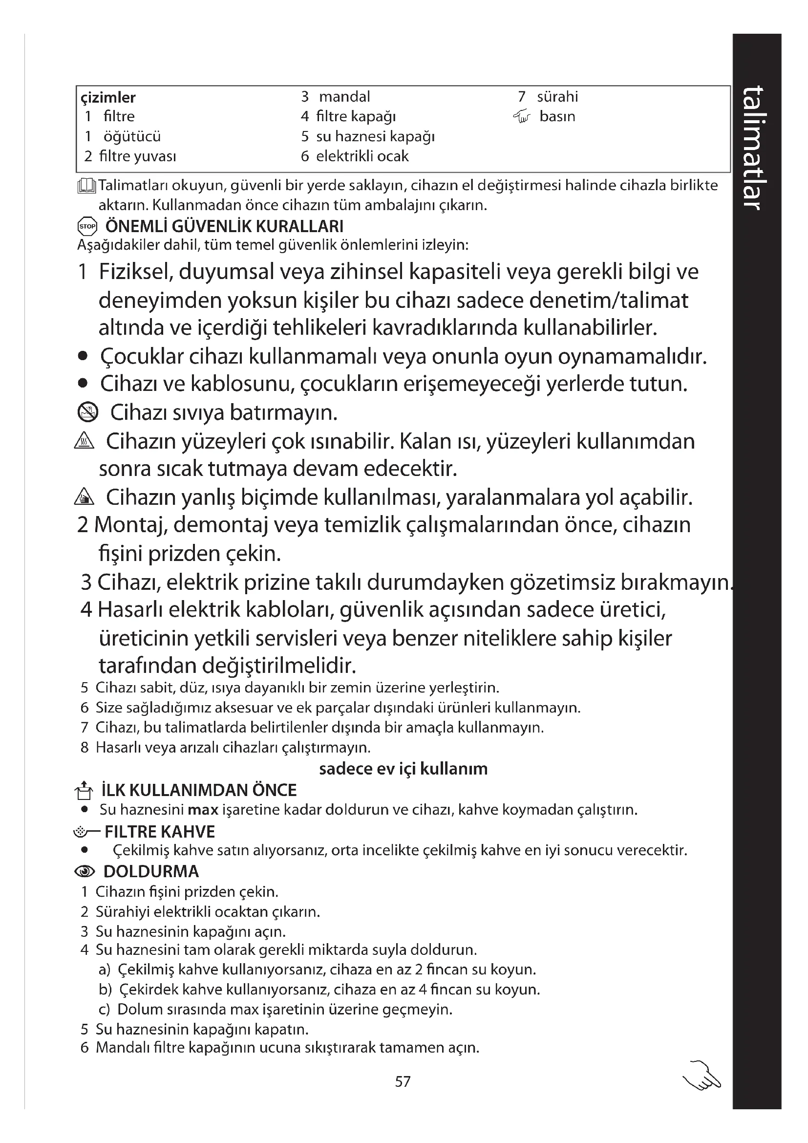 - Çekilmiş kahve satın alıyorsanız, orta incelikte çekilmiş kahve en iyi sonucu verecektir. C DOLDURMA 1 Cihazın fişini prizden çekin. 2 Sürahiyi elektrikli ocaktan çıkarın. 3 Su haznesinin kapağını açın. 4 Su haznesini tam olarak gerekli miktarda suyla doldurun. a) Çekilmiş kahve kullanıyorsanız, cihaza en az 2 fincan su koyun. b) Çekirdek kahve kullanıyorsanız, cihaza en az 4 fincan su koyun. c) Dolum sırasında max işaretinin üzerine geçmeyin. 5 Su haznesinin kapağını kapatın. 6 Mandalı filtre kapağının ucuna sıkıştırarak tamamen açın. talimatlar çizimler 1 filtre 1 öğütücü 2 filtre yuvası 3 mandal 4 filtre kapağı 5 su haznesi kapağı 6 elektrikli ocak 7 sürahi | basın58 7 Tam gereken miktarda kahveyi filtreye koyun. a) Her fincan için 1 silme yemek kaşığı çekilmiş kahve kullanın. b) Her fincan için 1 tepeleme yemek kaşığı çekirdek kahve kullanın. c) Kahve dolu yemek kaşıklarının sayısı, su dolu fincanların sayısı ile eşleşmelidir. 8 Filtre kapağını kapatın ve mandalı geçirmek için bastırın.