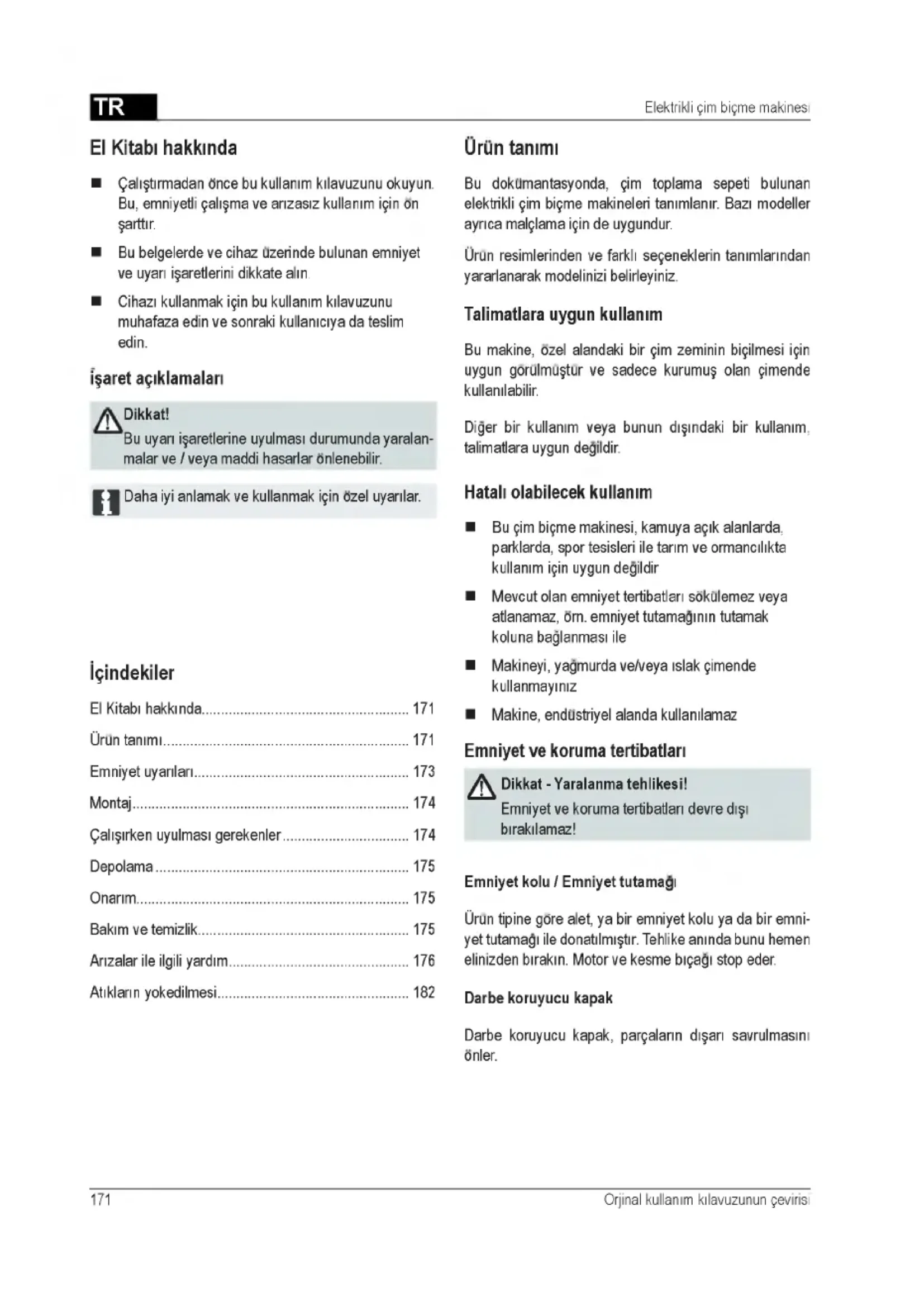 Urun tanimi Bu dokumantasyonda, gim toplama sepeti bulunan elektrikli gim bigme makineleri tanimlanir. Bazi modeller ayrica malglama igin de uygundur. Urun resimlerinden ve farkli segeneklerin tanimlarindan yararlanarak modelinizi belirleyiniz. Talimatlara uygun kullanim Bu makine, ozel alandaki bir gim zeminin bigilmesi igin uygun gorulm uftur ve sadece kurumuf olan gimende kullanilabilir Diger bir kullanim veya bunun difindaki bir kullanim, talimatlara uygun degildir Hatali olabilecek kullanim ■ Bu gim bigme makinesi, kamuya agik alanlarda, parklarda, spor tesisleri ile tarim ve ormancilikta kullanim igin uygun degildir ■ Mevcut olan em niyet tertibatlari sokulemez veya atlanam az, orn. em niyet tutamaginin tutamak koluna baglanmasi ile ■ Makineyi, yagmurda ve/veya islak gimende kullanmayiniz ■ Makine, endustriyel alanda kullanilamaz Emniyet ve koruma tertibatlari A Dikkat - Y aralanm a teh likesi! Emniyet ve koruma tertibatlari devre difi birakilamaz! Em niyet kolu / Em niyet tutam agi Urun tipine gore alet, ya bir emniyet kolu ya da bir emni- yet tutamagi ile donatilmiftir. Tehlike aninda bunu hemen elinizden birakin. Motor ve kesme bigagi stop eder. Darbe koruyucu kapak Darbe koruyucu kapak, pargalarin difari savrulmasini onler. Dikkat! Bu uyari ifaretlerine uyulmasi durumunda yaralan- malar ve / veya maddi hasarlar onlenebilir. I I Daha iyi anlam ak ve kullanmak igin ozel uyarilar.