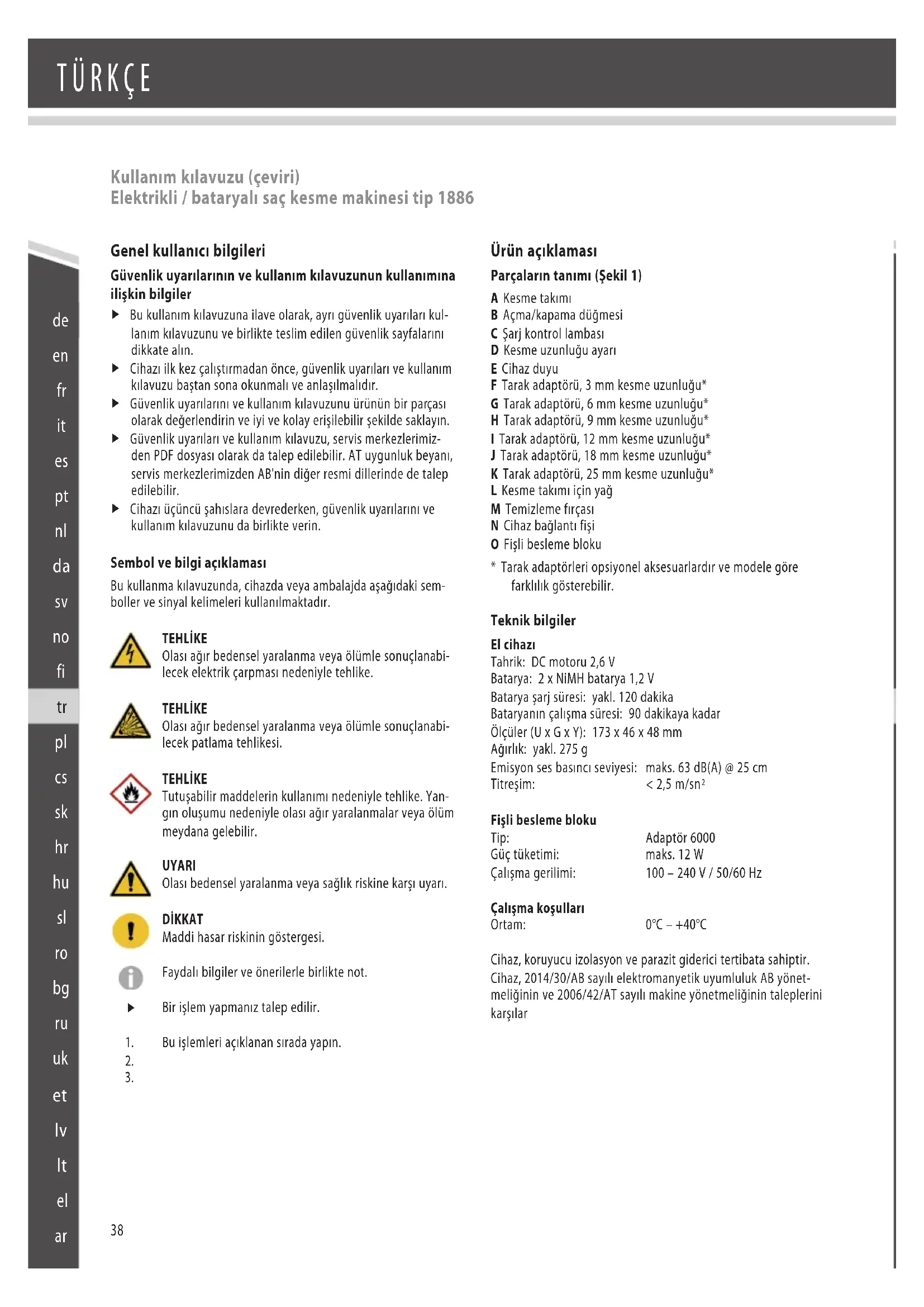 Kullanım kılavuzu (çeviri) Elektrikli / bataryalı saç kesme makinesi tip 1886 Genel kullanıcı bilgileri Güvenlik uyarılarının ve kullanım kılavuzunun kullanımına ilişkin bilgiler f Bu kullanım kılavuzuna ilave olarak, ayrı güvenlik uyarıları kul- lanım kılavuzunu ve birlikte teslim edilen güvenlik sayfalarını dikkate alın. f Cihazı ilk kez çalıştırmadan önce, güvenlik uyarıları ve kullanım kılavuzu baştan sona okunmalı ve anlaşılmalıdır. f Güvenlik uyarılarını ve kullanım kılavuzunu ürünün bir parçası olarak değerlendirin ve iyi ve kolay erişilebilir şekilde saklayın. f Güvenlik uyarıları ve kullanım kılavuzu, servis merkezlerimiz- den PDF dosyası olarak da talep edilebilir. AT uygunluk beyanı, servis merkezlerimizden AB'nin diğer resmi dillerinde de talep edilebilir. f Cihazı üçüncü şahıslara devrederken, güvenlik uyarılarını ve kullanım kılavuzunu da birlikte verin. Sembol ve bilgi açıklaması Bu kullanma kılavuzunda, cihazda veya ambalajda aşağıdaki sem- boller ve sinyal kelimeleri kullanılmaktadır. TEHLİKE Olası ağır bedensel yaralanma veya ölümle sonuçlanabi- lecek elektrik çarpması nedeniyle tehlike. TEHLİKE Olası ağır bedensel yaralanma veya ölümle sonuçlanabi- lecek patlama tehlikesi. TEHLİKE Tutuşabilir maddelerin kullanımı nedeniyle tehlike. Yan- gın oluşumu nedeniyle olası ağır yaralanmalar veya ölüm meydana gelebilir. UYARI Olası bedensel yaralanma veya sağlık riskine karşı uyarı. DİKKAT Maddi hasar riskinin göstergesi. Faydalı bilgiler ve önerilerle birlikte not. Bir işlem yapmanız talep edilir. Bu işlemleri açıklanan sırada yapın.