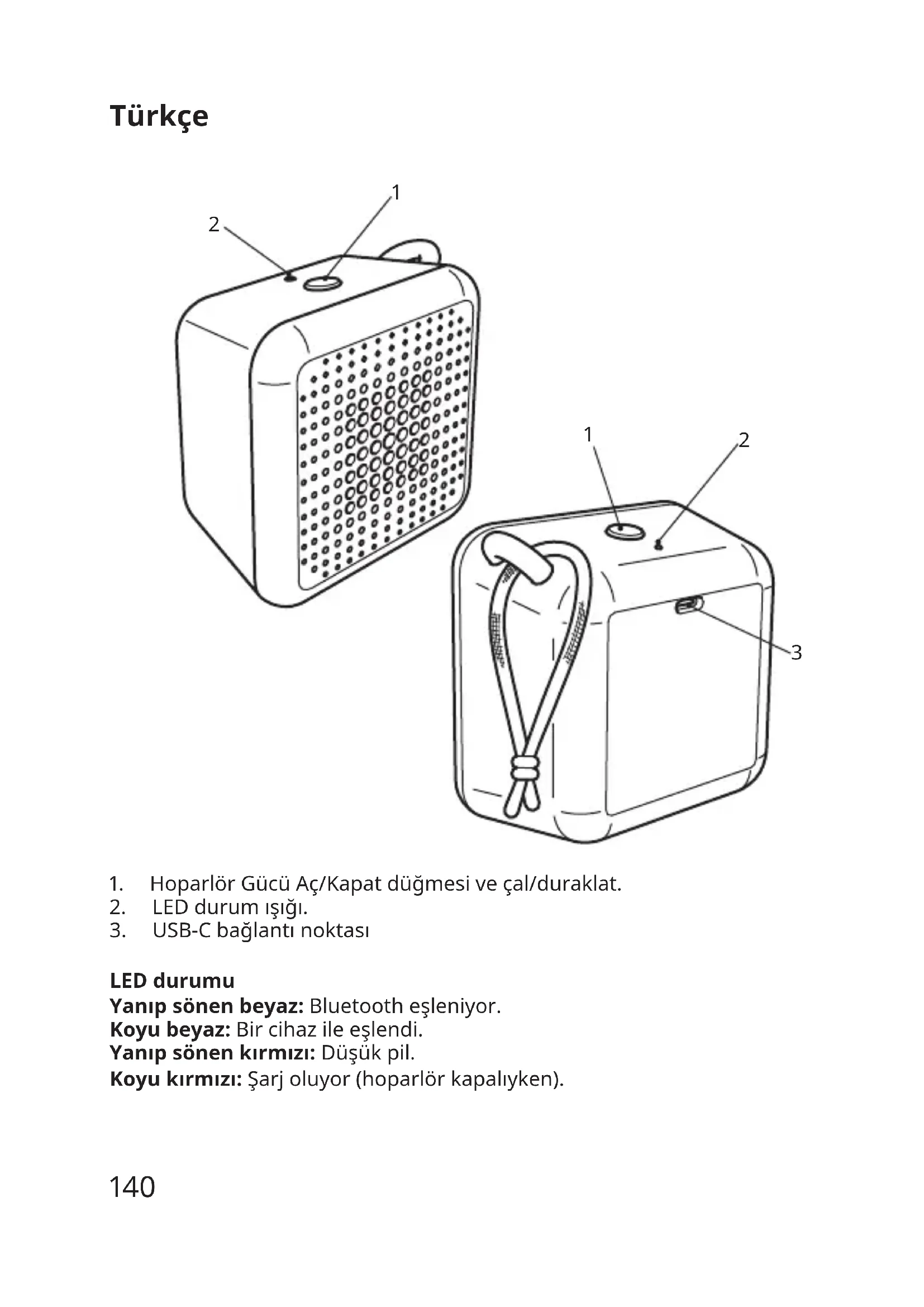 LED durumu Yanıpsönenbeyaz:Bluetootheşleniyor. Koyubeyaz:Bircihazileeşlendi. Yanıpsönenkırmızı:Düşükpil. Koyukırmızı:Şarjoluyor(hoparlörkapalıyken). Türkçe141 Başlarken Ürününüzüilkkullanımdanöncevepilinzayıadığınıbelirtmekiçin LEDherkırmızıyanıpsöndüğündeşarjetmekiçinbirUSB-Ckablosunu girişbağlantınoktasınavediğerucunubirgüçkaynağına(birbilgisayar veyabirgüçkaynağı)bağlayın.Şarjişlemisırasındahoparlörkapalıysa, LEDışıksabitkırmızırenkteyanacakvepiltamamenşarjolduğunda sönecektir. Önerilengüçkaynağı: 5,0VDC,1,0A(Dahildeğildir) Hoparlörfonksiyonları Açma/Kapatma HoparlörünüzüAçmak/KapatmakiçinGüçdüğmesine(1)basılıtutun. Çal/Duraklat Güçdüğmesinekısasürelibasıldığızamanmüzikçalarveya duraklatılır. OtomatikKapanma Hoparlörhiçbircihazileeşleştirilmemişse,5dakikasonraotomatik olarakkapanacaktır.Hoparlöreşleştirilmişseancakmüzikçalmıyorsa, 20dakikasonraotomatikolarakkapanacaktır. Bluetootheşleştirme Hoparlörünüzübirkaynakcihazlaeşleştirmekiçin,hoparlörünBluetooth eşleştirmemodundaolmasıgerekmektedir.Eşleştirmekiçinkaynak cihazınızdaBluetoothayarınıaçınve"VAPPEBYPortable"abağlanın. Hoparlör,ilkaçıldığındavedahaönceeşleştirilmişbircihaz bulunamadığındaotomatikolarakBluetootheşleştirmemodunagirer. Fabrikaayarlarınasıfırlama ÖncekiBluetootheşleştirmelerinikaldırmakiçin(1)düğmesine5 saniyedenfazlabasılıtutarakhoparlörüsıfırlayın.Başarılıfabrika ayarlarınasıfırlama,kırmızıLED'inyanıpsönmesiveişitilebilirbirsesile onaylanır. Alternatifolarak,kaynakcihazınızdakiBluetoothmenüsünegidinve eşleştirmeyikaldırın.142 Stereoeşleştirme: İkiVAPPEBYPortableünitesistereoolarakeşleştirilebilir: 1.HerikihoparlöründeBluetootharamamodundaolduğundanemin olun. 2.Hoparlörlerdenbirindekigüçdüğmesineikikezbasın.Birsesile başarılıstereoeşleştirmesionaylanacaktır. 3.Bluetootheşleştirmetalimatlarınıizleyerekkaynakcihazabağlanın. Faydalıbilgiler