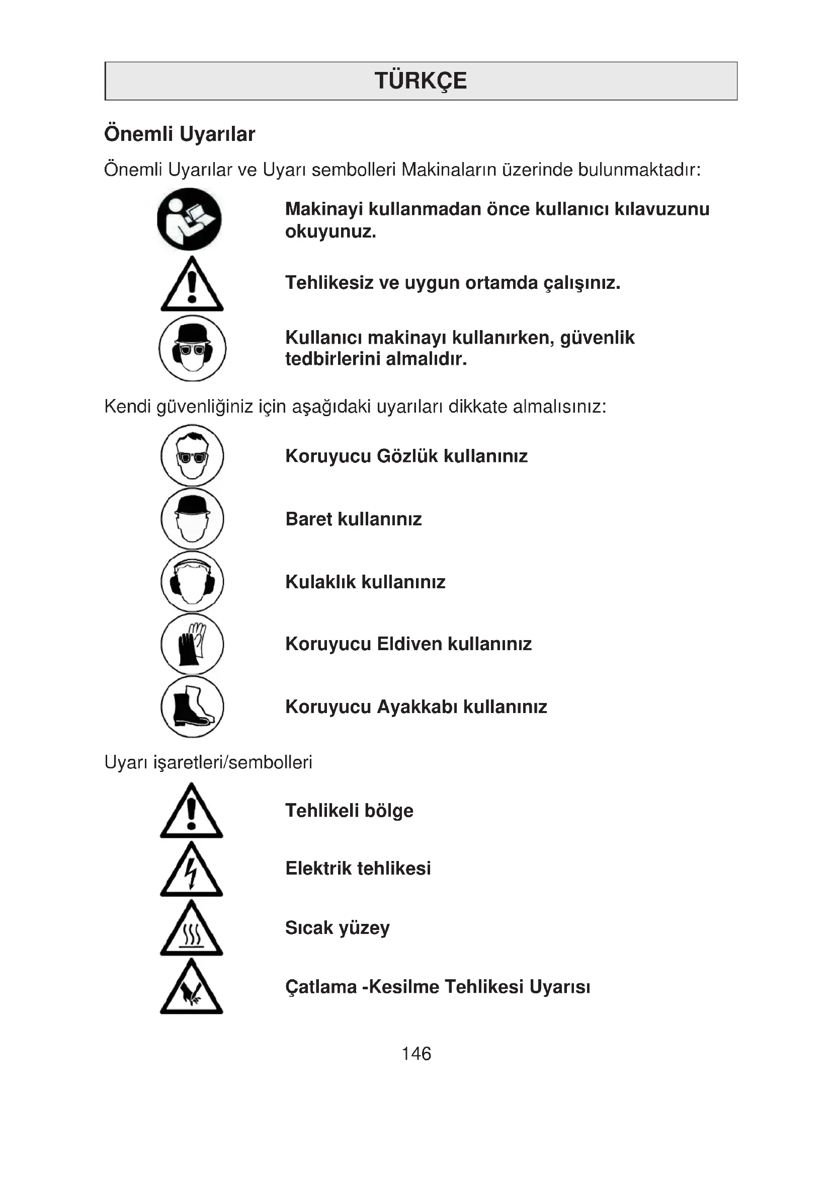 Bu makina ile güvenli ve tehlikesiz bir Aekilde çalıAmak isterseniz, dikkatle kullanım kılavuzunu okuyun ve kesinlikle onun talimatları dıAına çıkmayınız. Buna ek olarak, güvenlik talimatları broAürünü okuyunuz ve ilk kullanımdan önce bu talimatlar ile pratik yapınız. Bütün uyarıları ve talimat hükümlerini ileride kullanmak üzere saklayın.