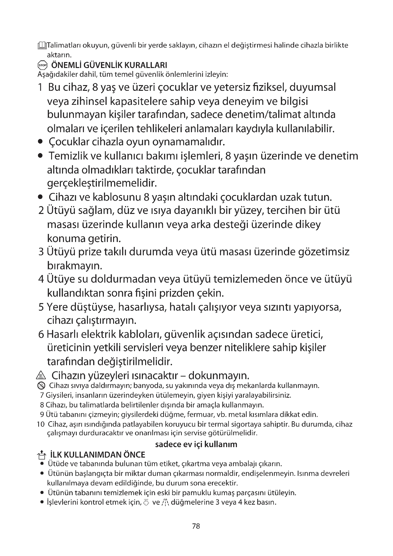 - Cihazı ve kablosunu 8 yaşın altındaki çocuklardan uzak tutun. 2 Ütüyü sağlam, düz ve ısıya dayanıklı bir yüzey, tercihen bir ütü masası üzerinde kullanın veya arka desteği üzerinde dikey konuma getirin. 3 Ütüyü prize takılı durumda veya ütü masası üzerinde gözetimsiz bırakmayın. 4 Ütüye su doldurmadan veya ütüyü temizlemeden önce ve ütüyü kullandıktan sonra fişini prizden çekin. 5 Yere düştüyse, hasarlıysa, hatalı çalışıyor veya sızıntı yapıyorsa, cihazı çalıştırmayın. 6 Hasarlı elektrik kabloları, güvenlik açısından sadece üretici, üreticinin yetkili servisleri veya benzer niteliklere sahip kişiler tarafından değiştirilmelidir. h Cihazın yüzeyleri ısınacaktır – dokunmayın. L Cihazı sıvıya daldırmayın; banyoda, su yakınında veya dış mekanlarda kullanmayın. 7 Giysileri, insanların üzerindeyken ütülemeyin, giyen kişiyi yaralayabilirsiniz. 8 Cihazı, bu talimatlarda belirtilenler dışında bir amaçla kullanmayın. 9 Ütü tabanını çizmeyin; giysilerdeki düğme, fermuar, vb. metal kısımlara dikkat edin. 10 Cihaz, aşırı ısındığında patlayabilen koruyucu bir termal sigortaya sahiptir. Bu durumda, cihaz çalışmayı durduracaktır ve onarılması için servise götürülmelidir. sadece ev içi kullanım