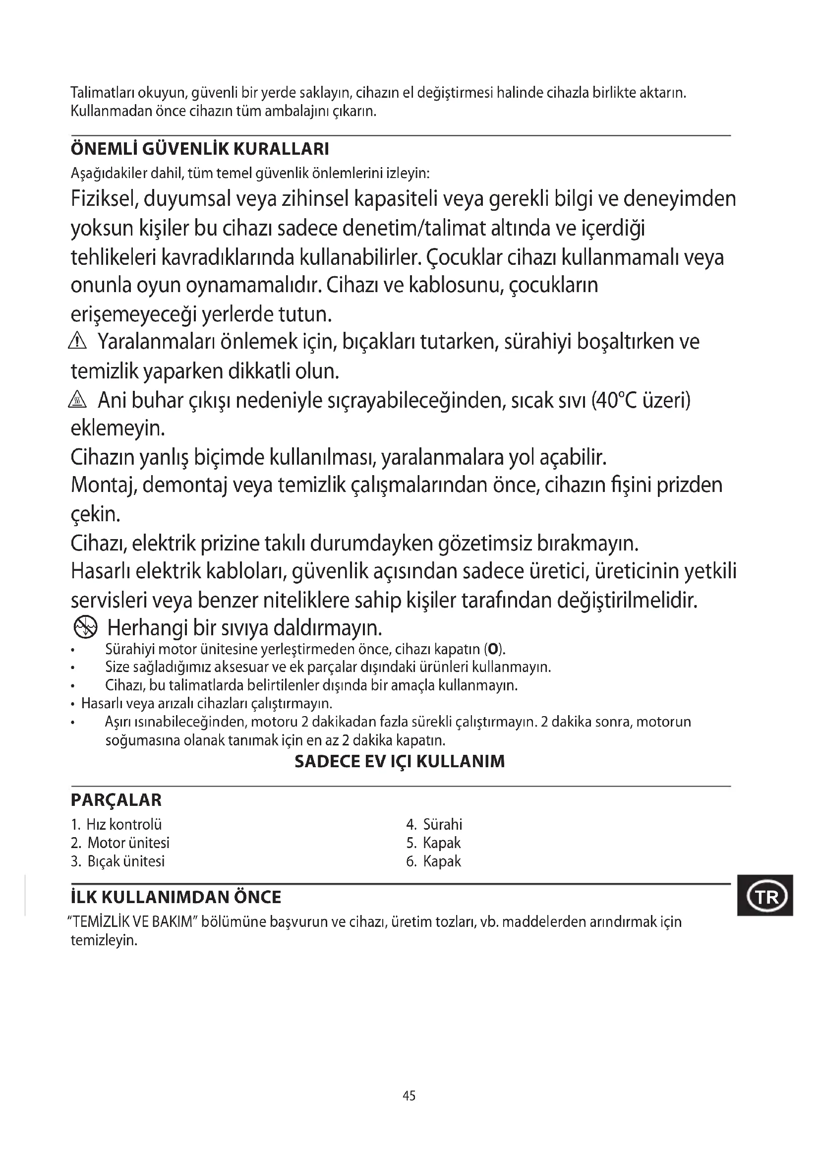 Aşağıdakiler dahil, tüm temel güvenlik önlemlerini izleyin: Fiziksel, duyumsal veya zihinsel kapasiteli veya gerekli bilgi ve deneyimden yoksun kişiler bu cihazı sadece denetim/talimat altında ve içerdiği tehlikeleri kavradıklarında kullanabilirler. Çocuklar cihazı kullanmamalı veya onunla oyun oynamamalıdır. Cihazı ve kablosunu, çocukların erişemeyeceği yerlerde tutun. c Yaralanmaları önlemek için, bıçakları tutarken, sürahiyi boşaltırken ve temizlik yaparken dikkatli olun. h Ani buhar çıkışı nedeniyle sıçrayabileceğinden, sıcak sıvı (40°C üzeri) eklemeyin. Cihazın yanlış biçimde kullanılması, yaralanmalara yol açabilir. Montaj, demontaj veya temizlik çalışmalarından önce, cihazın fişini prizden çekin. Cihazı, elektrik prizine takılı durumdayken gözetimsiz bırakmayın. Hasarlı elektrik kabloları, güvenlik açısından sadece üretici, üreticinin yetkili servisleri veya benzer niteliklere sahip kişiler tarafından değiştirilmelidir.