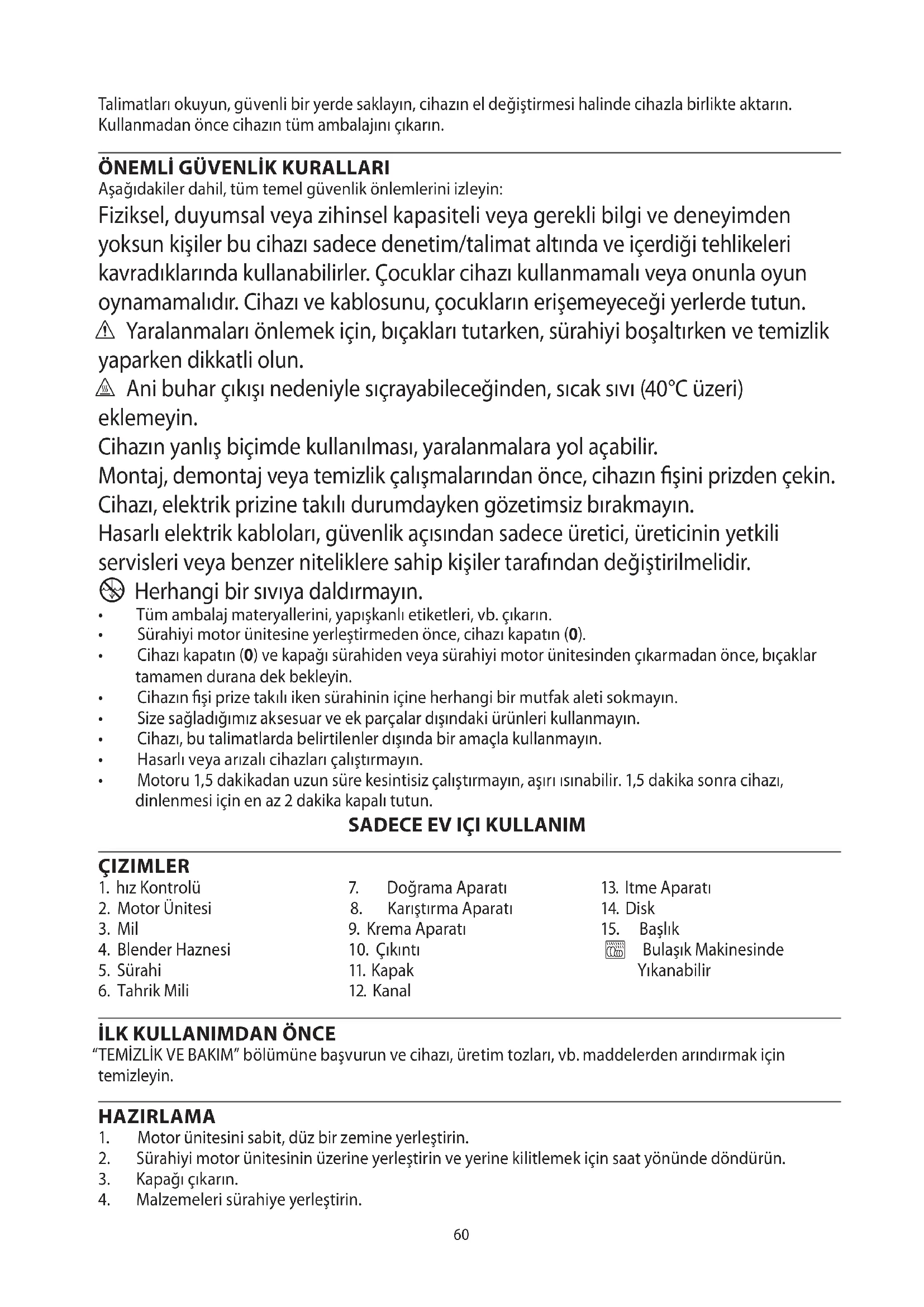 Aşağıdakiler dahil, tüm temel güvenlik önlemlerini izleyin: Fiziksel, duyumsal veya zihinsel kapasiteli veya gerekli bilgi ve deneyimden yoksun kişiler bu cihazı sadece denetim/talimat altında ve içerdiği tehlikeleri kavradıklarında kullanabilirler. Çocuklar cihazı kullanmamalı veya onunla oyun oynamamalıdır. Cihazı ve kablosunu, çocukların erişemeyeceği yerlerde tutun. c Yaralanmaları önlemek için, bıçakları tutarken, sürahiyi boşaltırken ve temizlik yaparken dikkatli olun. h Ani buhar çıkışı nedeniyle sıçrayabileceğinden, sıcak sıvı (40°C üzeri) eklemeyin. Cihazın yanlış biçimde kullanılması, yaralanmalara yol açabilir. Montaj, demontaj veya temizlik çalışmalarından önce, cihazın fişini prizden çekin. Cihazı, elektrik prizine takılı durumdayken gözetimsiz bırakmayın. Hasarlı elektrik kabloları, güvenlik açısından sadece üretici, üreticinin yetkili servisleri veya benzer niteliklere sahip kişiler tarafından değiştirilmelidir.