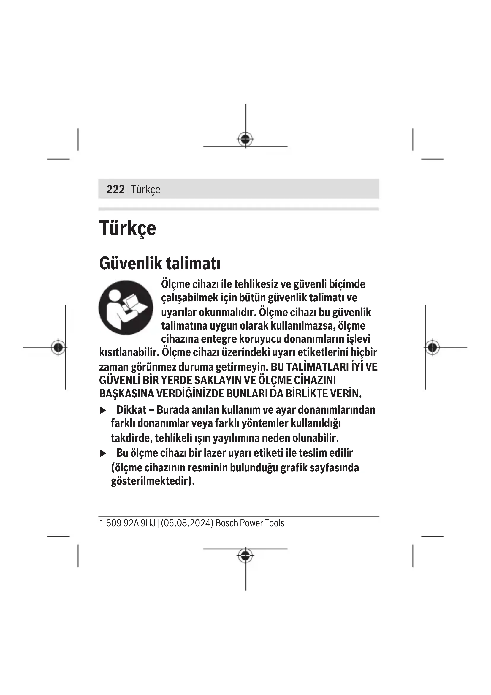 Εάν οι παλαιές ηλεκτρικές και ηλεκτρονικές συσκευές απορρίπτο- νται με ακατάλληλο τρόπο, μπορεί να έχουν επιβλαβείς επιπτώσεις στο περιβάλλον και την ανθρώπινη υγεία λόγω της πιθανής παρουσί- ας επικίνδυνων ουσιών. Bosch Power Tools 1 609 92A 9HJ | (05.08.2024)222 | Türkçe Türkçe Güvenlik talimatı Ölçme cihazı ile tehlikesiz ve güvenli biçimde çalışabilmek için bütün güvenlik talimatı ve uyarılar okunmalıdır. Ölçme cihazı bu güvenlik talimatına uygun olarak kullanılmazsa, ölçme cihazına entegre koruyucu donanımların işlevi kısıtlanabilir. Ölçme cihazı üzerindeki uyarı etiketlerini hiçbir zaman görünmez duruma getirmeyin. BU TALİMATLARI İYİ VE GÜVENLİ BİR YERDE SAKLAYIN VE ÖLÇME CİHAZINI BAŞKASINA VERDİĞİNİZDE BUNLARI DA BİRLİKTE VERİN. u Dikkat – Burada anılan kullanım ve ayar donanımlarından farklı donanımlar veya farklı yöntemler kullanıldığı takdirde, tehlikeli ışın yayılımına neden olunabilir. u Bu ölçme cihazı bir lazer uyarı etiketi ile teslim edilir (ölçme cihazının resminin bulunduğu grafik sayfasında gösterilmektedir). 1 609 92A 9HJ | (05.08.2024) Bosch Power ToolsTürkçe | 223 u Lazer uyarı etiketindeki metin kendi dilinizde değilse, ilk kullanımdan önce cihaz ekinde teslim edilen kendi dilinizdeki lazer uyarı etiketini mevcut lazer uyarı etiketi üzerine yapıştırın. Lazer ışınını başkalarına veya hayvanlara doğrultmayın ve doğrudan gelen veya yansıyan lazer ışınına bakmayın. Aksi takdirde başkalarının gözünü kamaştırabilir, kazalara neden olabilir veya gözlerde hasara neden olabilirsiniz. u Lazer ışını gözünüze gelecek olursa gözlerinizi bilinçli olarak kapatın ve hemen başınızı başka tarafa çevirin. u Lazer donanımında hiçbir değişiklik yapmayın. u Lazer gözlüğünü (aksesuar) koruyucu gözlük olarak kullanmayın. Lazer gözlüğü lazer ışınının daha iyi görülmesini sağlar, ancak lazer ışınına karşı koruma sağlamaz. u Lazer gözlüğünü (aksesuar) güneş gözlüğü olarak veya trafikte kullanmayın. Lazer gözlüğü kızılötesi ışınlara karşı tam bir koruma sağlamaz ve renk algılama performansını düşürür. Bosch Power Tools 1 609 92A 9HJ | (05.08.2024)224 | Türkçe u Ölçme cihazının sadece kalifiye uzman personel tarafından ve orijinal yedek parçalarla onarılmasını sağlayın. Bu sayede ölçme cihazının güvenliğini sağlarsınız. u Çocukların kontrolünüz dışında lazerli ölçme cihazını kullanmasına izin vermeyin. İstemeden de olsa kendi gözlerinizin veya başkalarının gözlerinin kamaşmasına neden olabilirsiniz. u Ölçme cihazı ile içinde yanıcı sıvılar, gazlar veya tozlar bulunan patlama riski bulunan ortamlarda çalışmayın. Ölçme cihazı içinde tozu veya buharları tutuşturabilecek kıvılcımlar oluşabilir. Mıknatısı, implantlara ve kalp pili veya insülin pompası gibi özel tıbbi cihazlara yaklaştırmayın. Mıknatıs,implantların ve tıbbi cihazların fonksiyonlarını olumsuz yönde etkileyebilecek bir alan oluşturur. u Ölçüm aletini manyetik veri taşıyıcılarından ve manyetik açıdan duyarlı cihazlardan uzak tutun. Mıknatısların etkisi ile geri dönüşü mümkün olmayan veri kayıpları ortaya çıkabilir. 1 609 92A 9HJ | (05.08.2024) Bosch Power ToolsTürkçe | 225 Ürün ve performans açıklaması Lütfen kullanım kılavuzunun ön kısmındaki resimlere dikkat edin. Usulüne uygun kullanım Bu ölçme cihazı yatay ve dikey çizgilerin belirlenmesi ve kontrol edilmesi için tasarlanmıştır. Bu ölçüm aleti, iç mekanlardaki kullanımlara uygundur. Bu ürün, EN50689'a uygun bir tüketici lazer ürünüdür. Şekli gösterilen elemanlar Şekli gösterilen elemanların numaraları ile grafik sayfasındaki ölçme cihazı resmindeki numaralar aynıdır. (1) Çizgisel mod için lazer çıkış deliği (2) Çalışma modu seçimli açma/kapama şalteri (3) Konum göstergesi (4) Yatay hizalama su terazisi (5) Dikey hizalama su terazisi (6) Noktasal işletim lazer çıkış deliği Bosch Power Tools 1 609 92A 9HJ | (05.08.2024)226 | Türkçe (7) Pil haznesi kapağı kilidi (8) Pil haznesi kapağı (9) Mıknatıs (10) Lazer uyarı etiketi (11) Seri numarası (12) Dayama yüzeyi (alüminyum) (13) Tutucu (14) Tutucunun döner tablası (15) Tutucunun manyetik tutucusu (16) Tripod