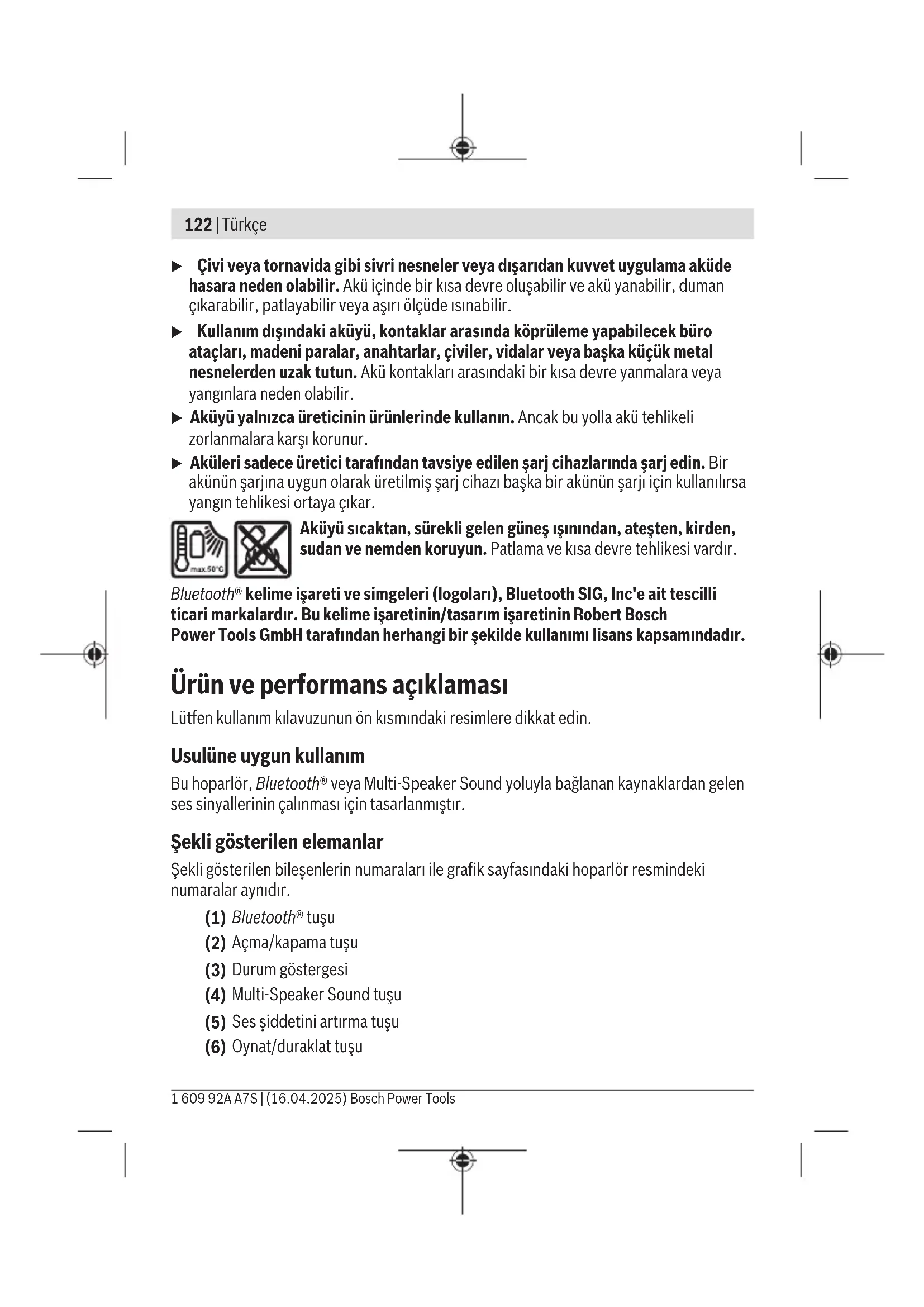 Οι ηλεκτρικές συσκευές, οι επαναφορτιζόμενες μπαταρίες/μπαταρίες, τα εξαρτήματα και οι συσκευασίες πρέπει να ανακυκλώνονται με τρόπο φιλικό προς το περιβάλλον. 1 609 92A A7S | (16.04.2025) Bosch Power ToolsTürkçe | 121 Μην ρίχνετε τις ηλεκτρικές συσκευές και τις επαναφορτιζόμενες μπαταρίες/μπα- ταρίες στα οικιακά απορρίμματα! Μόνο για χώρες τηςΕΕ: Τα ηλεκτρικά και ηλεκτρονικά εργαλεία ή οι μεταχειρισμένες επαναφορτιζόμενες μπαταρί- ες/μπαταρίες που δε χρησιμοποιούνται πλέον, πρέπει να συλλέγονται ξεχωριστά και να απο- σύρονται με τρόπο φιλικό στο περιβάλλον. Χρησιμοποιείτε τα καθορισμένα συστήματα συλ- λογής. Η λανθασμένη απόσυρση μπορεί να είναι επιβλαβής για το περιβάλλον και την υγεία λόγω των επικίνδυνων ουσιών που ενδεχομένως περιέχει. Türkçe Güvenlik talimatı Bütün güvenlik talimatını ve uyarıları okuyun. Güvenlik talimatlarına ve uyarılara uyulmadığı takdirde elektrik çarpmasına, yangına ve/veya ciddi yaralanmalara neden olunabilir. Bütün uyarıları ve talimat hükümlerini ileride kullanmak üzere saklayın. u Her kullanımdan önce hoparlörü kontrol edin. Hasar tespit edecek olursanız kullanmayın. Hoparlörün içini kendiniz açmayın ve aletin kalifiye uzman personel tarafından, orijinal yedek parça kullanma koşulu ile onarılmasını sağlayın. Hasarlı hoparlör elektrik çarpma tehlikesini artırır. u Uzun süreli kullanım için hoparlörü orta ses şiddetine ayarlayın. Uzun süre yüksek ses şiddeti işitme hasarına yol açabilir. u Aküyü değiştirmeyin veya açmayın. Kısa devre tehlikesi vardır. u Akü hasar görürse veya usulüne aykırı kullanılırsa dışarı buhar sızabilir. Akü yanabilir veya patlayabilir. Çalıştığınız yeri havalandırın ve şikayet olursa hekime başvurun. Akülerden çıkan buharlar nefes yollarını tahriş edebilir. u Yanlış kullanım veya hasarlı akü, yanıcı sıvının aküden dışarı sızmasına neden olabilir. Bu sıvı ile temas etmekten kaçının. Yanlışlıkla temas ederseniz temas eden yeri su ile yıkayın. Sıvı gözlerinize gelecek olursa hekime başvurun. Dışarı sızan akü sıvısı cilt tahrişlerine ve yanmalara neden olabilir. Bosch Power Tools 1 609 92A A7S | (16.04.2025)122 | Türkçe u Çivi veya tornavida gibi sivri nesneler veya dışarıdan kuvvet uygulama aküde hasara neden olabilir. Akü içinde bir kısa devre oluşabilir ve akü yanabilir, duman çıkarabilir, patlayabilir veya aşırı ölçüde ısınabilir. u Kullanım dışındaki aküyü, kontaklar arasında köprüleme yapabilecek büro ataçları, madeni paralar, anahtarlar, çiviler, vidalar veya başka küçük metal nesnelerden uzak tutun. Akü kontakları arasındaki bir kısa devre yanmalara veya yangınlara neden olabilir. u Aküyü yalnızca üreticinin ürünlerinde kullanın. Ancak bu yolla akü tehlikeli zorlanmalara karşı korunur. u Aküleri sadece üretici tarafından tavsiye edilen şarj cihazlarında şarj edin. Bir akünün şarjına uygun olarak üretilmiş şarj cihazı başka bir akünün şarjı için kullanılırsa yangın tehlikesi ortaya çıkar. Aküyü sıcaktan, sürekli gelen güneş ışınından, ateşten, kirden, sudan ve nemden koruyun. Patlama ve kısa devre tehlikesi vardır. Bluetooth® kelime işareti ve simgeleri (logoları), Bluetooth SIG, Inc'e ait tescilli ticari markalardır. Bu kelime işaretinin/tasarım işaretinin RobertBosch PowerToolsGmbH tarafından herhangi bir şekilde kullanımı lisans kapsamındadır. Ürün ve performans açıklaması Lütfen kullanım kılavuzunun ön kısmındaki resimlere dikkat edin. Usulüne uygun kullanım Bu hoparlör, Bluetooth® veya Multi-Speaker Sound yoluyla bağlanan kaynaklardan gelen ses sinyallerinin çalınması için tasarlanmıştır. Şekli gösterilen elemanlar Şekli gösterilen bileşenlerin numaraları ile grafik sayfasındaki hoparlör resmindeki numaralar aynıdır. (1) Bluetooth® tuşu (2) Açma/kapama tuşu (3) Durum göstergesi (4) Multi-Speaker Sound tuşu (5) Ses şiddetini artırma tuşu (6) Oynat/duraklat tuşu 1 609 92A A7S | (16.04.2025) Bosch Power ToolsTürkçe | 123 (7) Ses şiddetini azaltma tuşu (8) Taşıma sapı (9) Hoparlör (10) Akü muhafazası kilitleme kolu