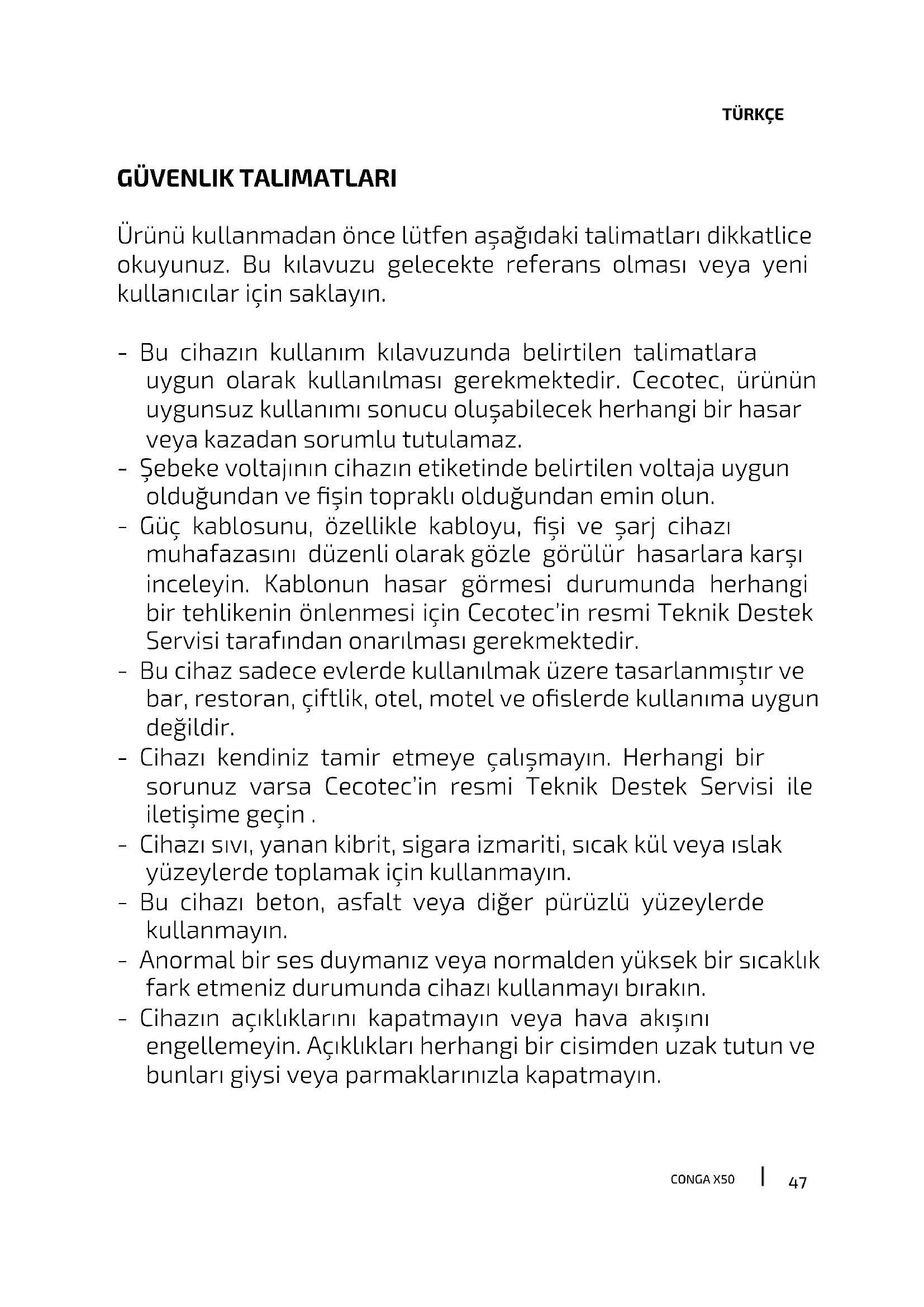 Ürünü kullanmadan önce lütfen aşağıdaki talimatları dikkatlice okuyunuz. Bu kılavuzu gelecekte referans olması veya yeni kullanıcılar için saklayın. - Bu cihazın kullanım kılavuzunda belirtilen talimatlara uygun olarak kullanılması gerekmektedir. Cecotec, ürünün uygunsuz kullanımı sonucu oluşabilecek herhangi bir hasar veya kazadan sorumlu tutulamaz. - Şebeke voltajının cihazın etiketinde belirtilen voltaja uygun olduğundan ve şin topraklı olduğundan emin olun. - Güç kablosunu, özellikle kabloyu, şi ve şarj cihazı muhafazasını düzenli olarak gözle görülür hasarlara karşı inceleyin. Kablonun hasar görmesi durumunda herhangi bir tehlikenin önlenmesi için Cecotec’in resmi Teknik Destek Servisi tarafından onarılması gerekmektedir. - Bu cihaz sadece evlerde kullanılmak üzere tasarlanmıştır ve bar, restoran, çiftlik, otel, motel ve oslerde kullanıma uygun değildir. - Cihazı kendiniz tamir etmeye çalışmayın. Herhangi bir sorunuz varsa Cecotec’in resmi Teknik Destek Servisi ile iletişime geçin . - Cihazı sıvı, yanan kibrit, sigara izmariti, sıcak kül veya ıslak yüzeylerde toplamak için kullanmayın. - Bu cihazı beton, asfalt veya diğer pürüzlü yüzeylerde kullanmayın. - Anormal bir ses duymanız veya normalden yüksek bir sıcaklık fark etmeniz durumunda cihazı kullanmayı bırakın. - Cihazın açıklıklarını kapatmayın veya hava akışını engellemeyin. Açıklıkları herhangi bir cisimden uzak tutun ve bunları giysi veya parmaklarınızla kapatmayın.48 CONGA X50